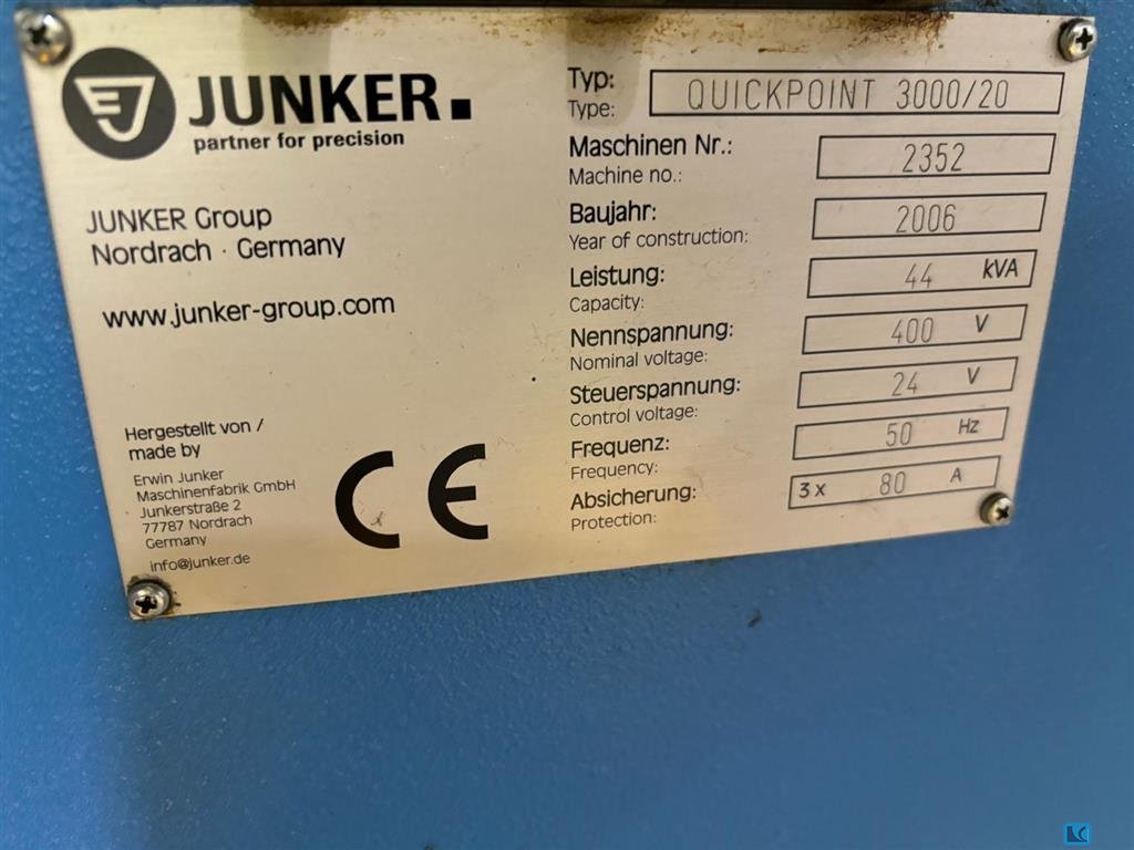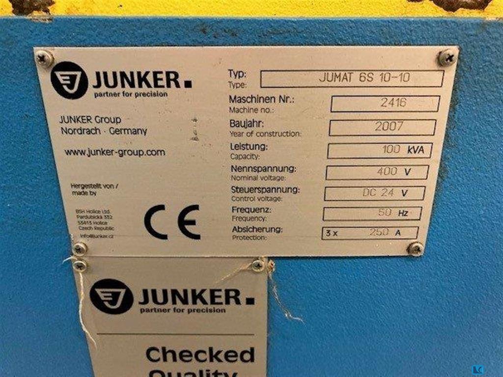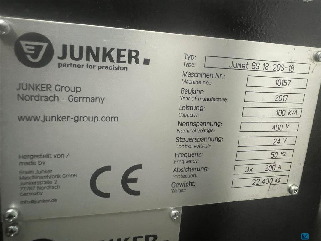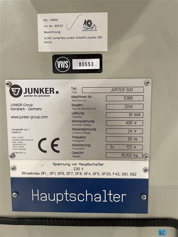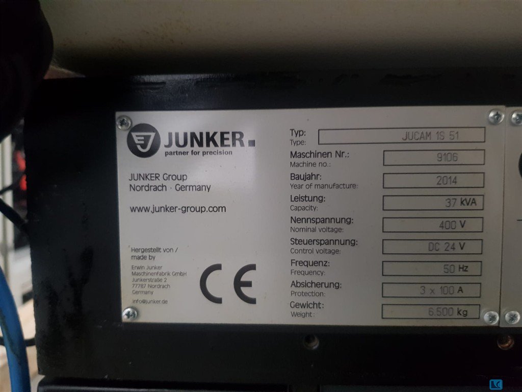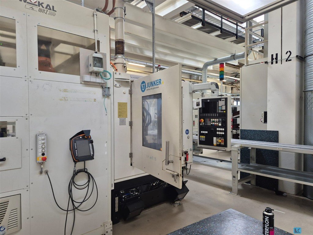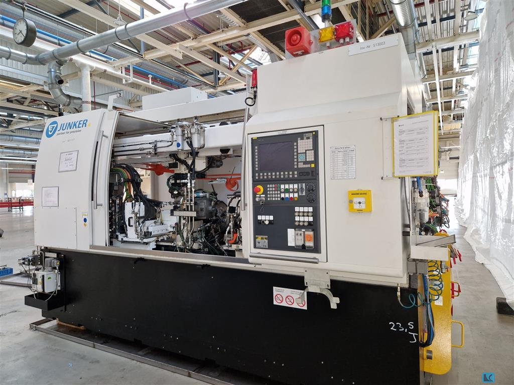 2019 yılında elden geçirilmiş bir Junker CNC silindirik taşlama makinesi mevcuttur. Taşlama uzunluğu: 150 mm, merkez yüksekliği: 100 mm, iş parçası ağırlığı: 5kg, taşlama çapı: 500 mm, yörünge çapı: 80 mm, taşlama taşı çapı: 400 mm. Makine boyutları X/Y/Z: yaklaşık 2850mm/1450mm/2000mm, ağırlık: yaklaşık 2000kg, kontrol: Siemens Sinumerik. BKW chiller, 6500l konteynerli Knoll VL 1000/4000 soğutma yağı sistemi ve Hyfra endüstriyel yeniden soğutucu dahil. Belgeler mevcut. Yerinde inceleme mümkündür.
