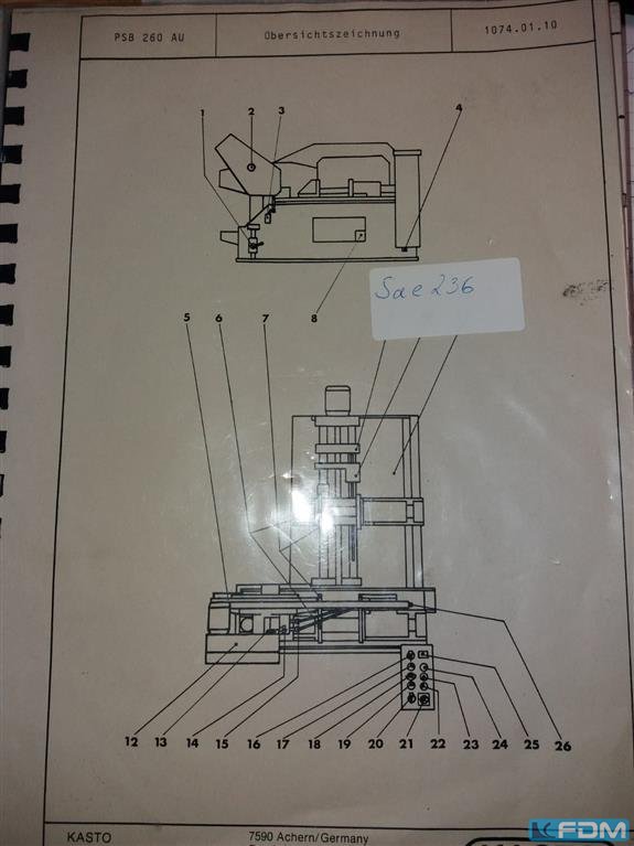 cutting speed: 15 - 125 m/min cross cutting section: 260 mm² band length: 4.115 x 41 x 1,1 mm cutting width: 260 x 260 mm Band Saw | KASTO - SSB 260 VA The machine is in a well-maintained condition. Please note that the technical details were added from comparable machines. - - - - - - - - - - - - - - - - - - - - - - - - - - - - - - - - - - - - - - - - #Tags: SSB260VA | SSB-260VA | SSB260 VA | SSB 260VA The data for this ad was created with ModulMWS - the software solution of LogoTech oHG.