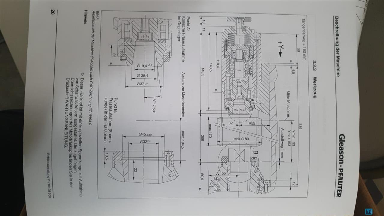 cone distance min./max.: 0-108 mm Pitch angle min/max: 5°/84° Control: GE Fanuc Series 0-GC Pitch diameter (1:1 ratio): 152 mm pitch diameter (10:1 ratio): 216 mm Diametral pitch (finest/coarsest): 1.3/8.5 Mod. Face width gear wheel max.: 35 mm Knife spindle - Speed range: 41-121 U/min working spindle speed range: 0-33.33 U/min weight: 9025 kg dimensions of the machine ca.: 2707 x 2720 x 2200 mmxmmxmm Equipment/accessories: -Knife -Chip conveyor -Technical documentation The data for this ad was created with ModulMWS - the software solution of LogoTech oHG.