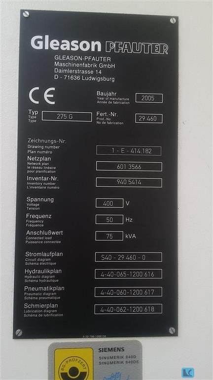 max. wheel diameter:275 mm gear width: mm max. module: weight of the machine ca.:9,4 t dimensions of the machine ca.:3,7 x 3 x 2,82 m min. number of teeth:5 max. number of teeth:2000 range of tooth size:20 mm max. gear width (internal machining):58 mm X-axis:325 mm y-axis:350 mm Z-axis:475 mm Bevel gear milling machine Gleason Pfauter including Promot Automation