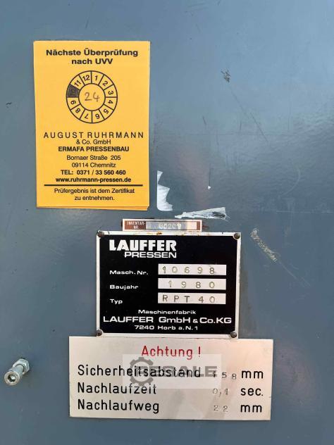 Üretici firma: Lauffer Modeli: 400 T Üretim Yılı: 1992 Makine Tipi: Hidrolik Pres - sütun kılavuzlu, ancak (kalıp yastığı olmadan) - Kontaktör kontrolü - Dijital pozisyon ölçüm sistemi, Teknik veri Baskı Kuvveti: 4000 kN Geri Dönüş Kuvveti: 340 kN - Ram Darbesi: 500 mm - Montaj Yüksekliği (Merdane/Ram): 1100 mm - Kolon Boşluğu (Ön/Yan): 1200 mm / - - Tabla Boyutu: 1200 × 800 mm - Masa Üzerindeki T Yuvaları (DIN 650): 22 H11 mm - Tabla Yüksekliği: 850 mm - RAM Yüzeyi: 1200 × 800 mm² - Ram üzerindeki T-Yuvaları (DIN 650): 22 H11 mm - Tahrik Gücü: 76 kW İşletme Basıncı: 290