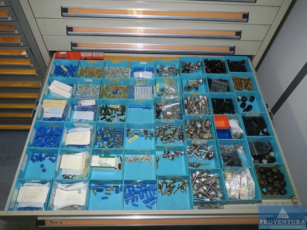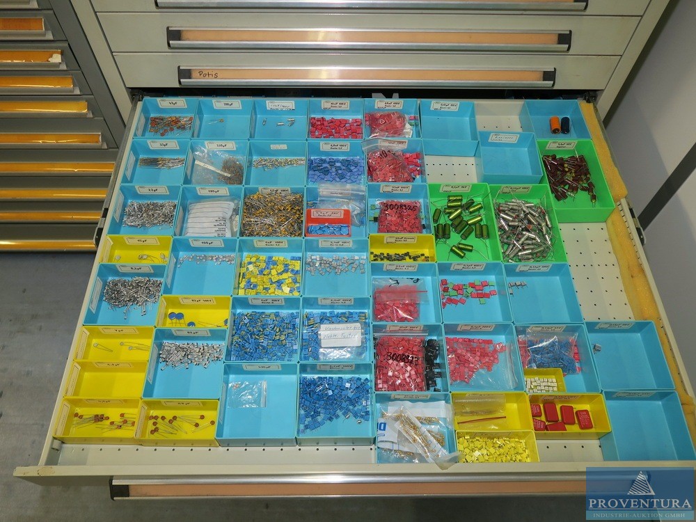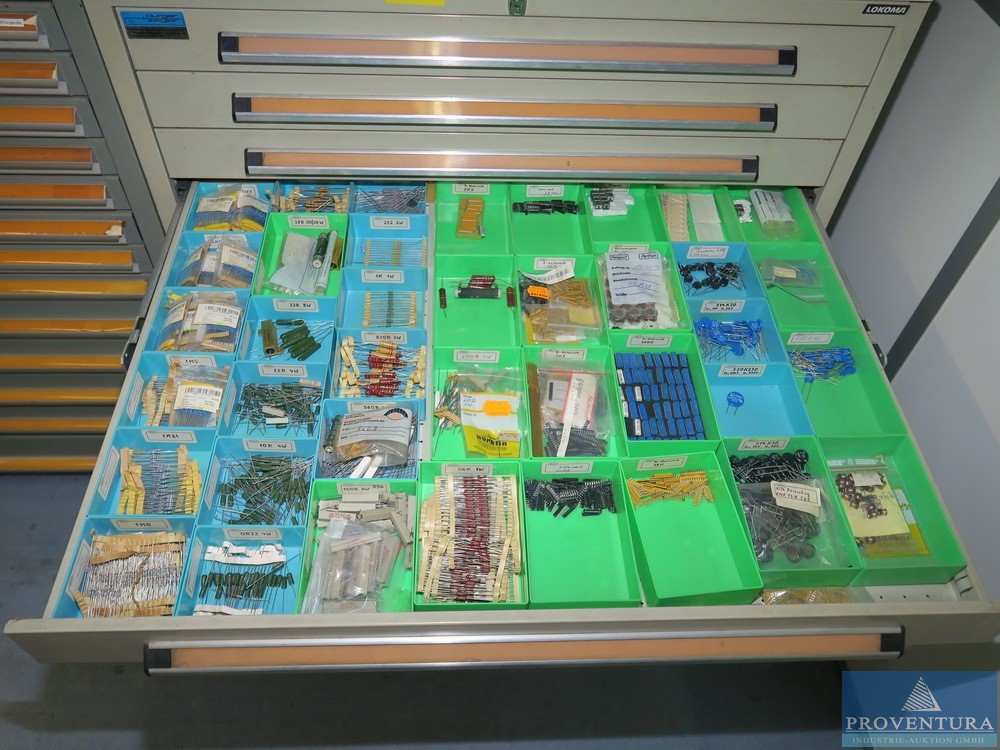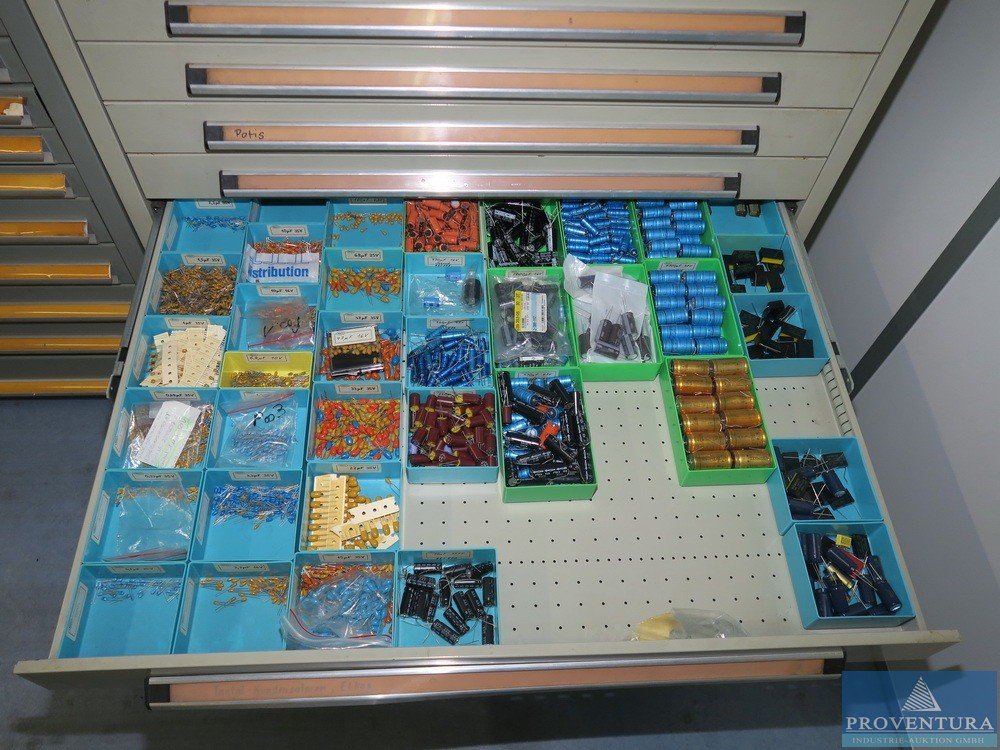 Şarjör çekmece dolabı LOKOMA gri 11 çekmece, dış boyutlar yaklaşık 100x104x80t cm, küçük içerki dirençler, kondansatörler, basılı devre kartları, aksesuarlar vb.