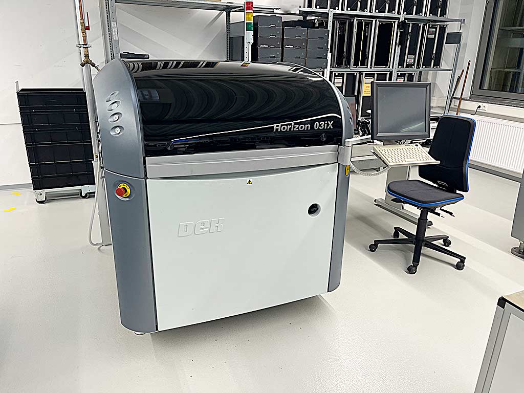 One DEK stencil printer including two identical ASYS unloaders is available. 1) DAK Horizon 03ix stencil printer, year of manufacture: 2011, print dimensions X/Y: 510mm/508.5mm, min. PCB dimensions X/Y: 50mm/40.5mm, PCB thickness: 0.2mm-6mm, max. PCB weight: 1kg, print speed: 300mm/s, stencil frame size: 305mm-736mm, machine dimensions approx. 2100mm/1500mm/1600mm, weight: approx. 700kg. 2) 2x SMT magazine unloaders ASYS AMS 03D type 3.1, year of manufacture: 2019/2022. Including three timing belts 16T5-3835. Documentation available. An on-site inspection is possible.