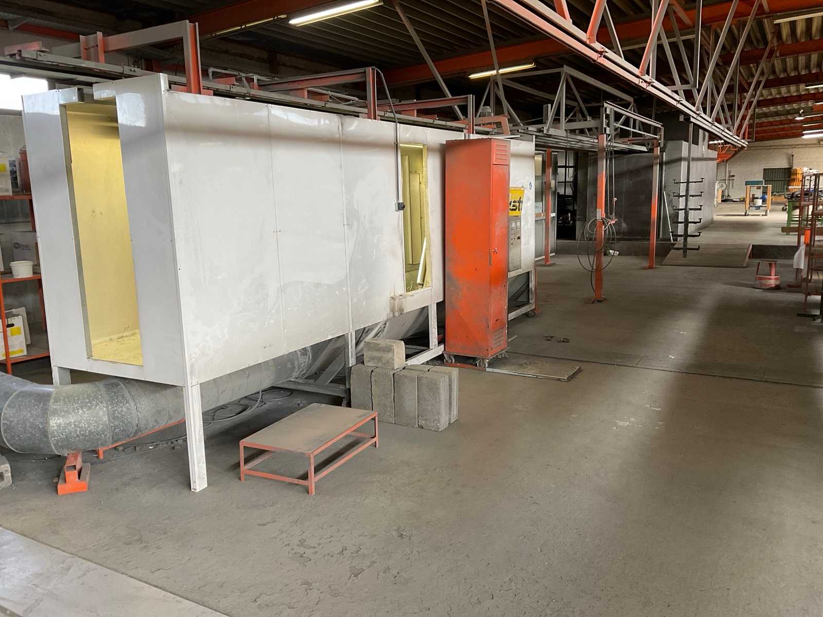 With Ernst KG oven, 250 degrees Celsius, interior space 15m3, 380/230v. Dimensions L6150xW2340xH3200mm. Overhead conveyor system. Including various powder coatings