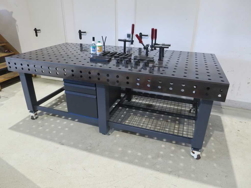 Welding table / hole table:Hole diameter: 28mmThe table is made of 15mm thick, high-alloy steel S355 JR T=15The surface is untreated.Side bolsters 165mmbottom ribbed for reinforcement.incl. floor bearingaccessories optional Surface flatness 0.2 - 0.4mm to 1000mm. - with drawer unit- grid shelf- heavy-duty castors steerableWorn welding accessories not included Table length 2400 mmTable width 1200 mmTable height 850 - 900 mmMachine weight approx. 0.65 tDimensions L x W x H 2.4 x 1.2 x 0.95 m Condition: never used / new (5)