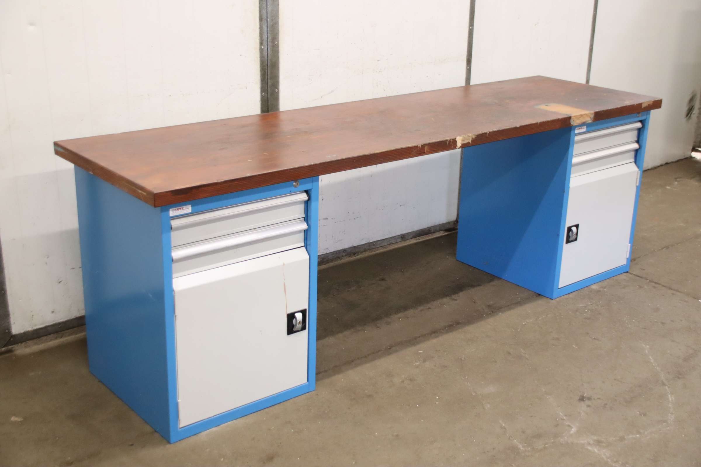 Workbench, work table, assembly bench, assembly table, work table -Manufacturer: KLW Lutz, workbench / solid worktop with base cabinets -Worktop: 2500/700/H850 mm -2x drawer cabinet: 2 drawers, layout/height see photos -Transport dimensions: 2500/700/H855 mm -Weight: 152 kg