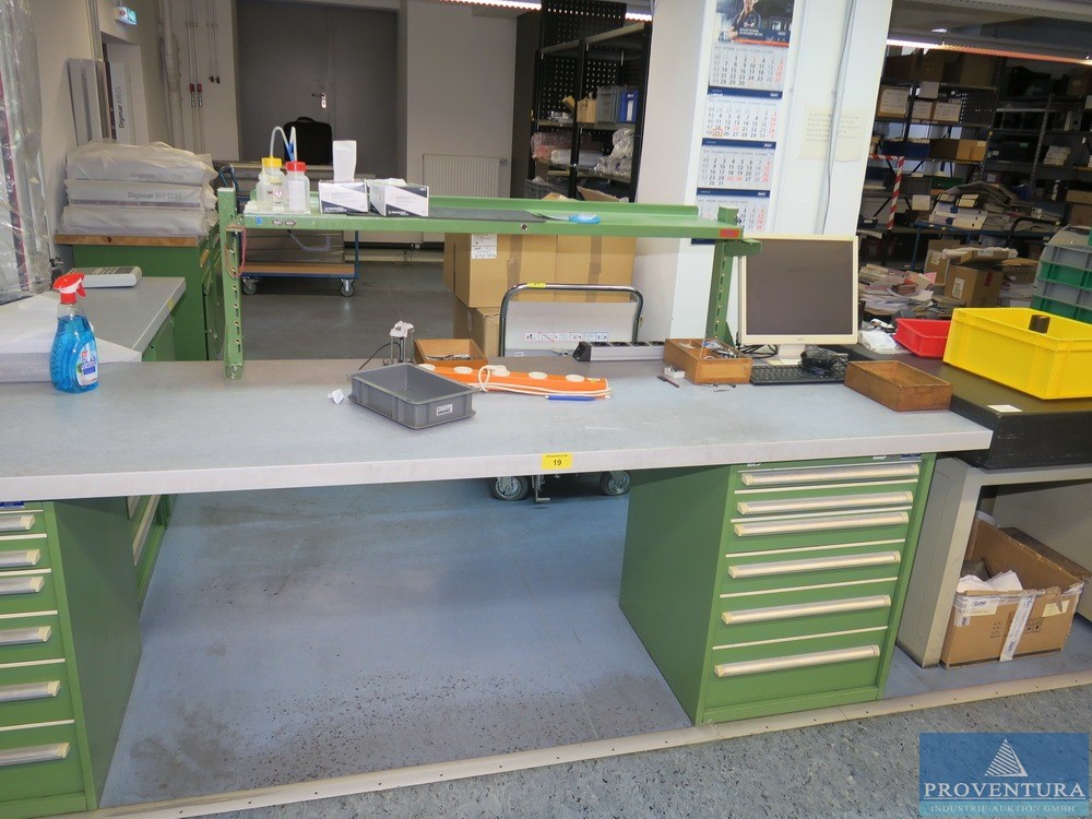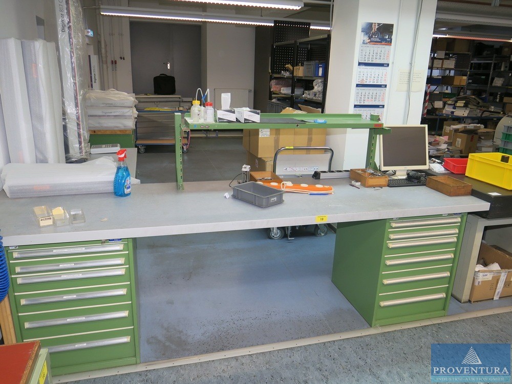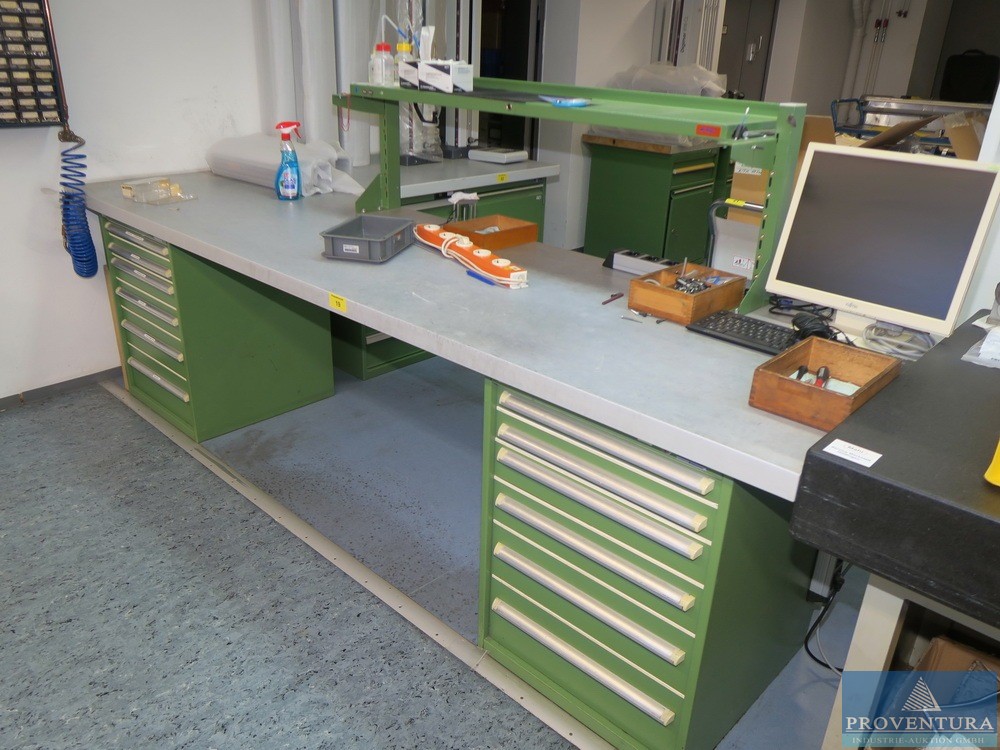 Workbench, work table, assembly bench, assembly table, work table -Manufacturer: KLW Lutz, workbench / solid worktop with base cabinets -Worktop: 2500/700/H850 mm -2x drawer cabinet: 2 drawers, layout/height see photos -Transport dimensions: 2500/700/H855 mm -Weight: 152 kg