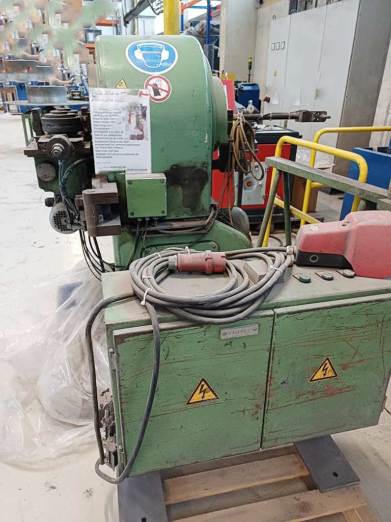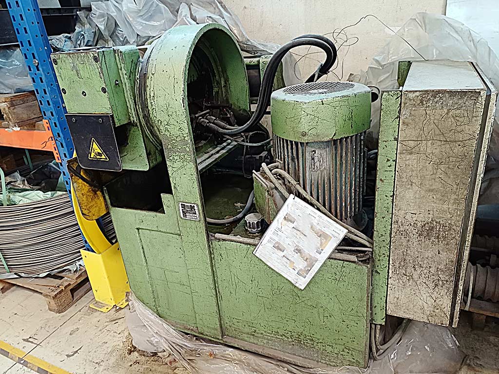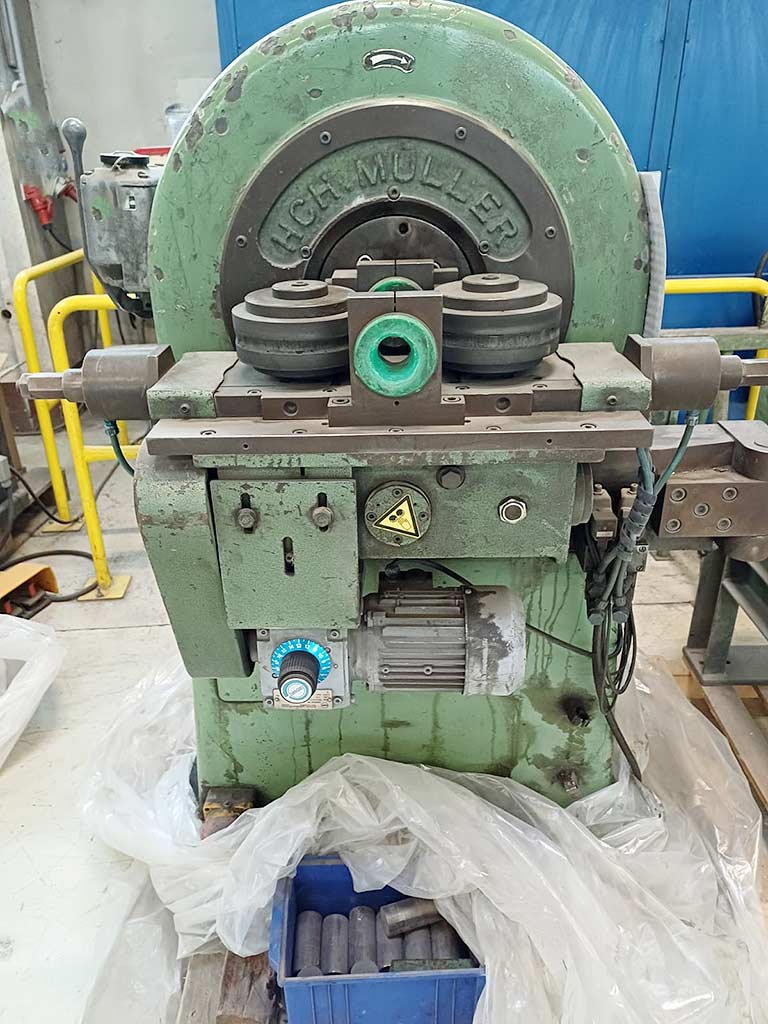 Tel ve boru üretimi için Heinrich Müller döner swing makinesi mevcuttur. Takım sistemi: çekiç çeneleri, alet seti: 4/set, alet açısı: 2.5, alet uzunluğu: 100mm, alet genişliği: 32mm, alet yükseklikleri: 50.5mm/51.5mm/52mm, alet çapı aralığı: 15mm-31mm, başlangıç çapı: 7.5mm, nihai çap: 3.2mm, toplam kesit indirgemesi: 81%, şekillendirme aşaması başına azaltma aralığı: 12%-20%, çevrim süresi: yaklaşık 15s, maksimum konik açı: 10/yan. Belgeler mevcut. Sahada inceleme yapılabilir.
