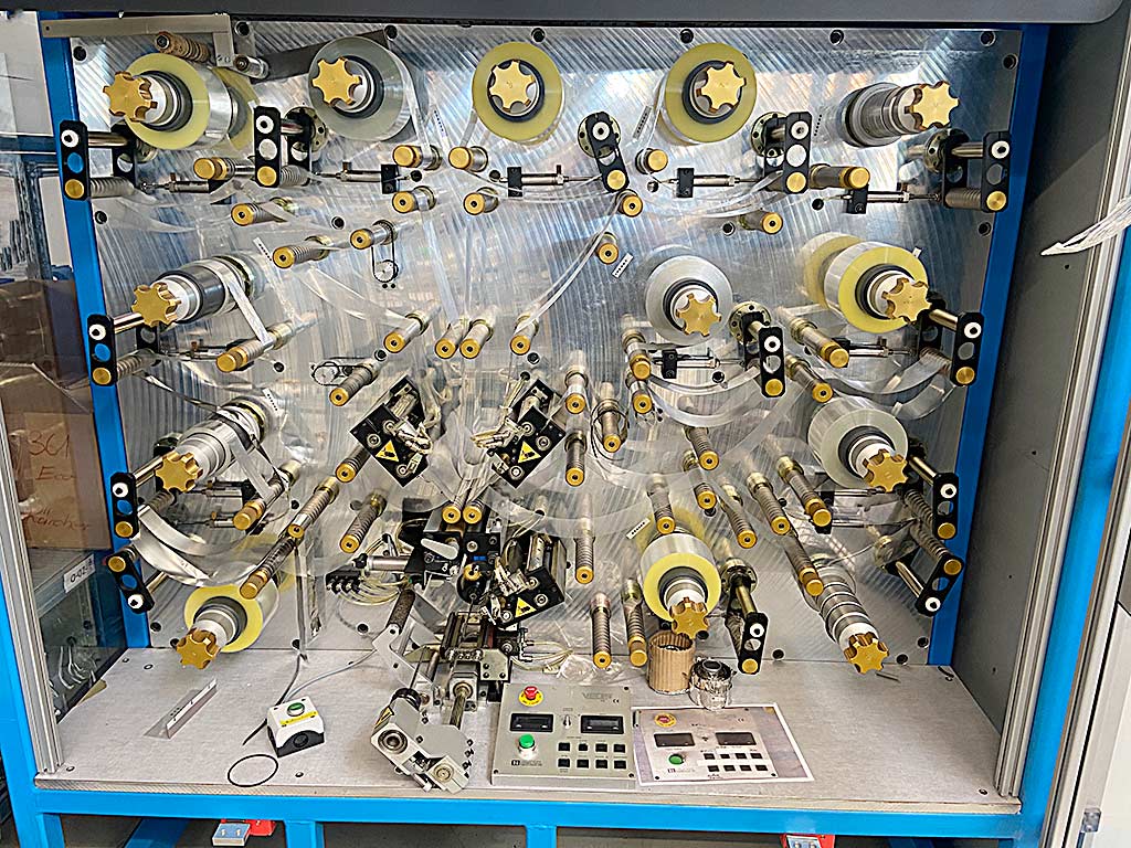 A capacitor winding machine Hilton Industries in a perforator design with a center-wind system is available. Tool plate: aluminum, max. winding width: 125mm, min. web width: 38mm, dielectric spindles: 10, foil spindles: 3, max. roll diameter: 203mm, bobbin core inner diameter: 76mm, spindle design: O-ring, max. spindle load capacity: 11.3kg, working height range: 690mm-740mm. Machine dimensions X/Y/Z: approx. 2450mm/2050mm/2250mm, weight: approx. 2050kg. The machine control system is defective. Documentation available. An on-site inspection is possible.
