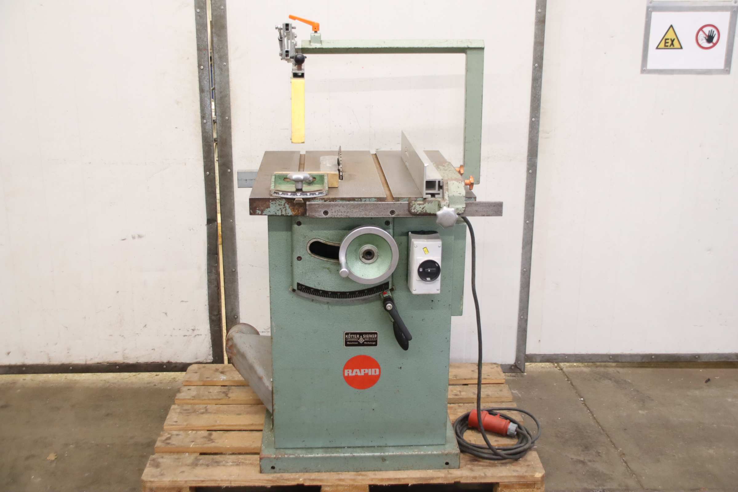 Underfloor sliding table saw, crosscut saw, sliding table saw, miter saw, panel saw, table saw, circular saw, precision circular saw -Manufacturer: Rapid, Table saw, Saw unit: swivels 45° -Type: Pk 100 -Motor power: 2.5 kW / 2850 rpm -Saw blade: Ø 250 mm, (max. Ø 300 mm) -Cutting height 75 mm with saw blade Ø 250 mm (max. approx. 100 mm) -Cutting width: 350 mm -Miter cut: up to 45° -Dimensions 850/850/H1310 mm -Weight: 176 kg