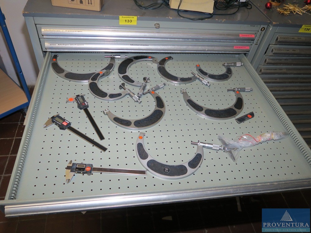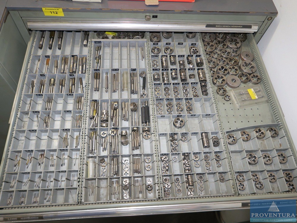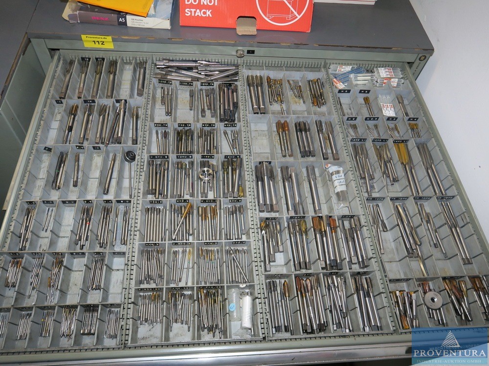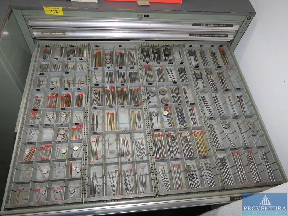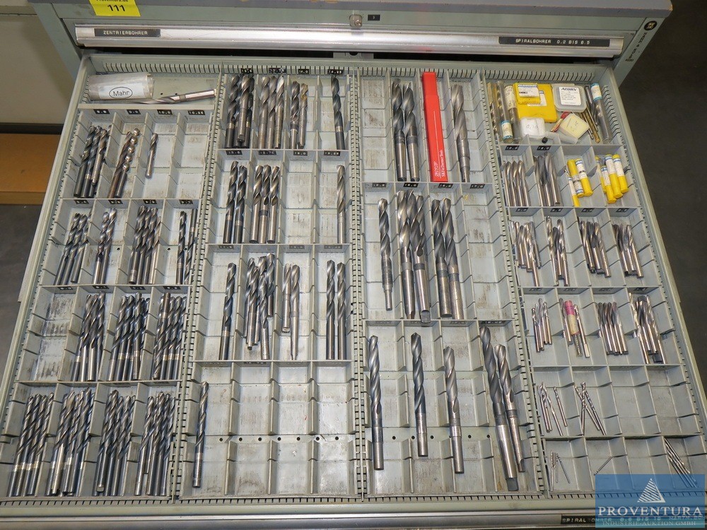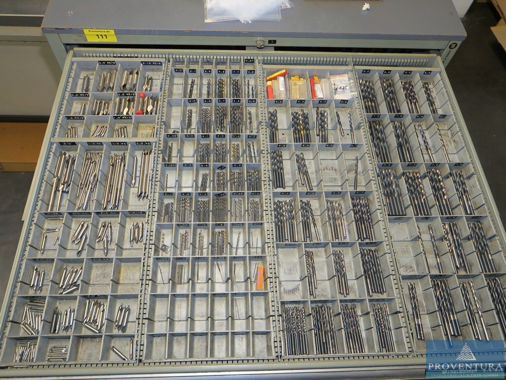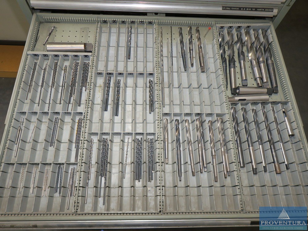 Şarjör çekmece dolabı HAHN+KOLB, yaklaşık 100x105x80t cm ölçülerinde çok sayıda matkap, 11 çekmece, iyi doldurulmuş, kısmen matkap ve frezeleme makinesiyle