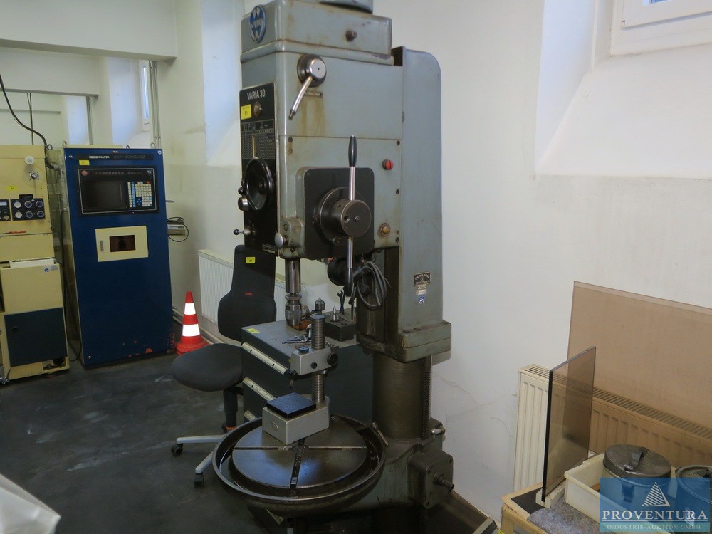 Kolon tatbikatı WEBO Varia 30, Masch.-Nr. E595/37, strok yaklaşık 200 mm, masa ø toplam yaklaşık 600 mm, makine yüksekliği ve motoru yaklaşık 2.600 mm, DİKKAT: Makine binadan çıkarılmak üzere sökülmelidir, sadece bodrum katında asansör mevcuttur
