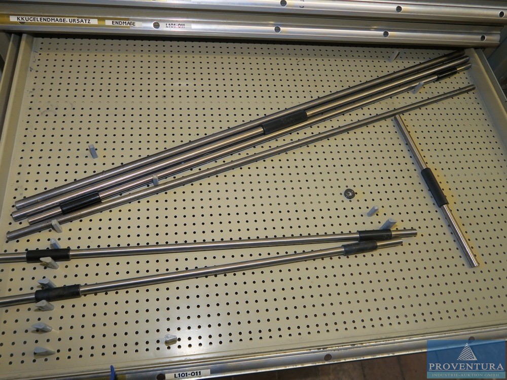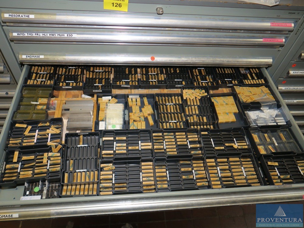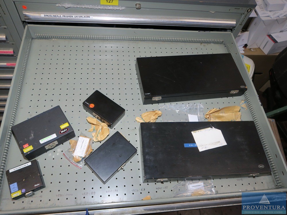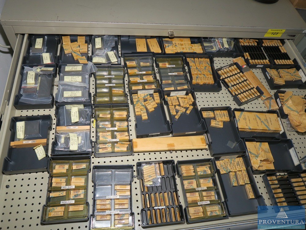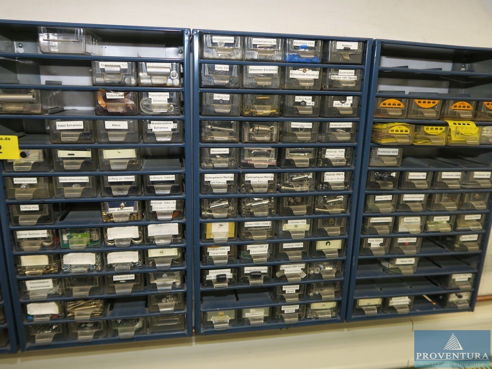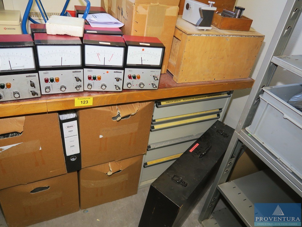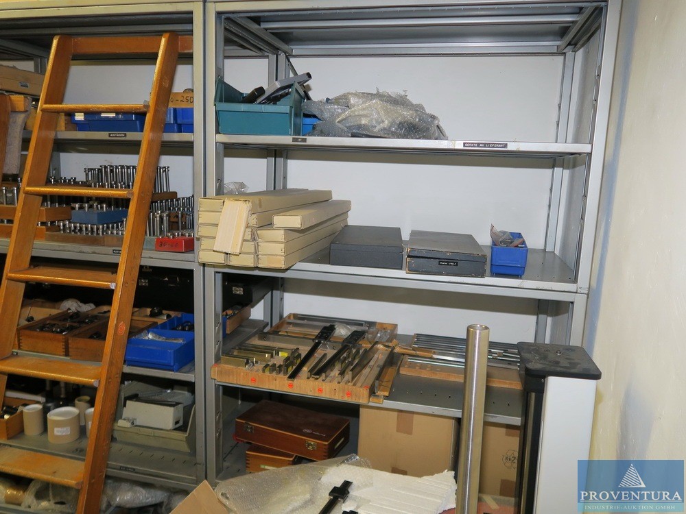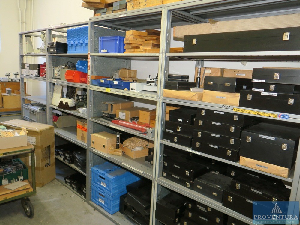 Ölçüm ekipmanları ve cıvatasız raflar SSI SCHAEFER 18 parça, her biri yaklaşık 170 cm, çoğunlukla taban + 1 raf, 2 ahşap merdiven, içeriği, çeşitli örnekler ve eski ölçüm ekipmanları ile birlikte