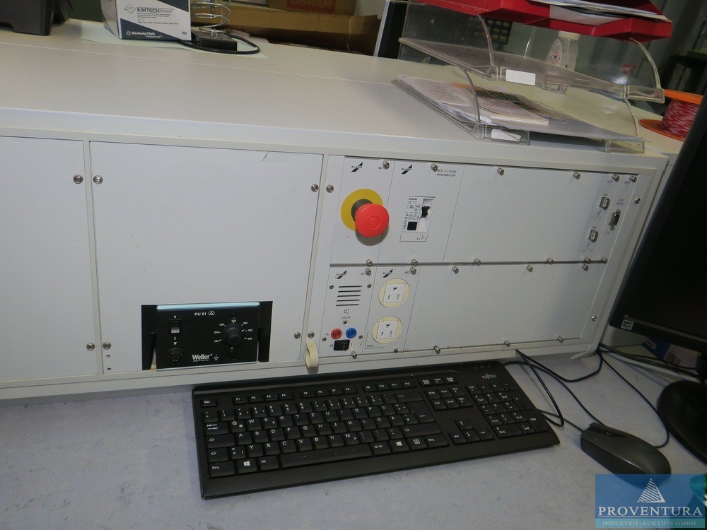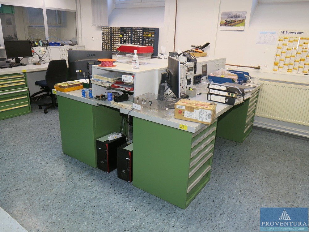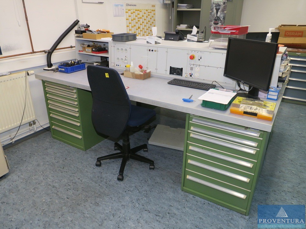 Çift elektrik test istasyonu yaklaşık 250b cm 2 iş istasyonu, her iki masanın toplam derinliği yaklaşık 200 cm, masa üstü 2 dergi çekmece dolabına yerleştirilmiş, entegre multimetre, lehim istasyonu, içerikler küçük ve içindekiler masada değil