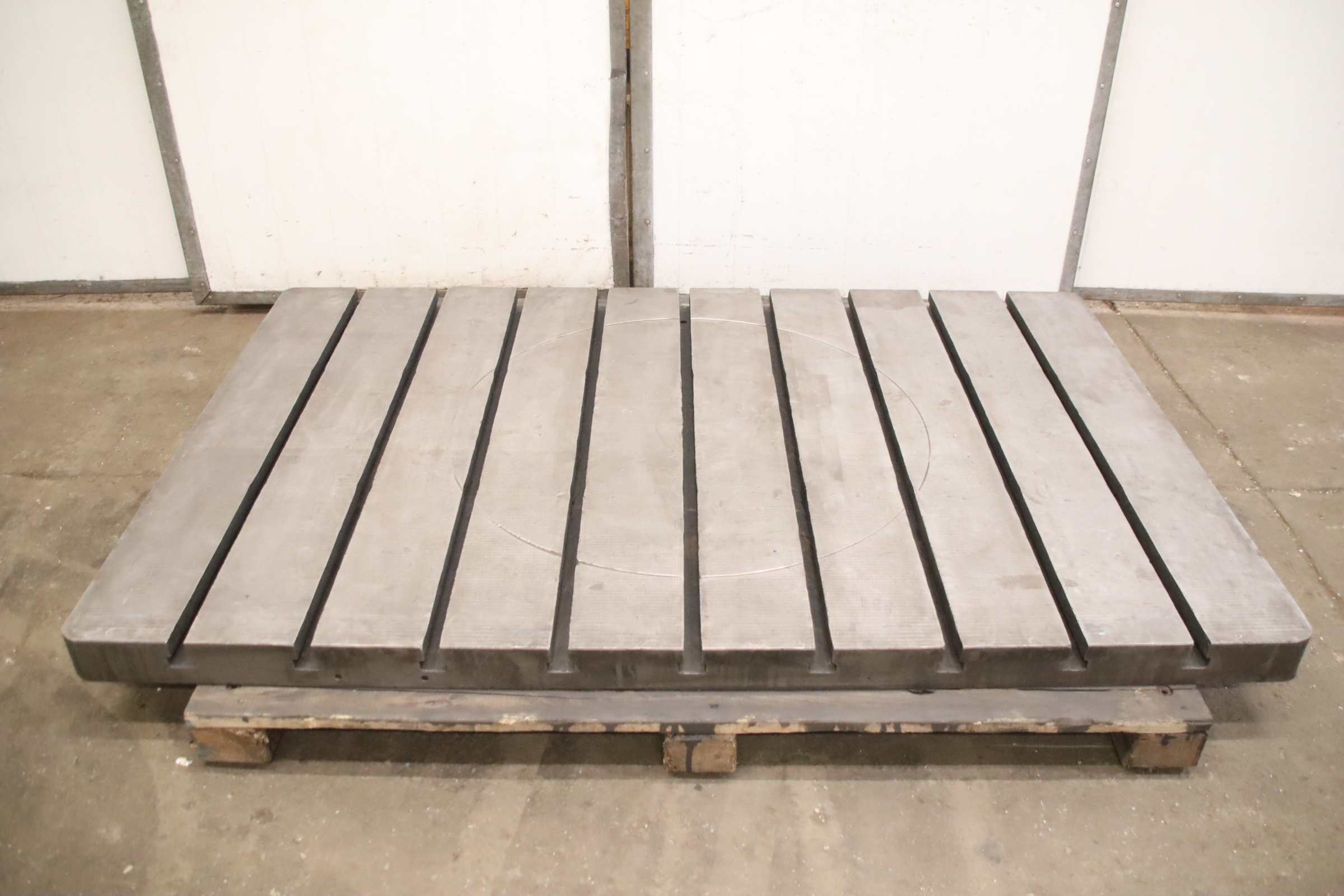 Clamping plate with T-slots, plate field, welding table, welding table, plate boring mill -Width: 1100 mm -Length: 2250 mm -Height: 200/100 mm -Working height: 820 mm -with supporting ribs -Groove width: 24 mm -Weight: approx. 2000 kg