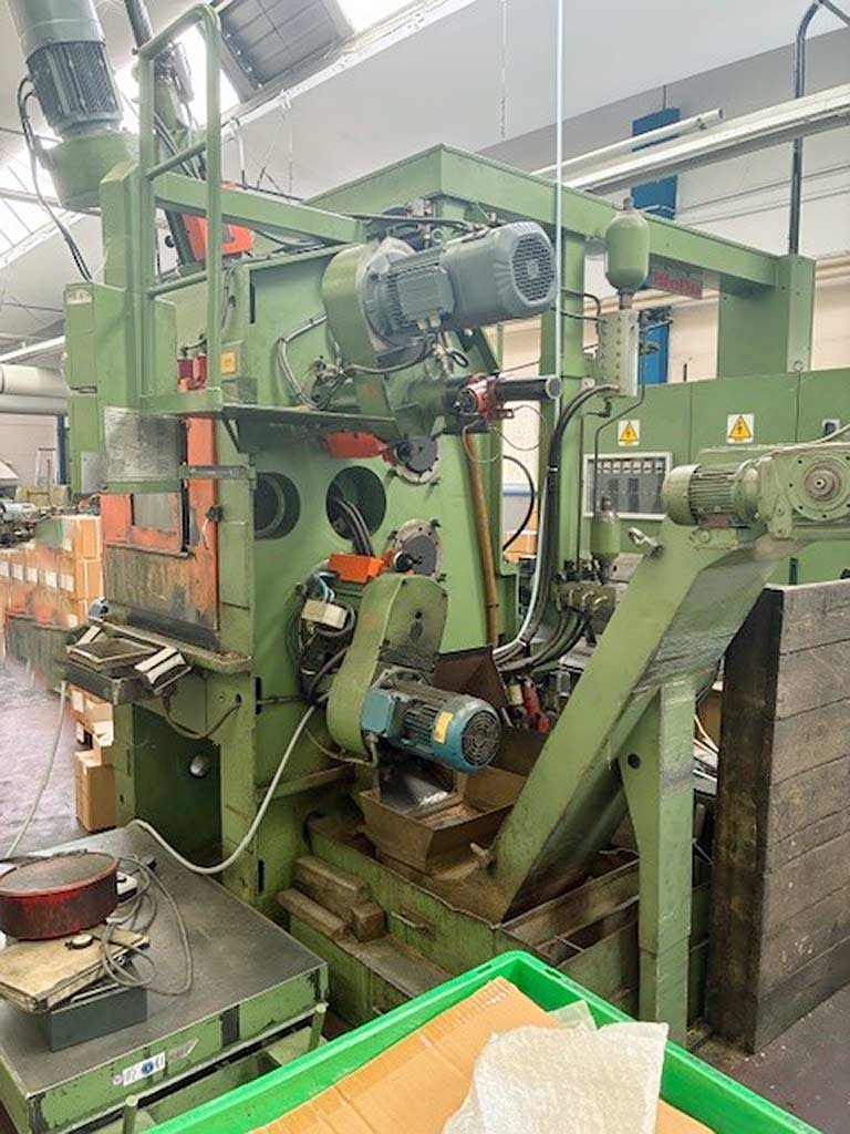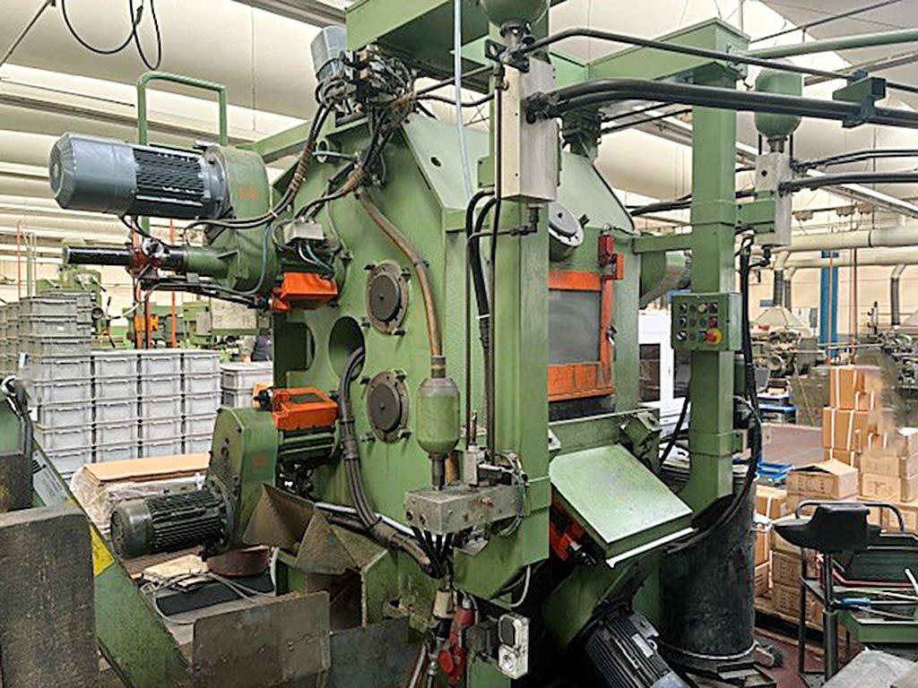 A multi-station transfer machine Riello with drilling and tapping units is available. Horizontal working units: 2x drilling units, 2x tapping units, 1x combined unit. Radial working units: 1x drilling unit, 1x tapping unit, 1x combined unit. Quill stroke: 100mm, spindle holder: SK40, rotary table type: TG 320, turret stations: 5, chuck diameter: 200mm, jaw opening travel: 12mm+12mm, spindle holder-chuck center distance: 225mm, total connected load: 23kW. Machine dimensions X/Y/Z: approx. 3700mm/3400mm/3050mm, weight: approx. 5800kg. Documentation available. An on-site inspection is possible.