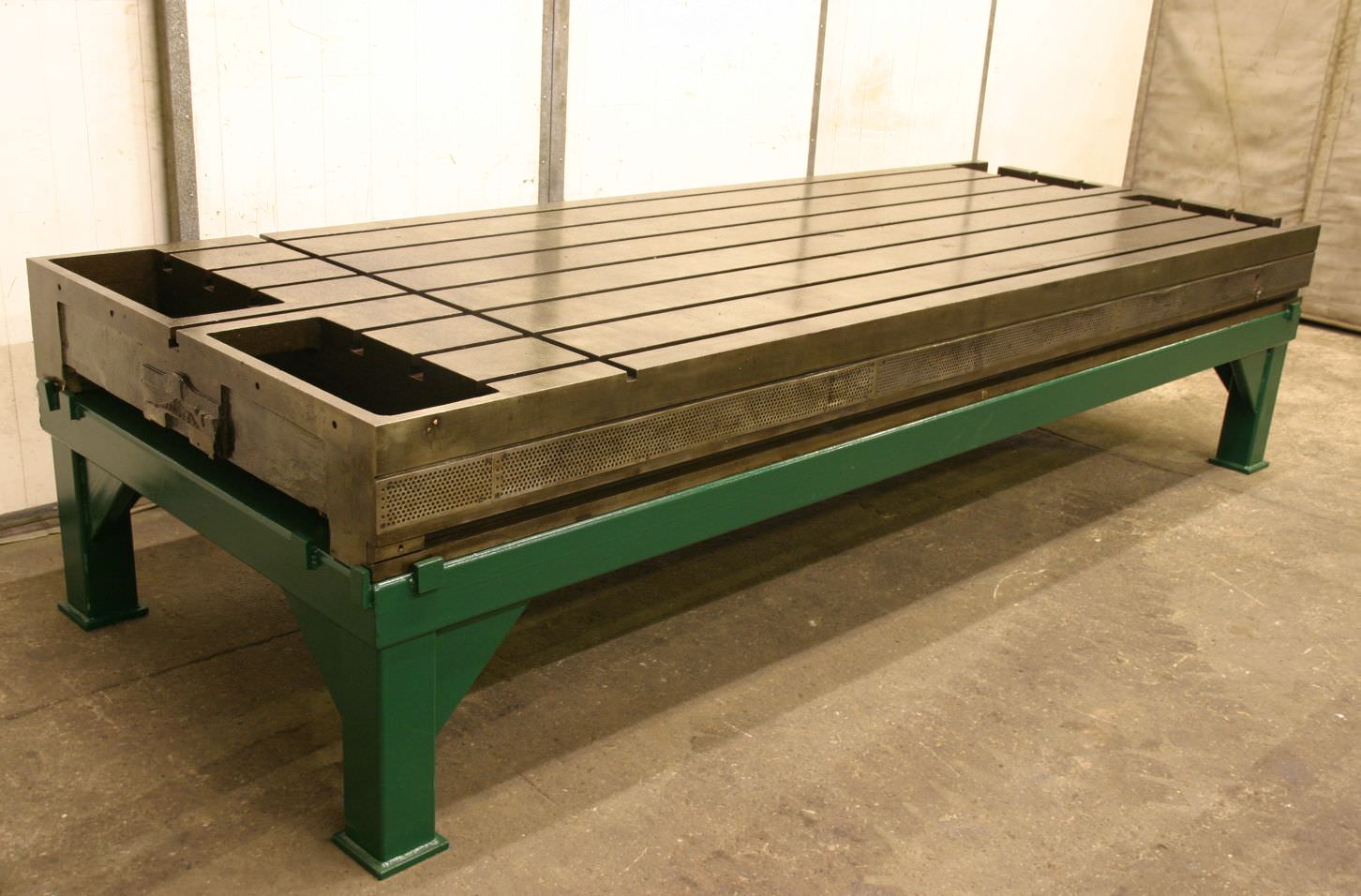 Clamping plate with T-slots, plate field, welding table, welding table, plate boring mill -Width: 1100 mm -Length: 1300 mm -Height: 200/100 mm -Working height: 820 mm -with supporting ribs -Groove width: 24 mm -Weight: approx. 1000 kg