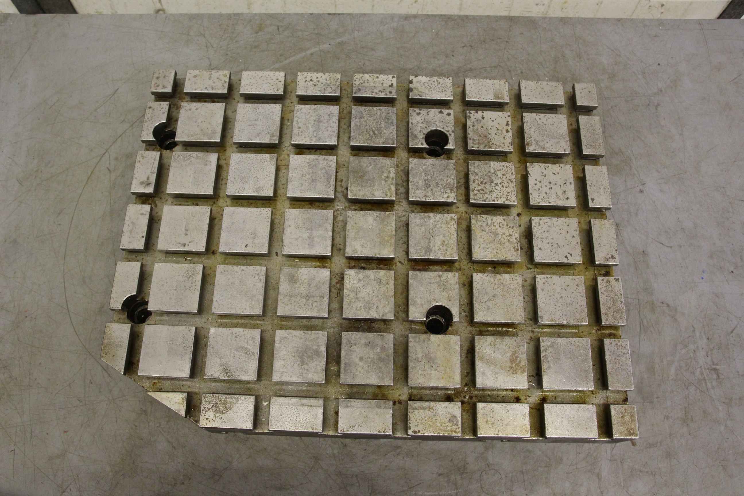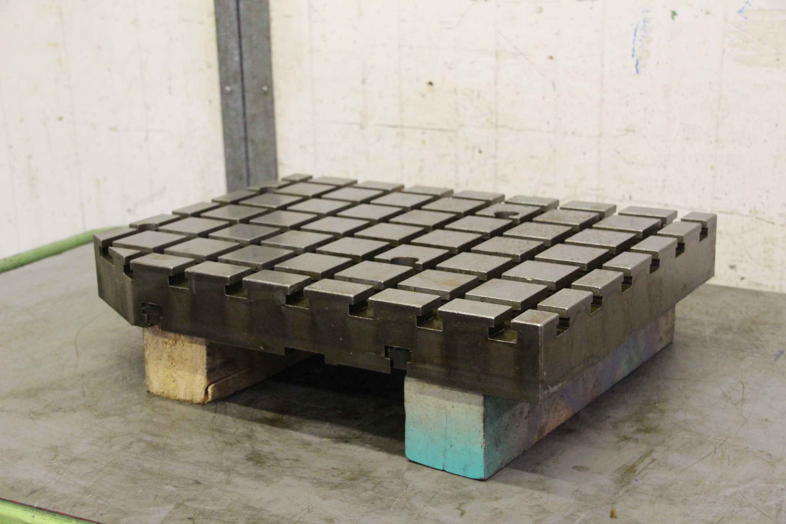 Clamping plate with T-slots and cross table, plate field, welding table, welding table, plate boring machine, T-slot plate, pallet changer, pallet changing system -Clamping plate: with T-slots and clamping devices, comes from a CNC machining center -Width: 395 mm -Length: 512 mm -Groove width: 14 mm -Groove spacing: 64 mm -Dimensions total: 512/395/H65 mm -Weight: 71 kg
