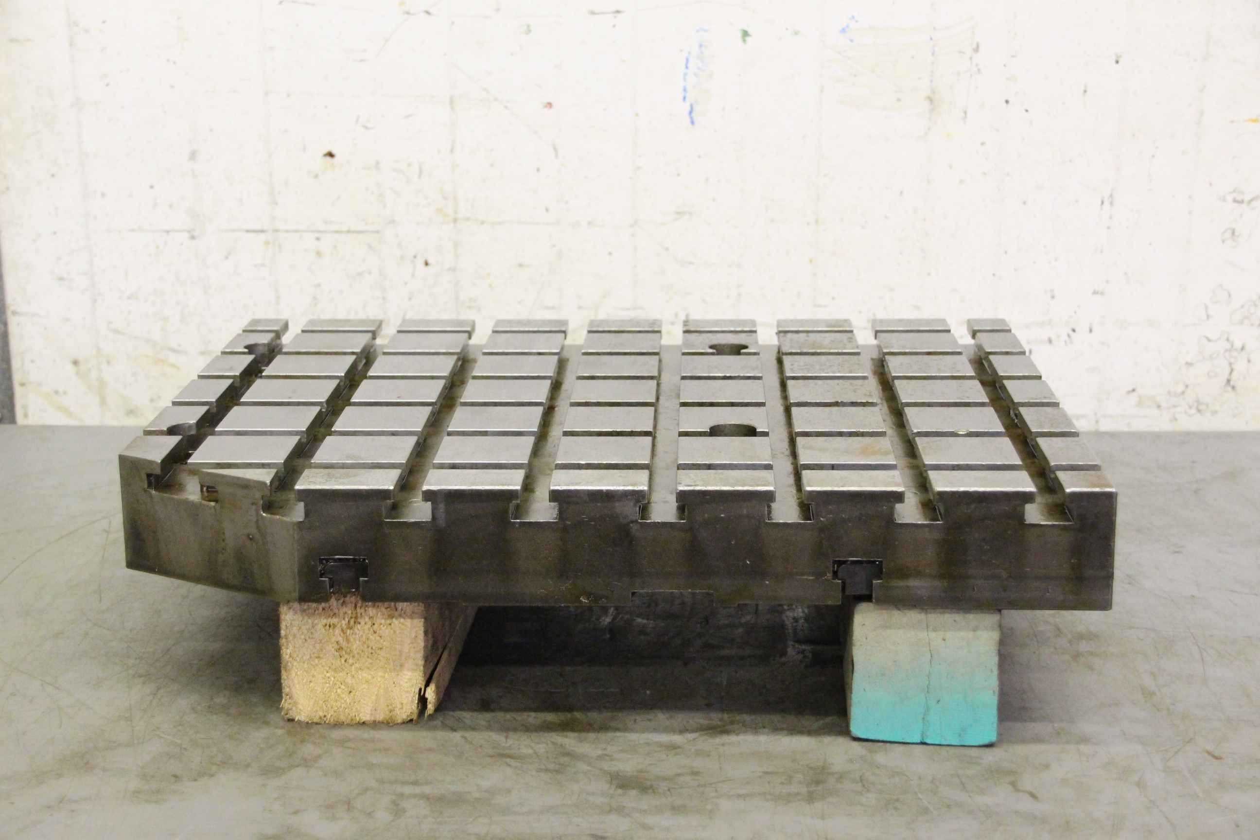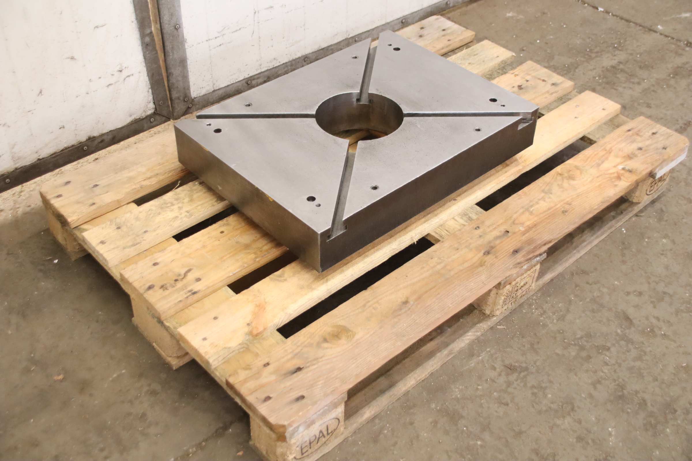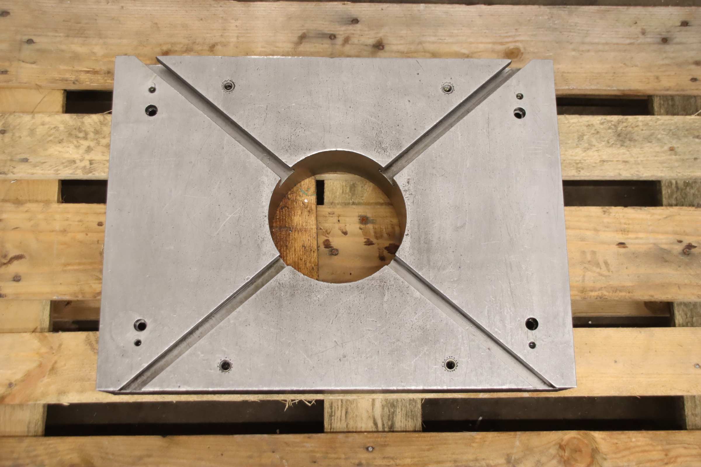 Clamping plate with T-slots, T-slot plate, punching table, clamping plate, plate field, -T-slot plate: Mounting plate with T-slots, for hydraulic press, eccentric press... -Clamping surface: 605 x 450 mm -Inner diameter: 180 mm -Plate height: 97 mm -Groove width: 18 mm -Dimensions: see drawing in the photos -Dimensions: 605/450/H97 mm -Weight: 183 kg