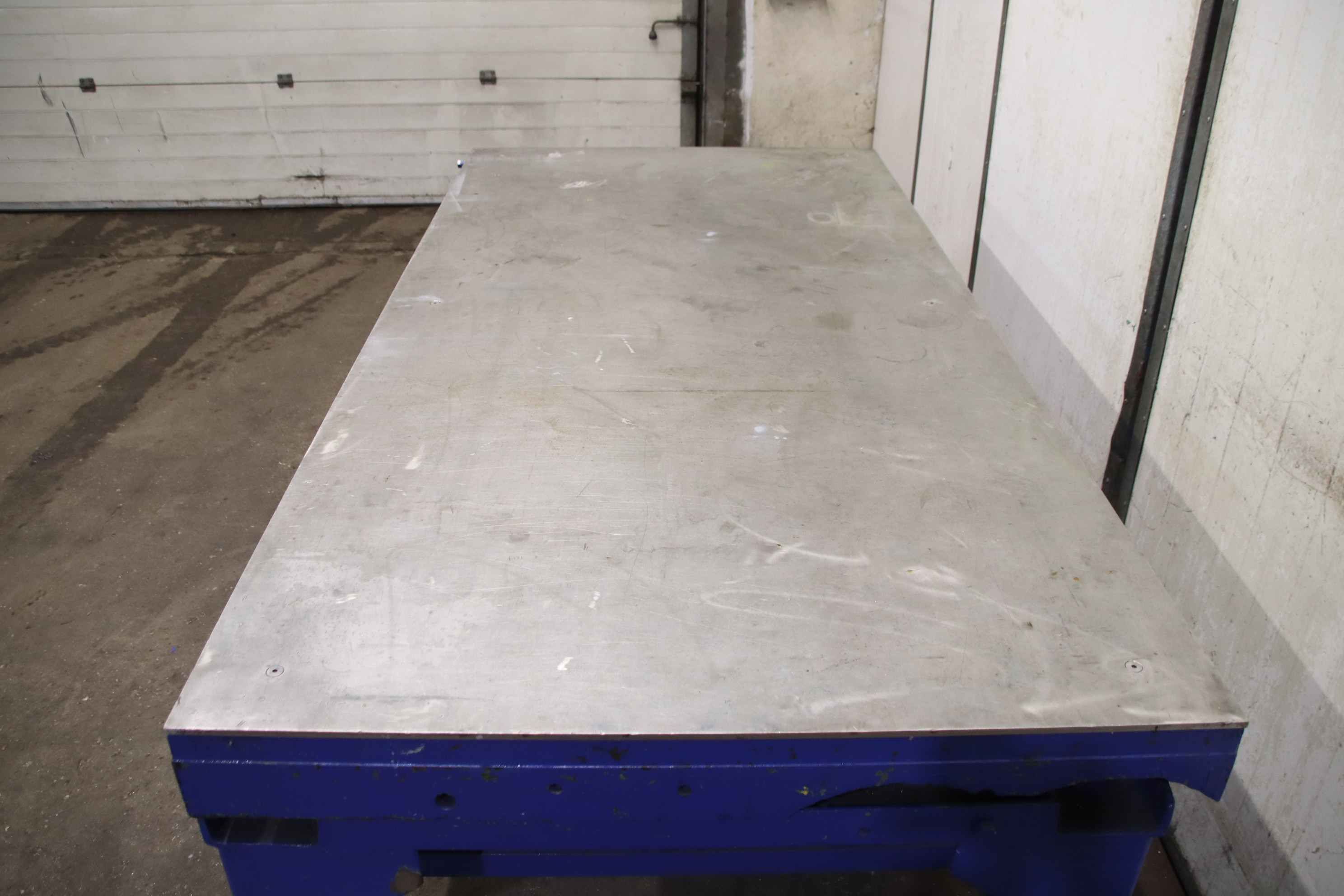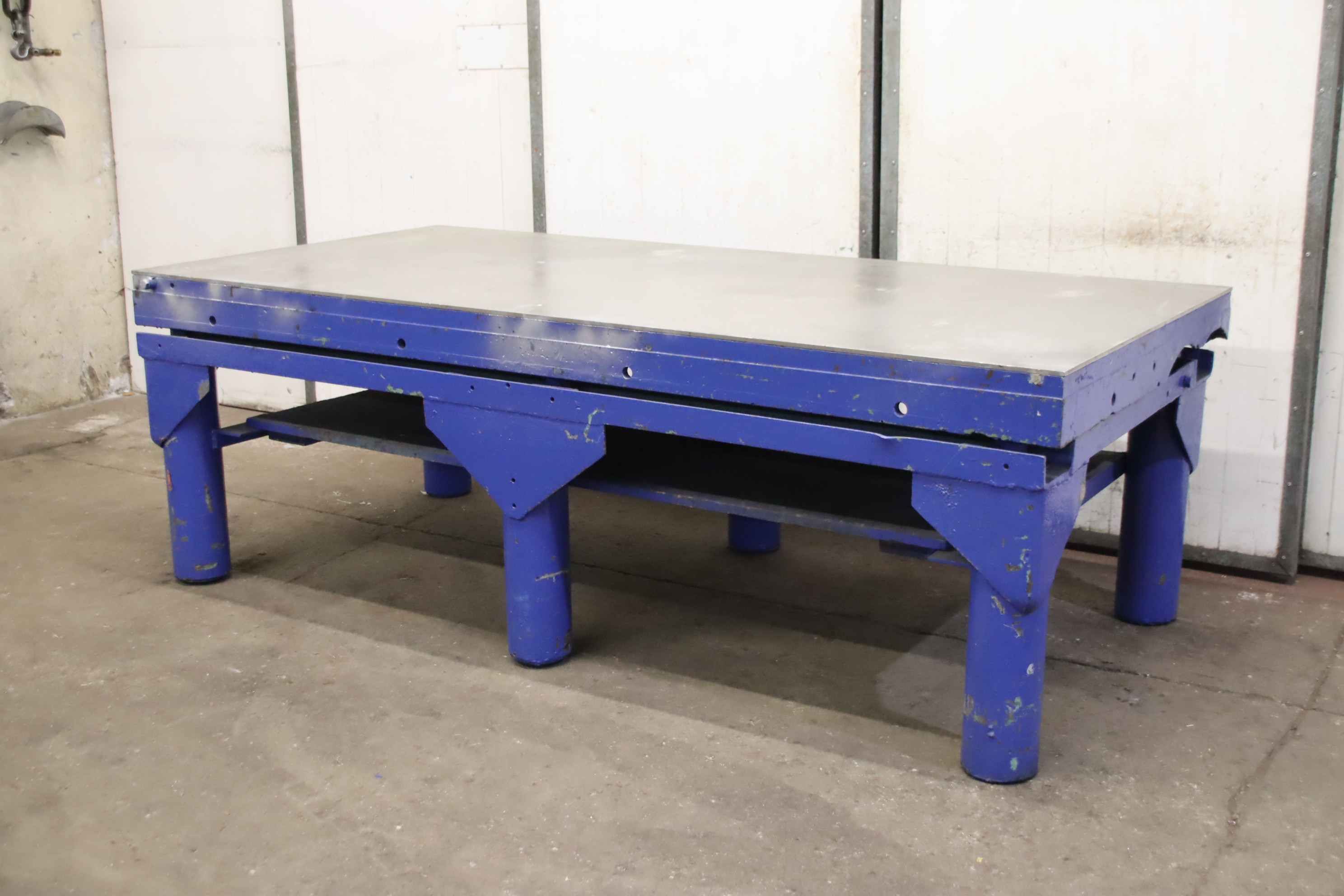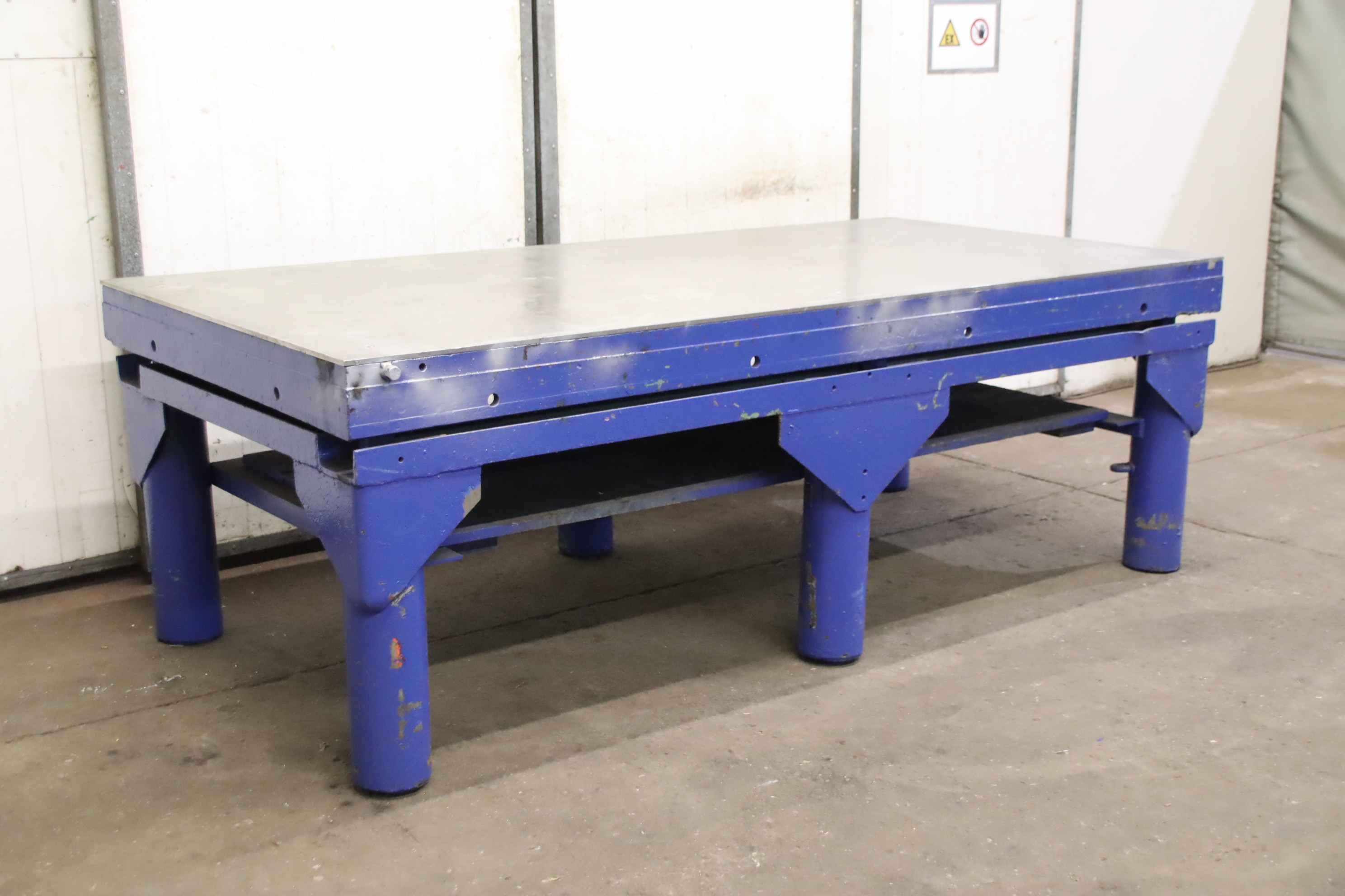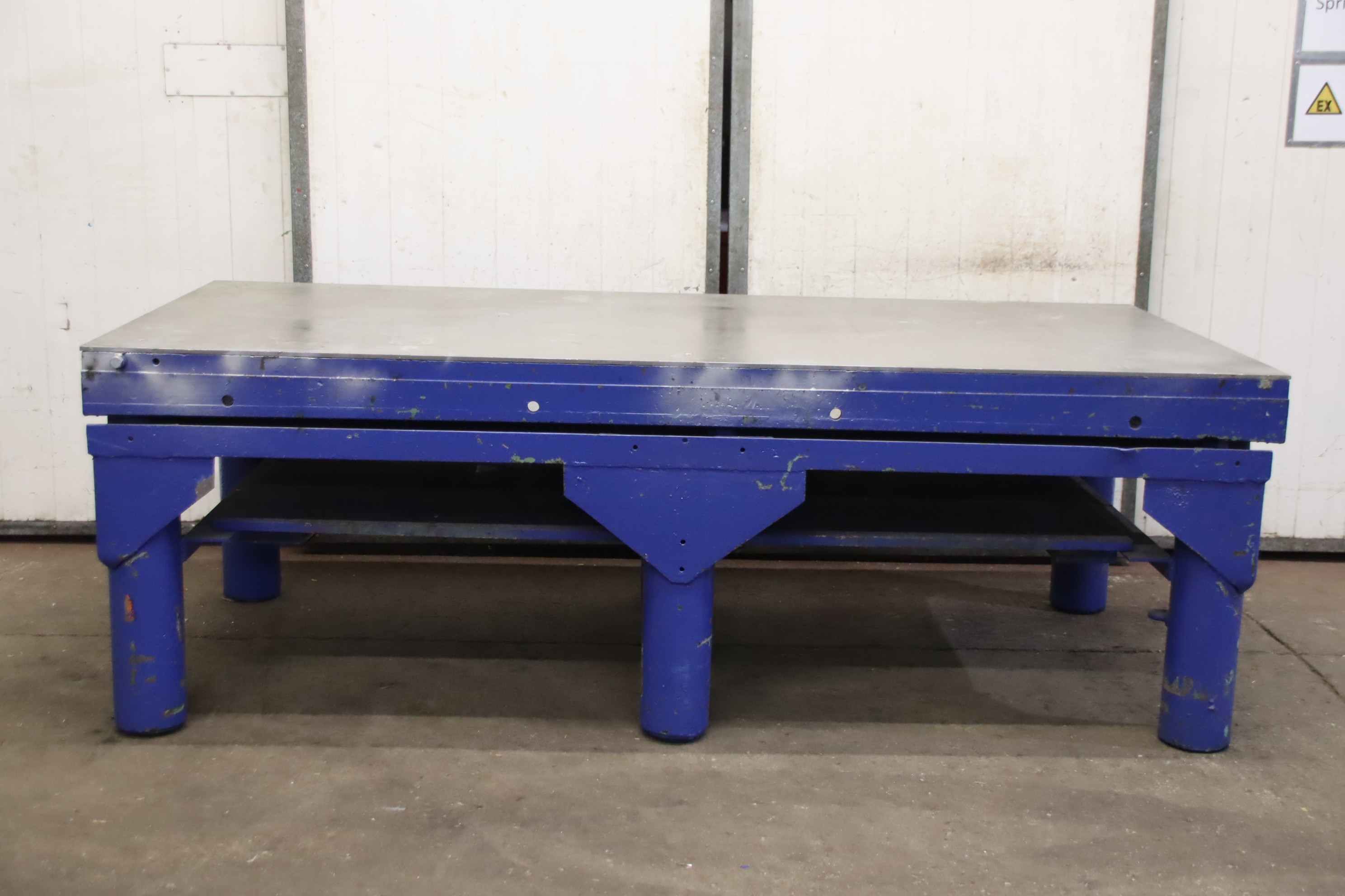Clamping plate, marking plate, measuring plate, measuring table, straightening plate, marking plate-Clamping plate: with support ribs, on a solid base frame-Clamping surface: 2490 x 1225 mm-Table height: 830 mm-Plate thickness: 70 mm 10 mm stainless steel plate V4A-Plate: with support ribs-Total dimensions: 2490/1225/H830 mm-Weight: 2000 kg