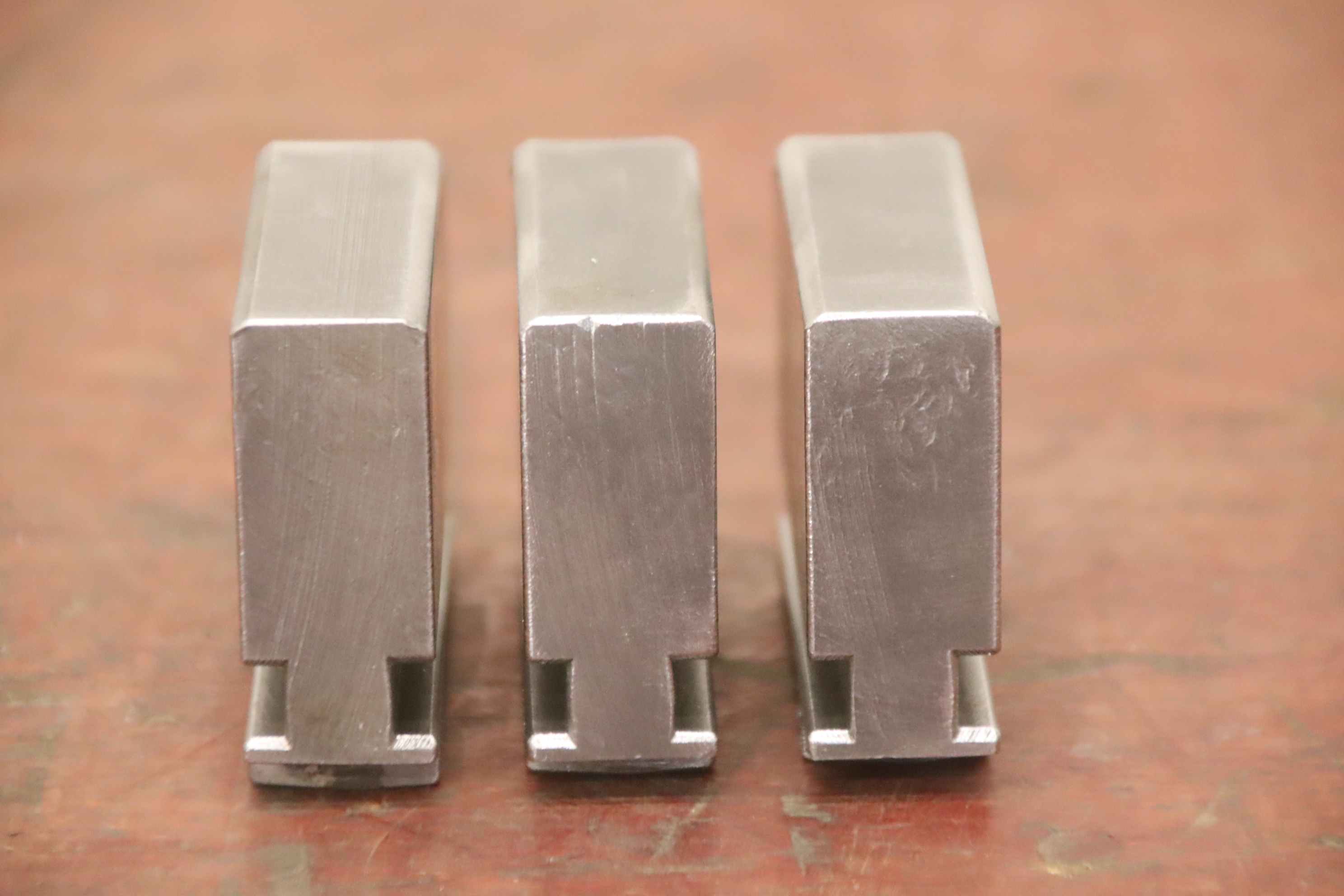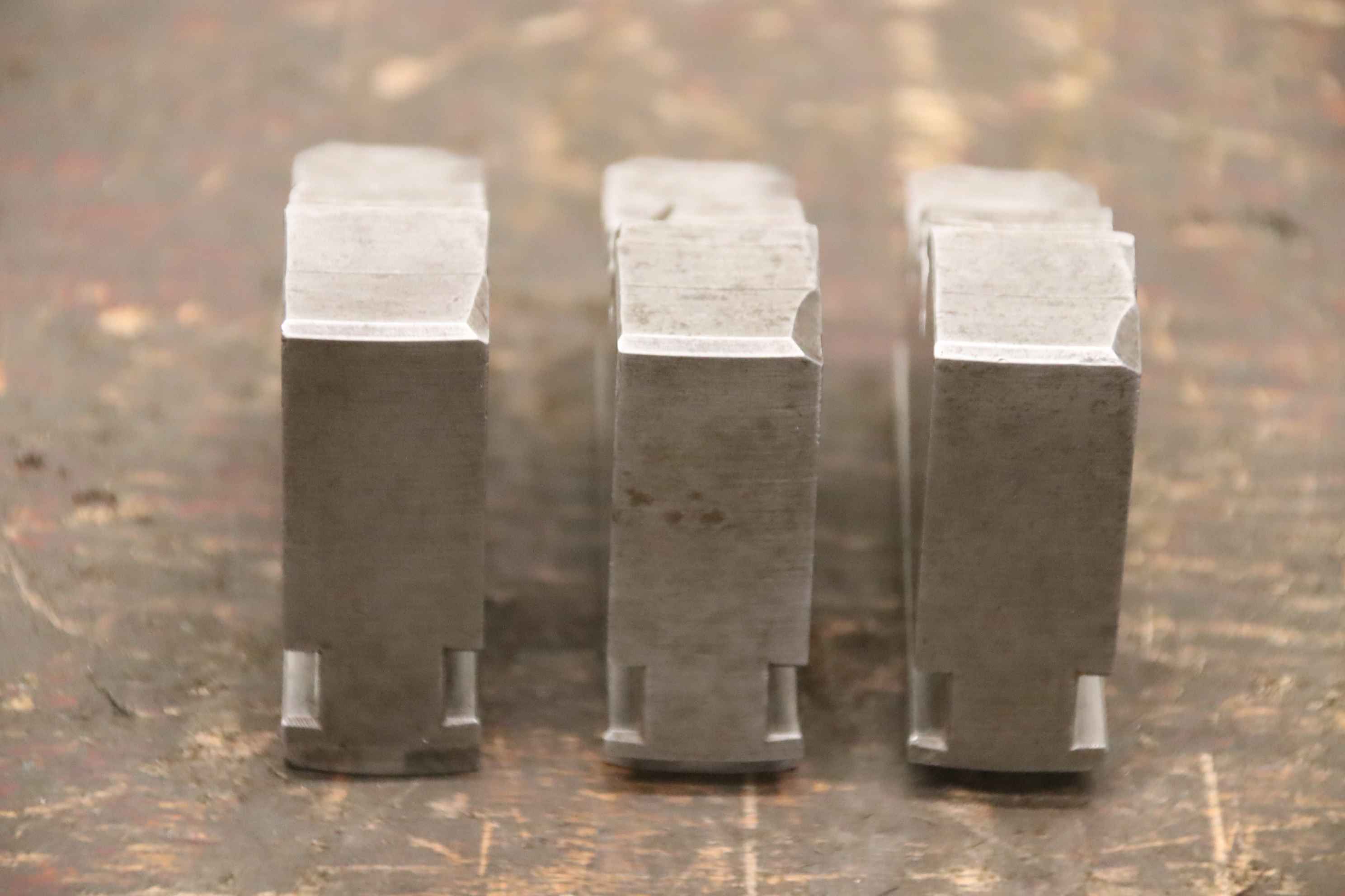 Interchangeable jaws, top jaws, three-jaw chuck, segment jaws, clamping jaws, stepped block jaws, stepped top jaws, block jaws, base jaws, 4-jaw set-Top jaws: Jaw set for three-jaw lathe chucks, hard-Jaw width: 18 mm-Dimensions: see photo techn. drawing-Total dimensions: 62/54/H47 mm-Total weight: 0,7 kg