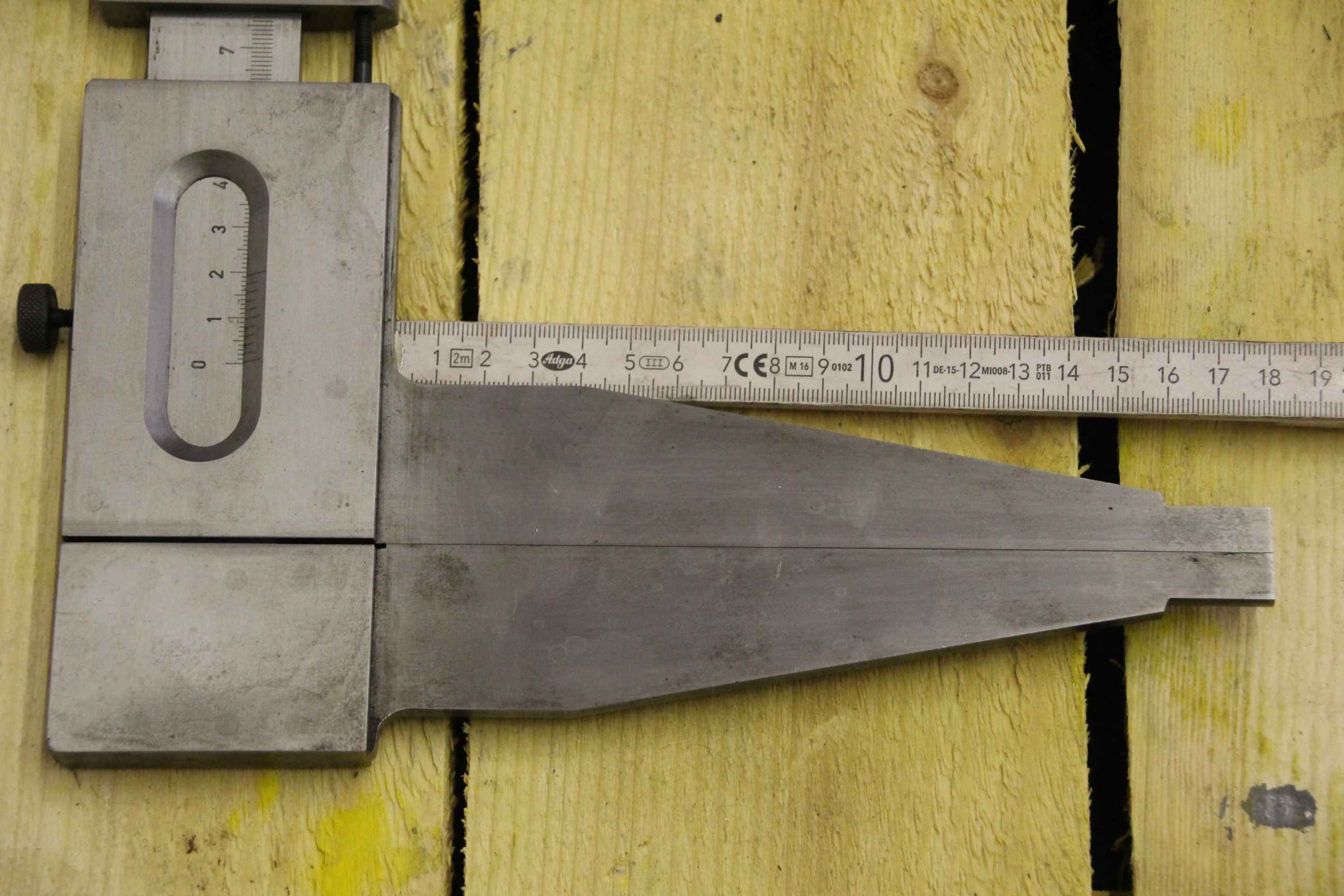 Vernier caliper, caliper, vernier caliper -Manufacturer: Massi, Vernier caliper with fine adjustment according to TGL 9252 -Measuring range: 0-750 mm -Number: 2x calipers available -Price: per piece -Dimensions: 950/242/H13 mm -Weight: 2.2 kg/pc.