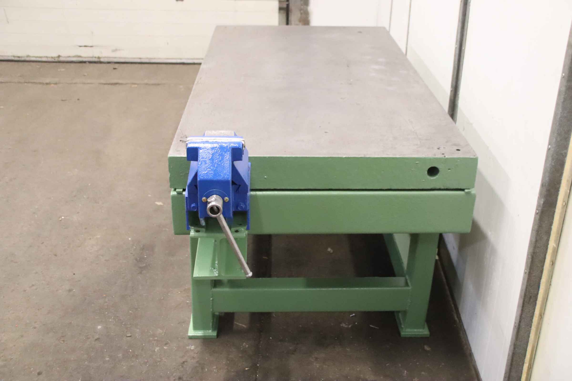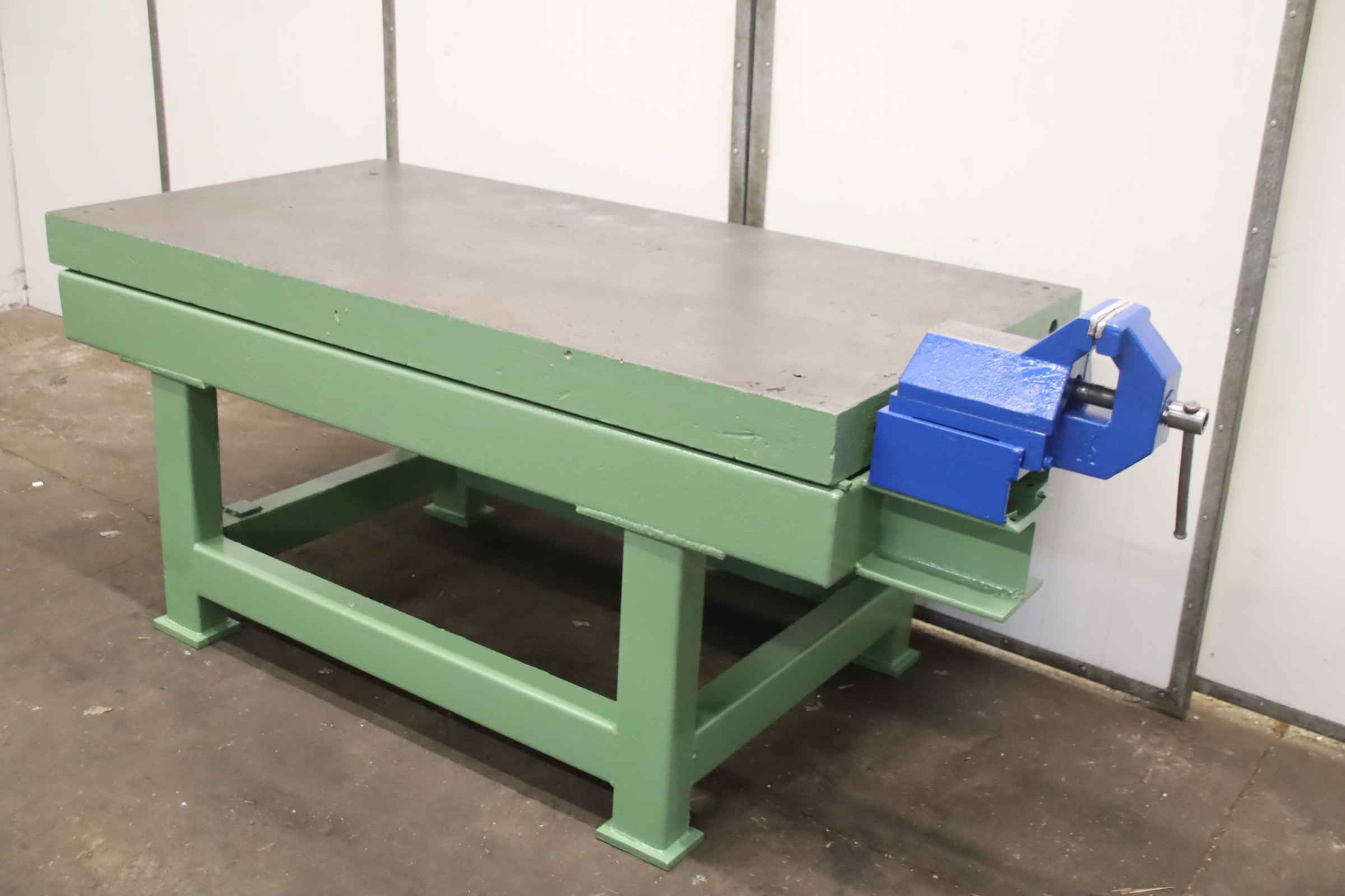 Clamping plate, marking-spotting plate, measuring plate, measuring table, welding table, welding table, straightening plate, marking plate, straightening table -Clamping plate: on a solid base frame, with vice -Clamping surface: 2000 x 1000 mm -Table height: 925 mm -Plate thickness: 115 mm -Vice: clamping jaws: 150 x 30 mm clamping width 250 mm -Transport dimensions: 2480/1000/H1110 mm -Weight: 1850 kg