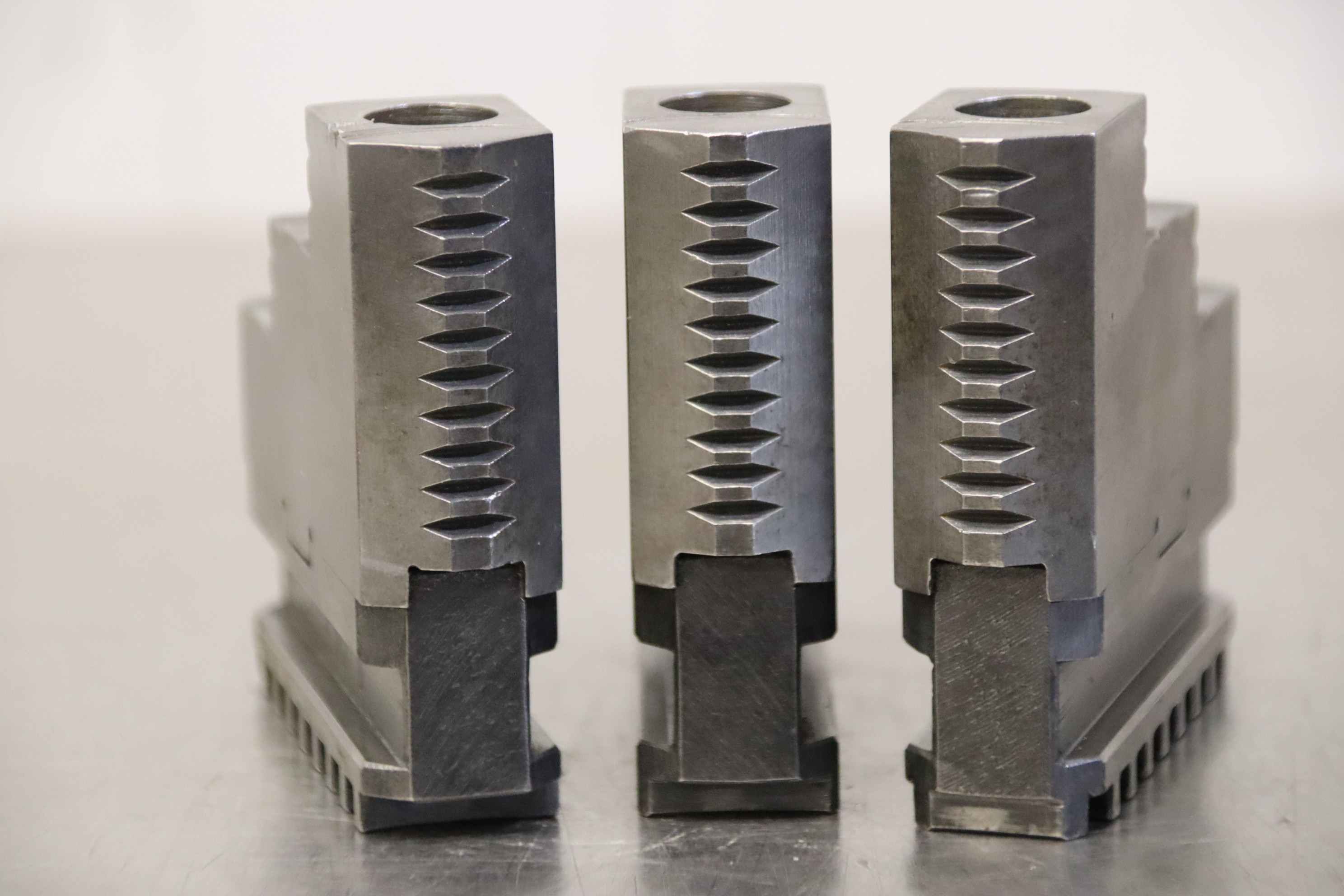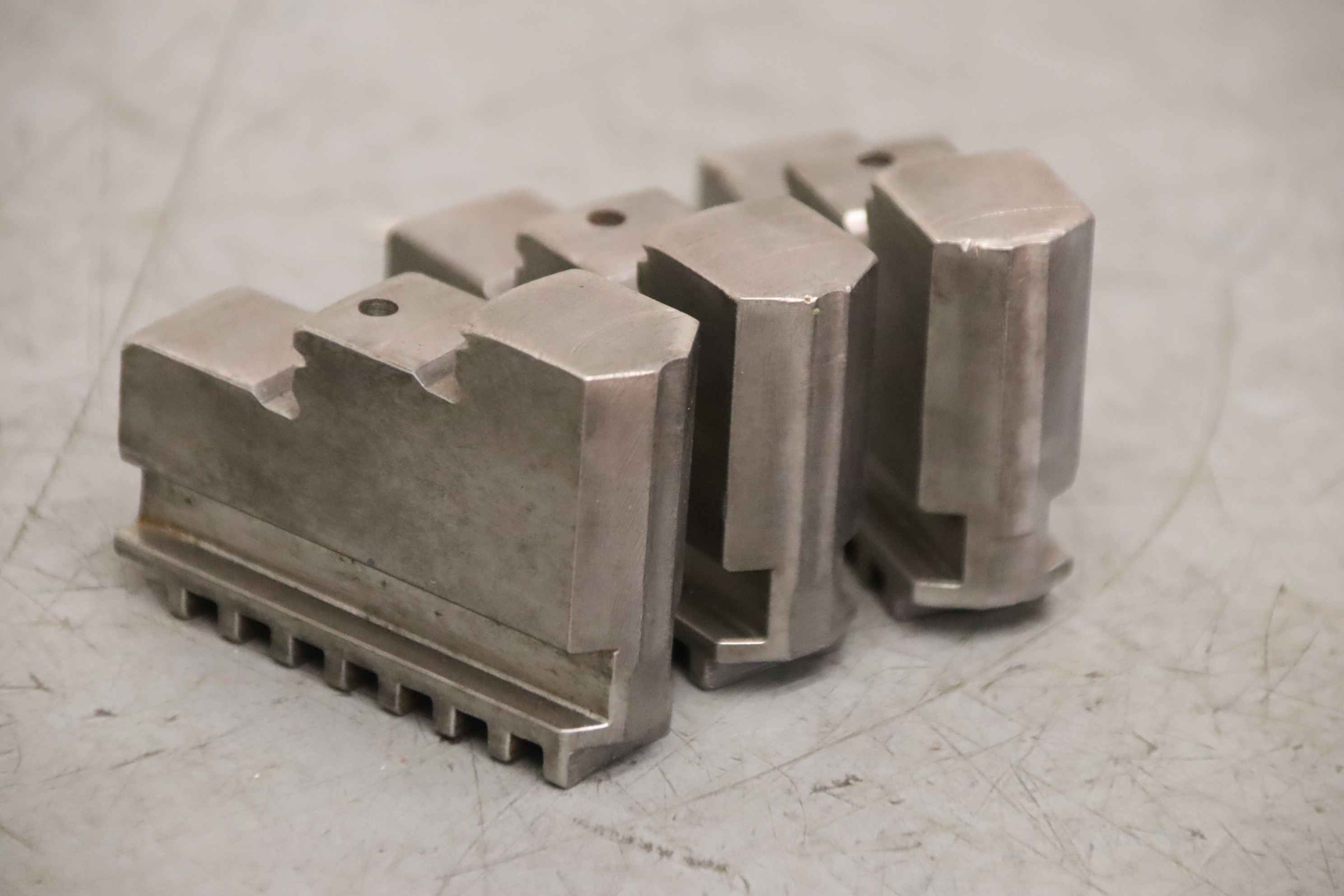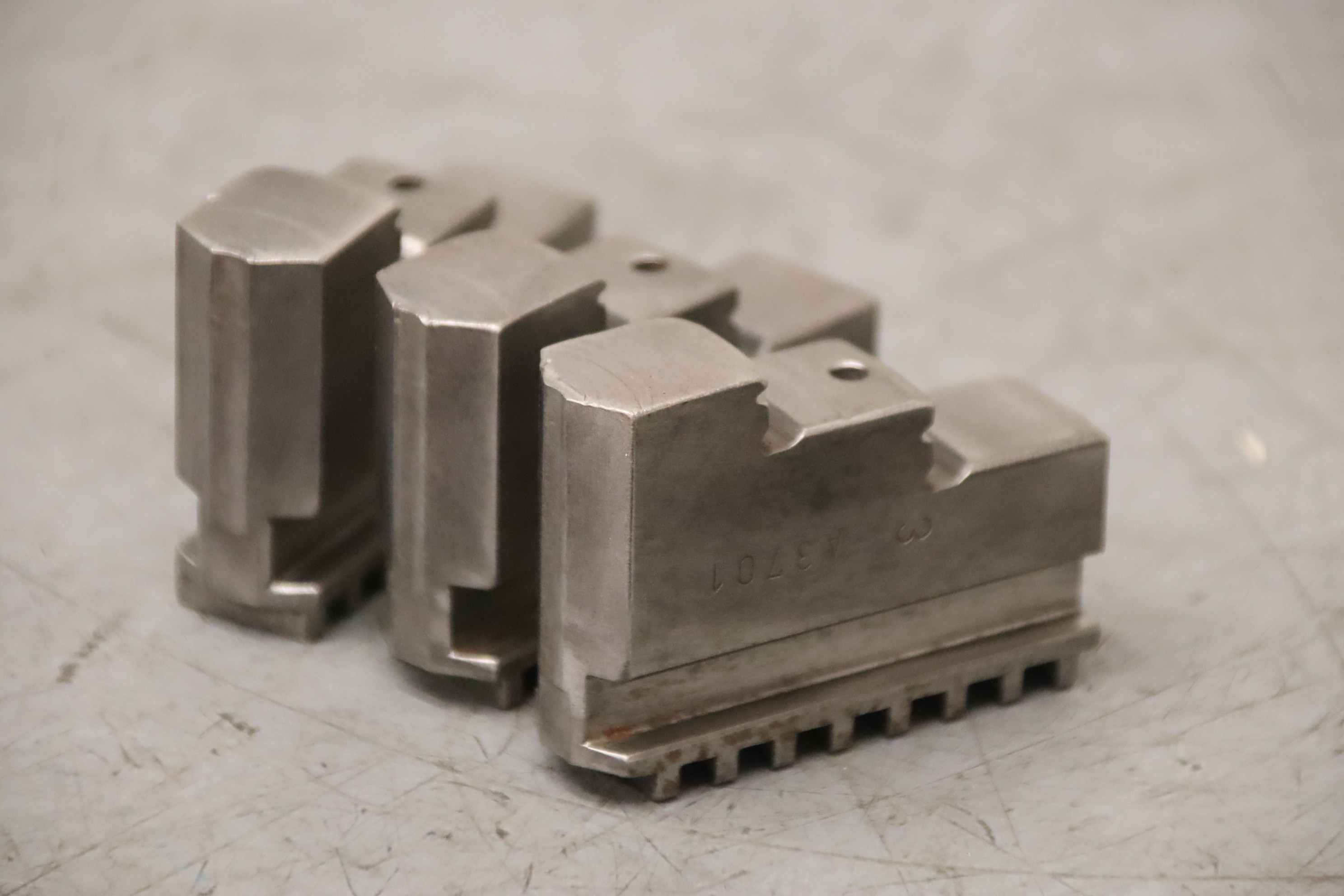 Interchangeable jaws, top jaws, three-jaw chuck, segment jaws, clamping jaws, stepped block jaws, stepped top jaws, block jaws, base jaws, 4-jaw set-Top jaws: Jaw set for three-jaw lathe chucks, hard-Jaw width: 16 mm-Dimensions: see photo techn. drawing-Total dimensions: 51/48/H45 mm-Total weight: 0,5 kg