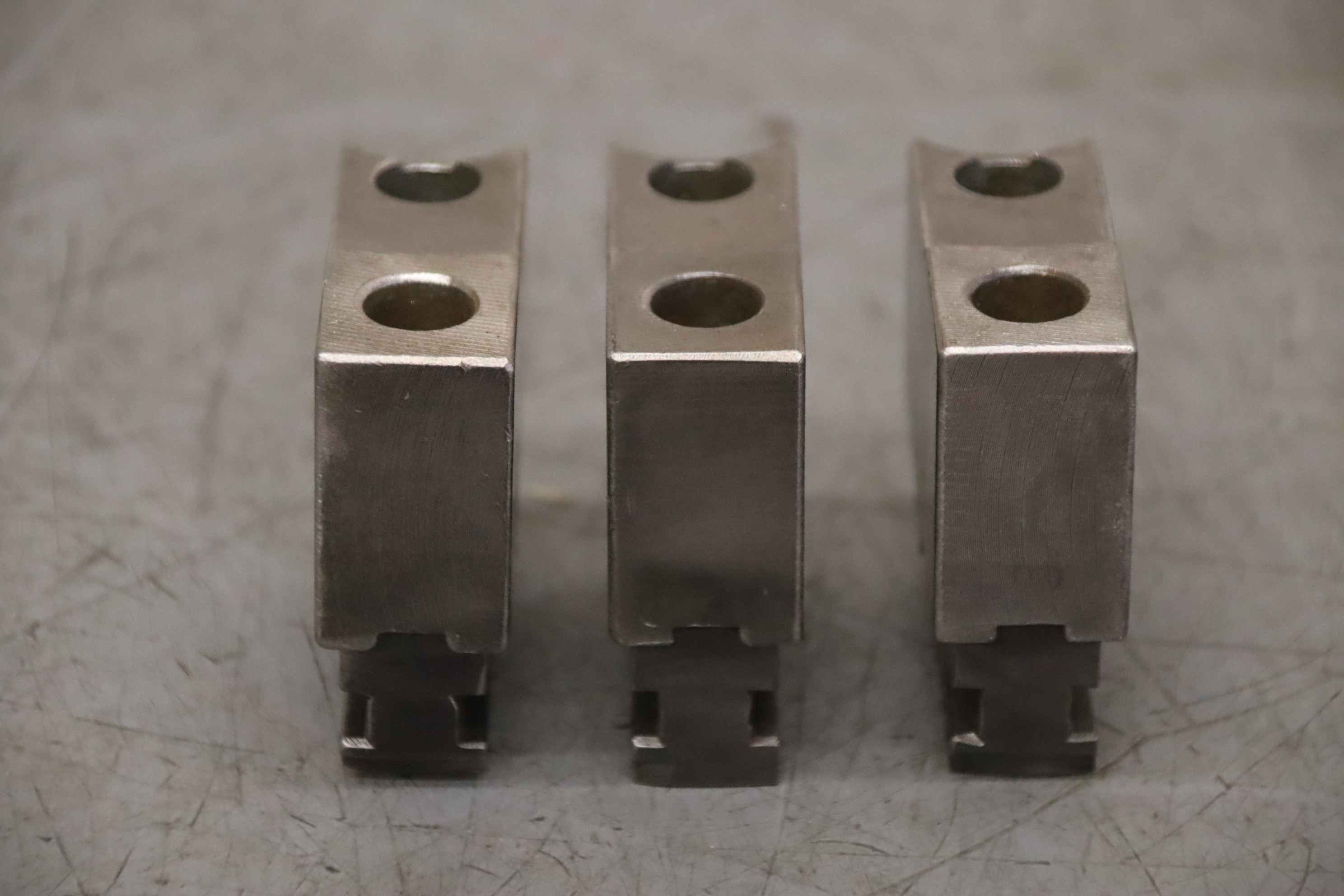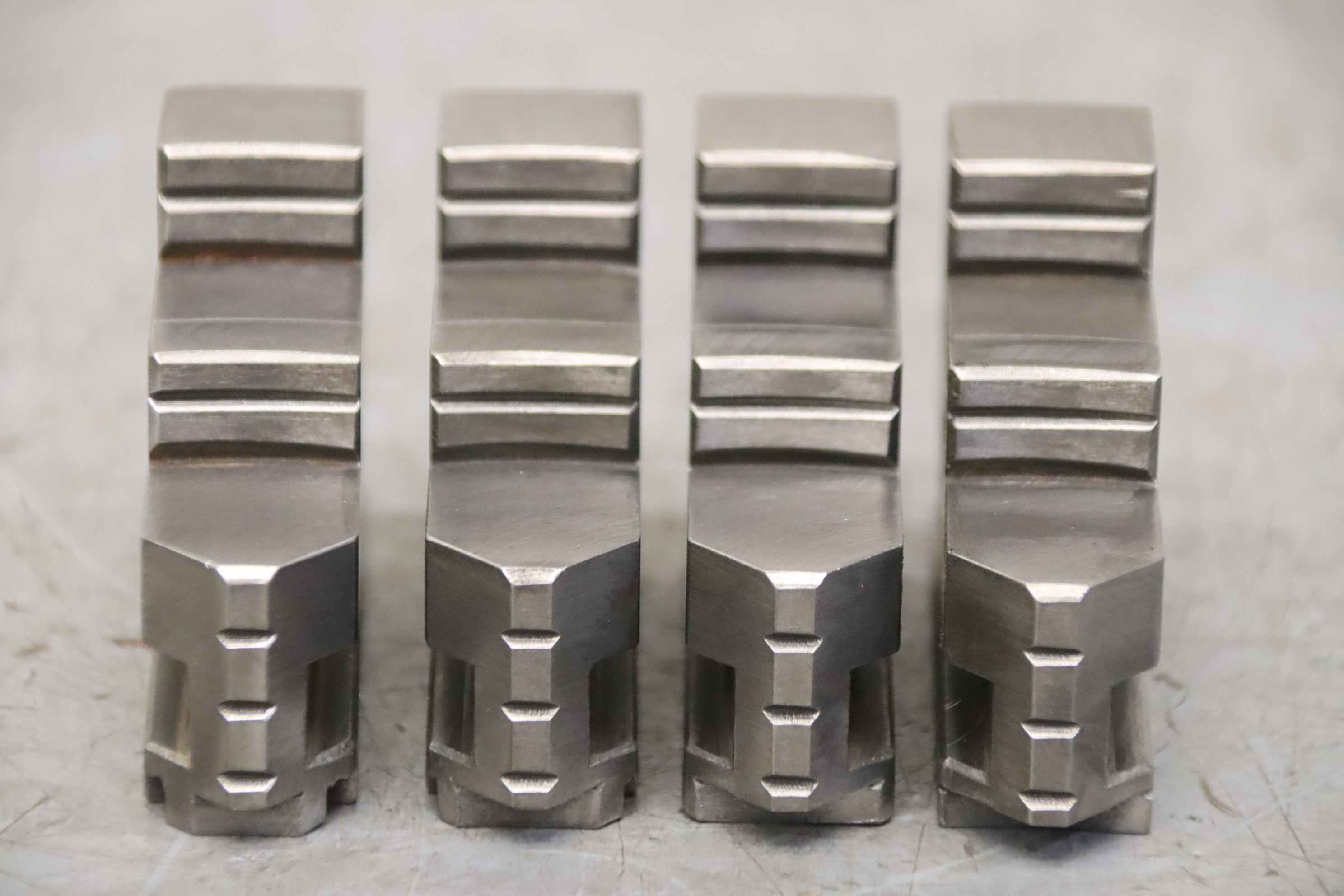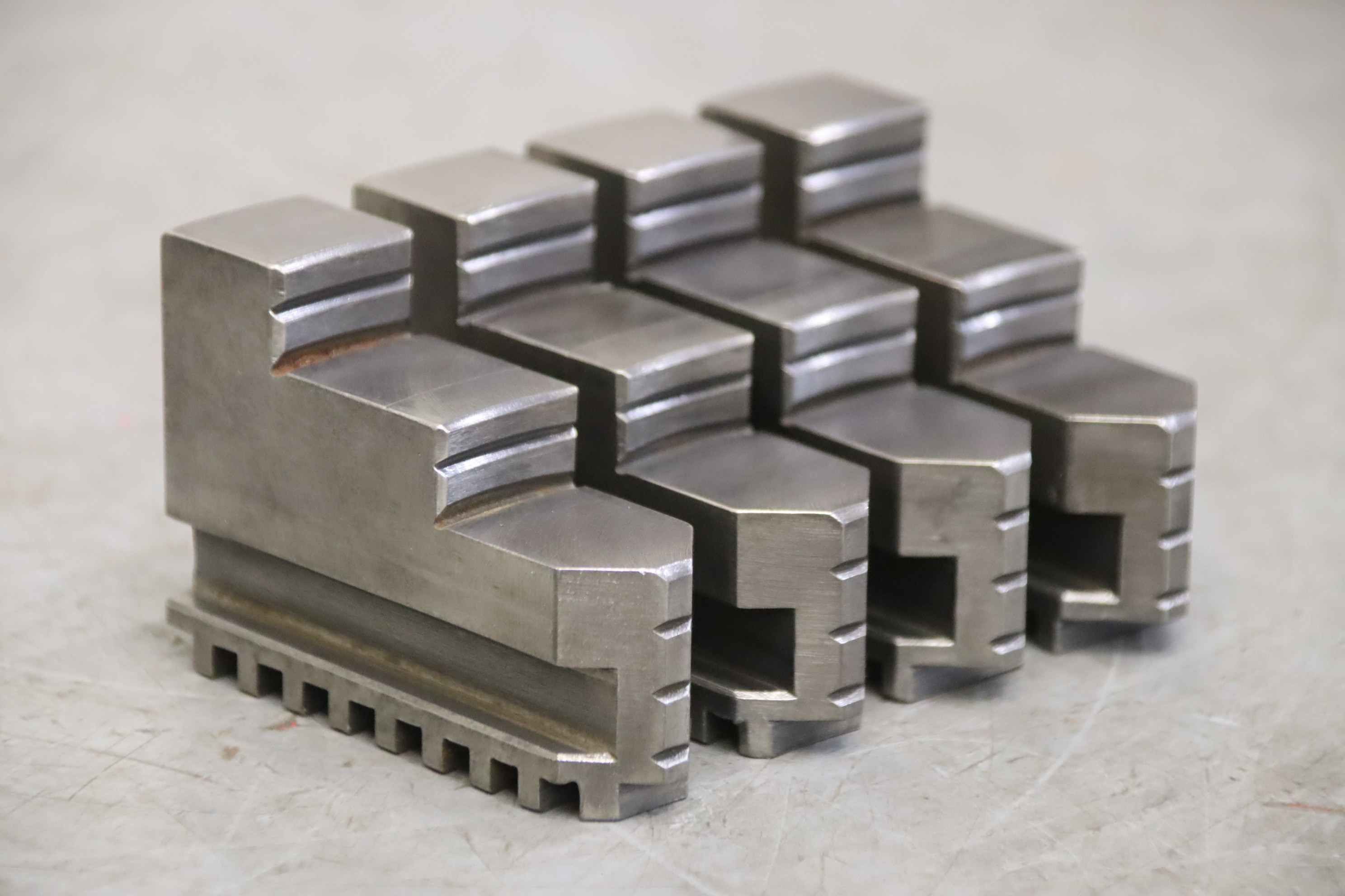Interchangeable jaws, top jaws, three-jaw chucks, segment jaws, clamping jaws, step block jaws, step top jaws, block jaws, base jaws, 4-jaw set-Top jaws: 4-piece hard rotating jaw set-Jaw width: 21 mm-Dimensions: see photo technical. drawing-Quantity: 2 sets of interchangeable jaws available-Price: per set-Total dimensions: 76/85/H53 mm / 77/85/H51 mm-Total weight: 1.6 kg / 1.5 kg
