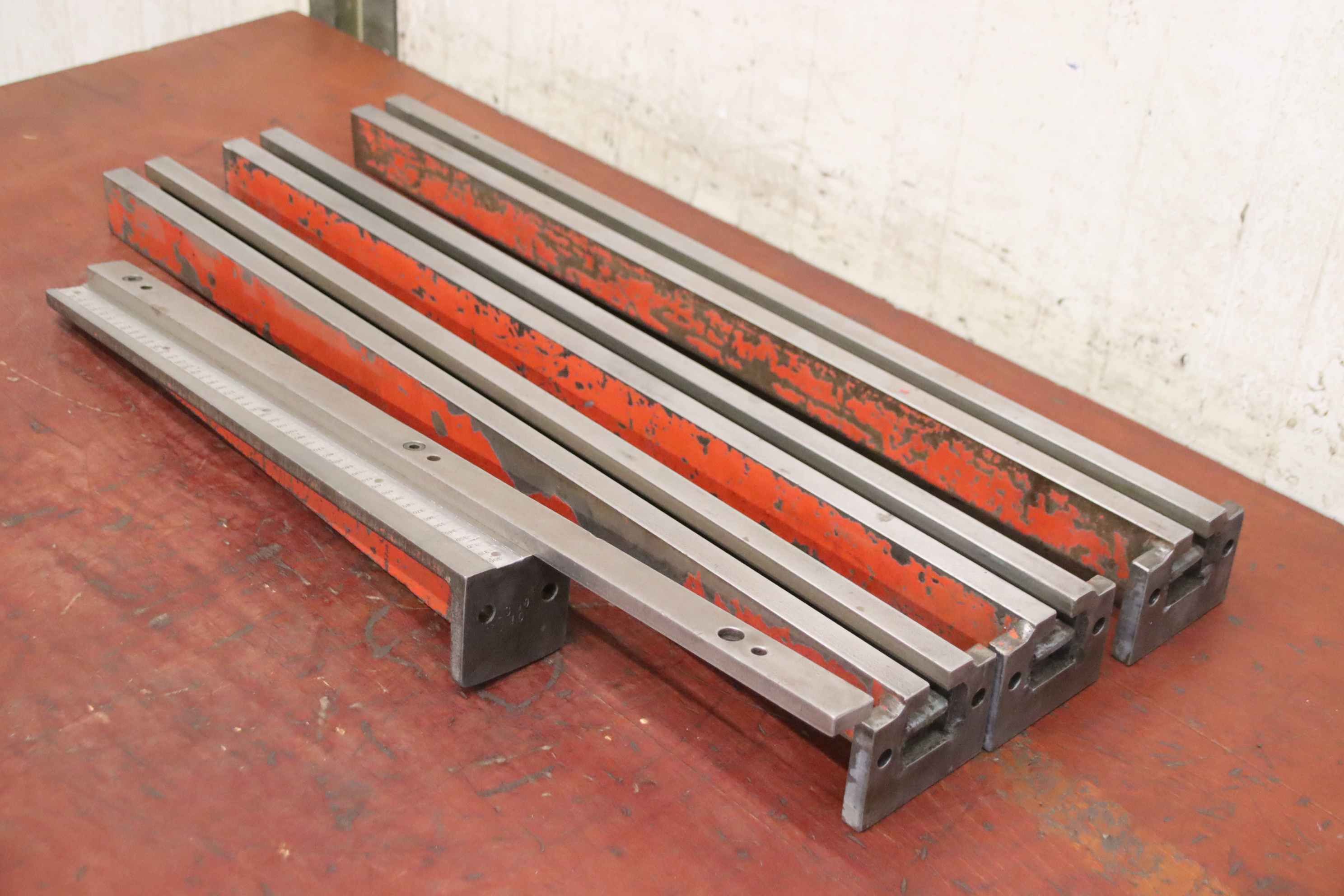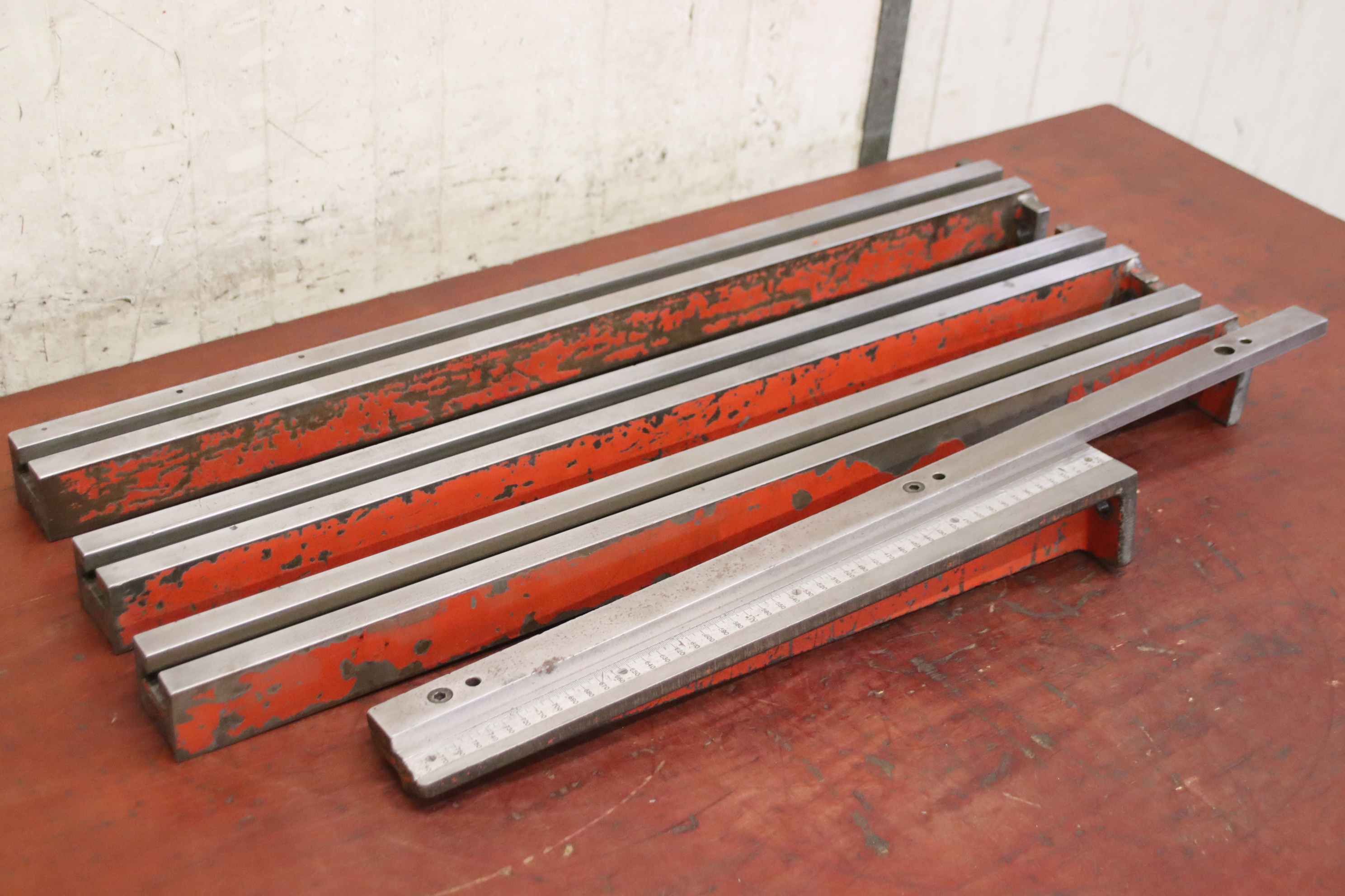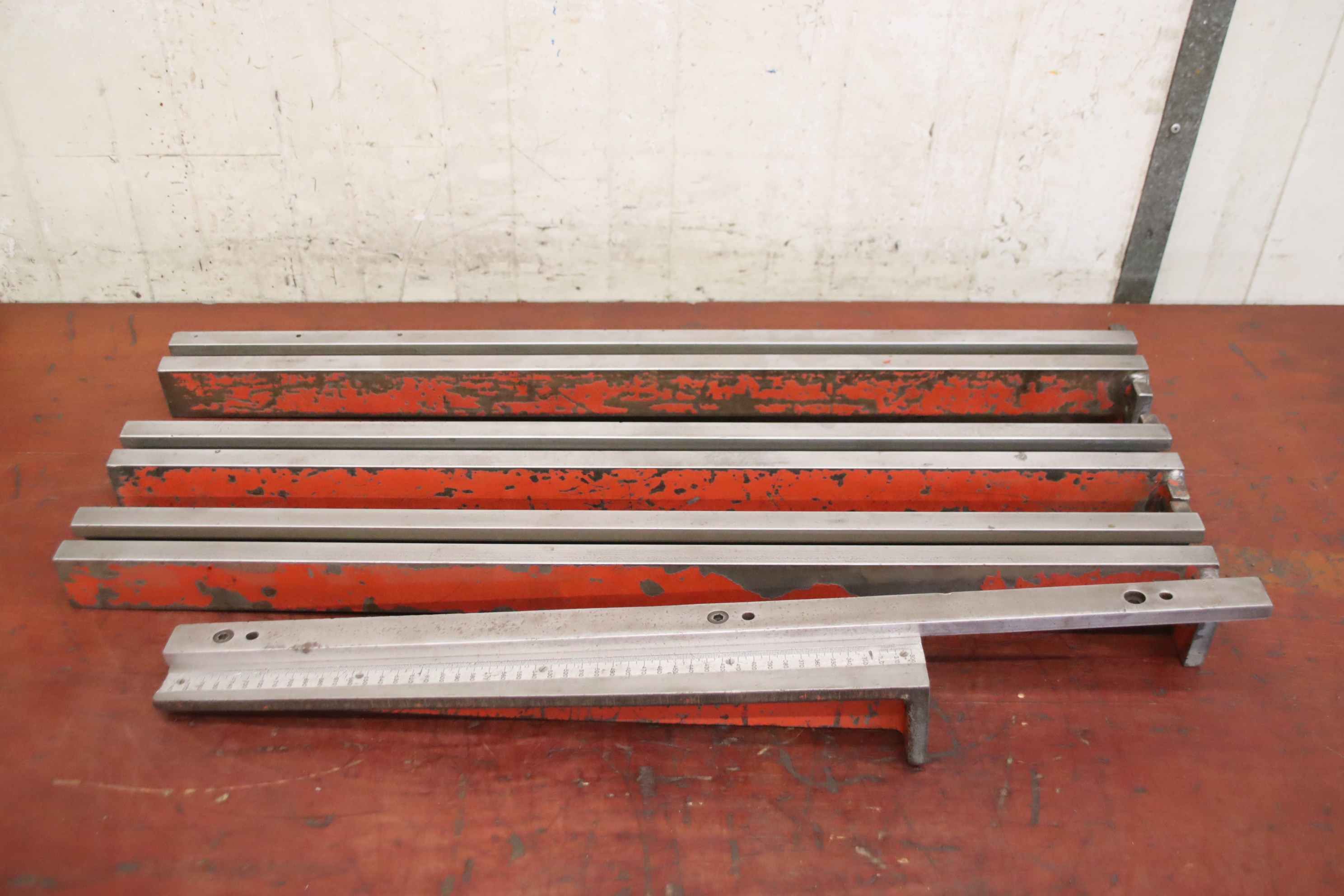 Stop for press brake, bending machine, guillotine shears ..., clamping angle, clamping aid,.Support rail for press brake, bending machine, guillotine shears, stop rail, clamping rail-Manufacturer: RAS, support rails from guillotine shears type RAS 53.60-Dimensions: 805/100/H80 mm / groove width 16 mm 3 pieces-Dimensions: 720/75/H85 mm with stop rail 1 piece-Delivery/Price: complete-Transport dimensions: 805/350/H80 mm-Weight 34.8 kg