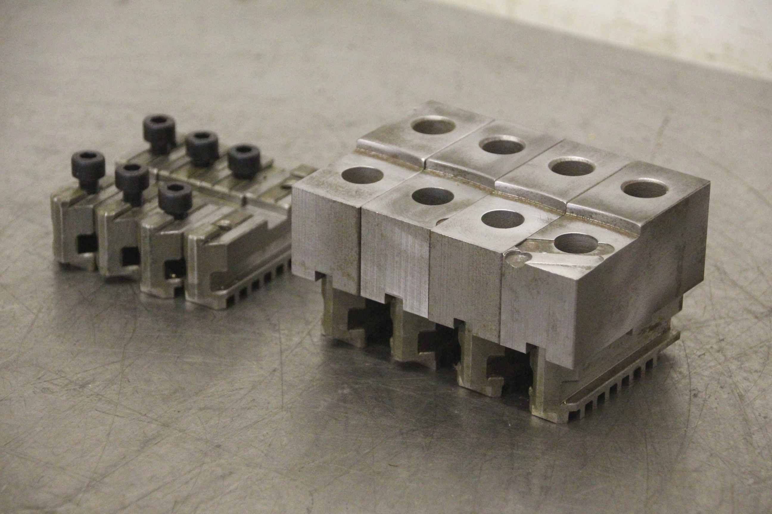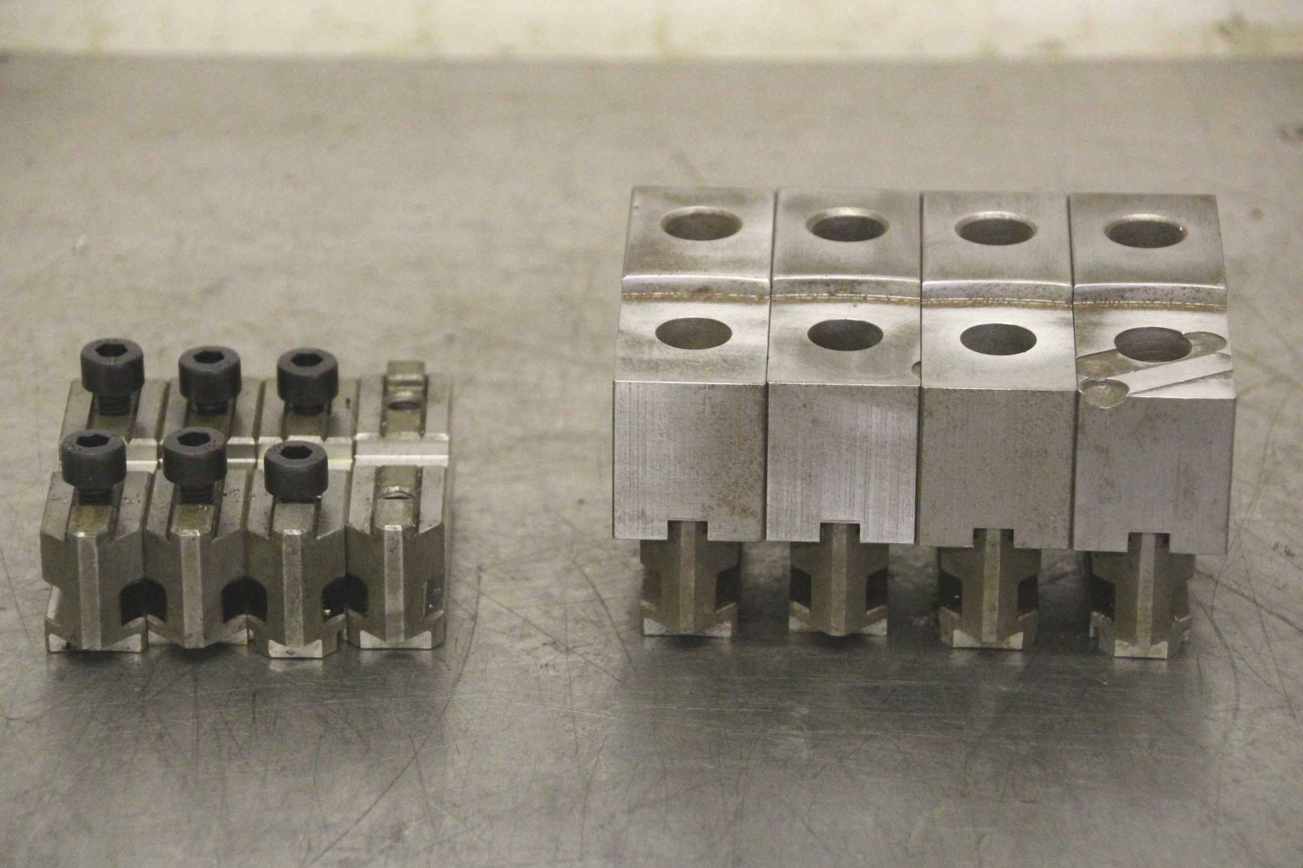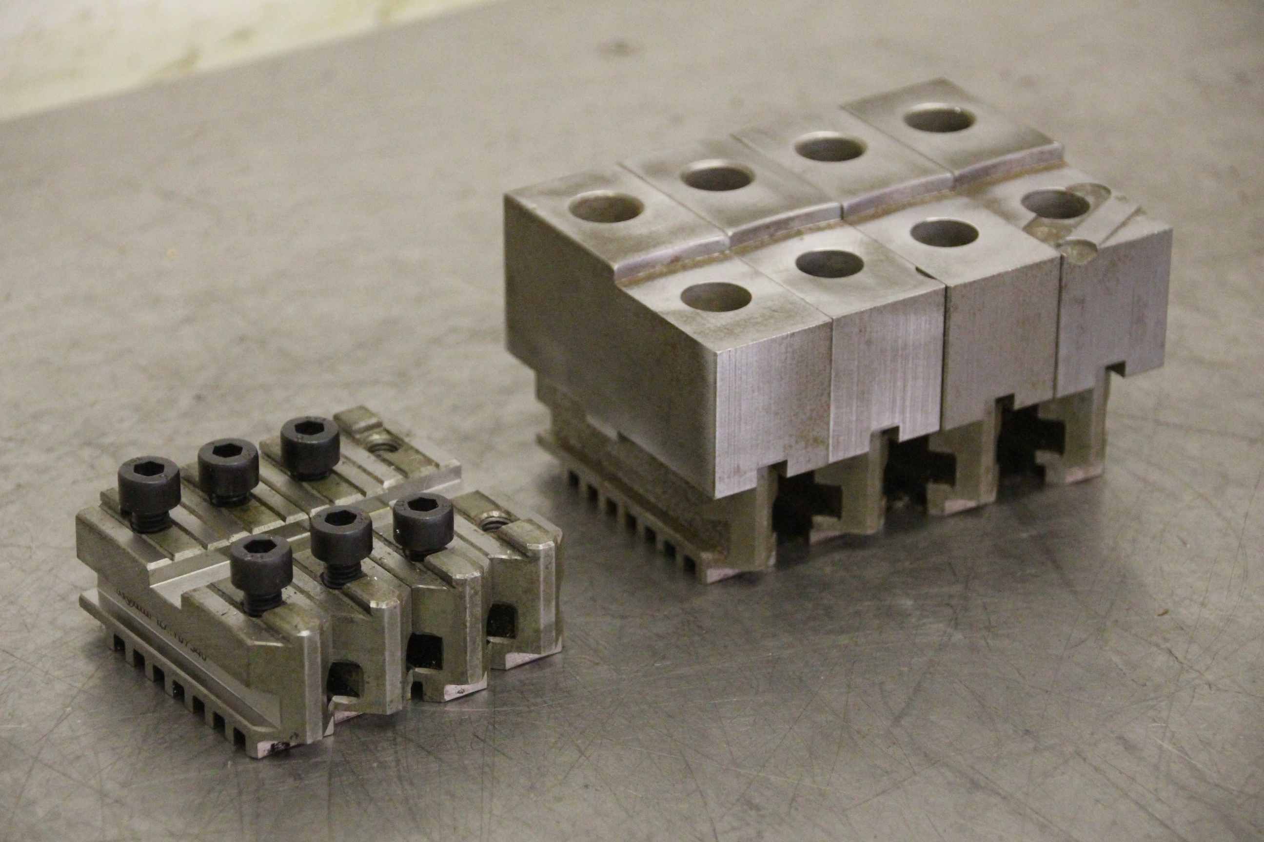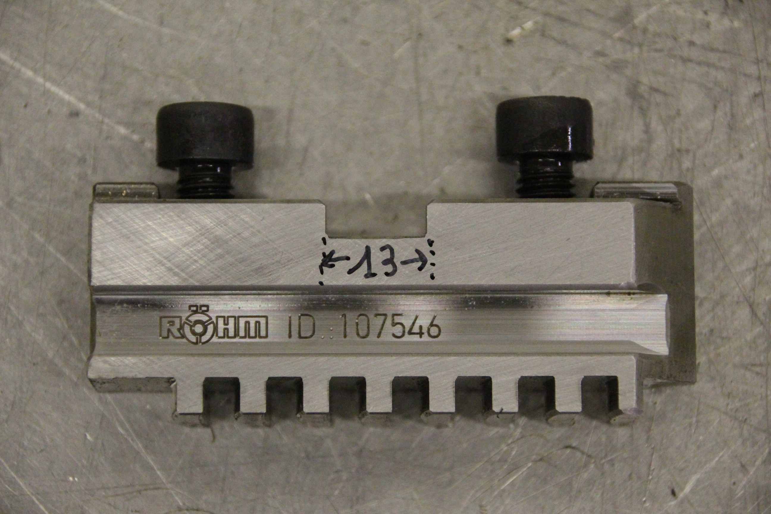 Interchangeable jaws, top jaws, three-jaw chucks, segment jaws, clamping jaws, step block jaws, step top jaws, block jaws, base jaws, 4-jaw set-Manufacturer: Rohm, base jaws for four-jaw chuck 2 set-Type: ID.: 107546 jaw width 20 mm-Dimensions: see photo techn. drawing-1 set: with soft top jaws, width 30mm-Price/sale: only complete-Dimensions: 200/90/H70 mm-Weight: 4.7 kg