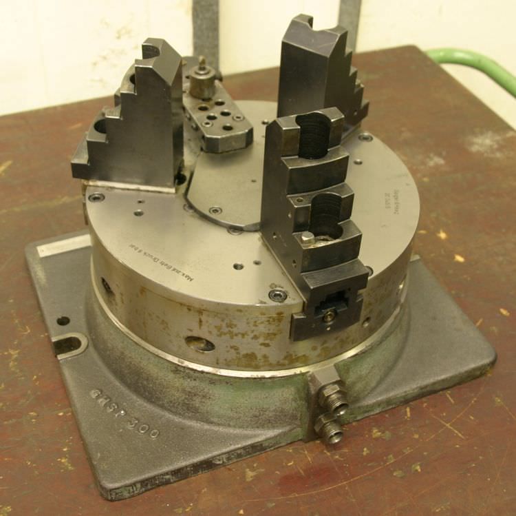 Key bar chuck, three-jaw chuck, three-jaw lathe chuck, power chuck, pneumatic chuck -Bake -Chuck size: Ø 300 mm -with base plate: 400 x 330 mm -Jaw height: 125 mm -Foot switch available for an additional charge -Number: 2 power chucks available -Price: per piece -Dimensions: 400/330/H285 mm -Weight: 84 kg