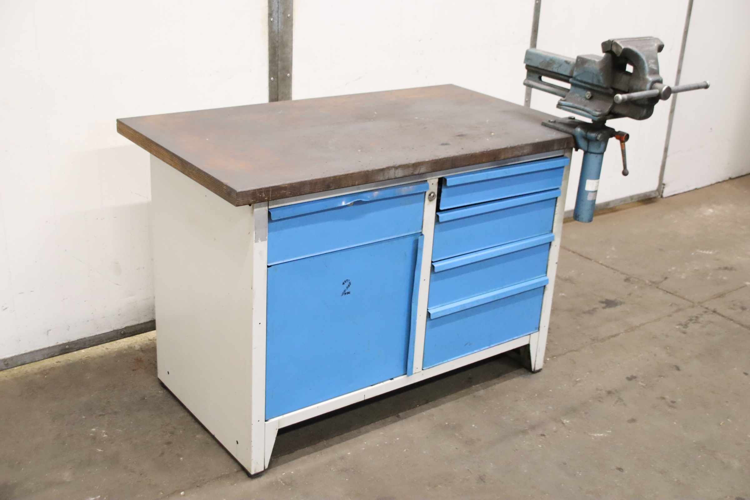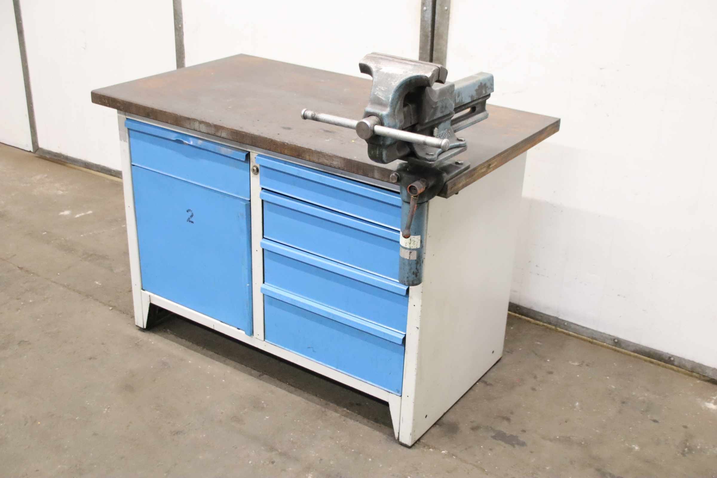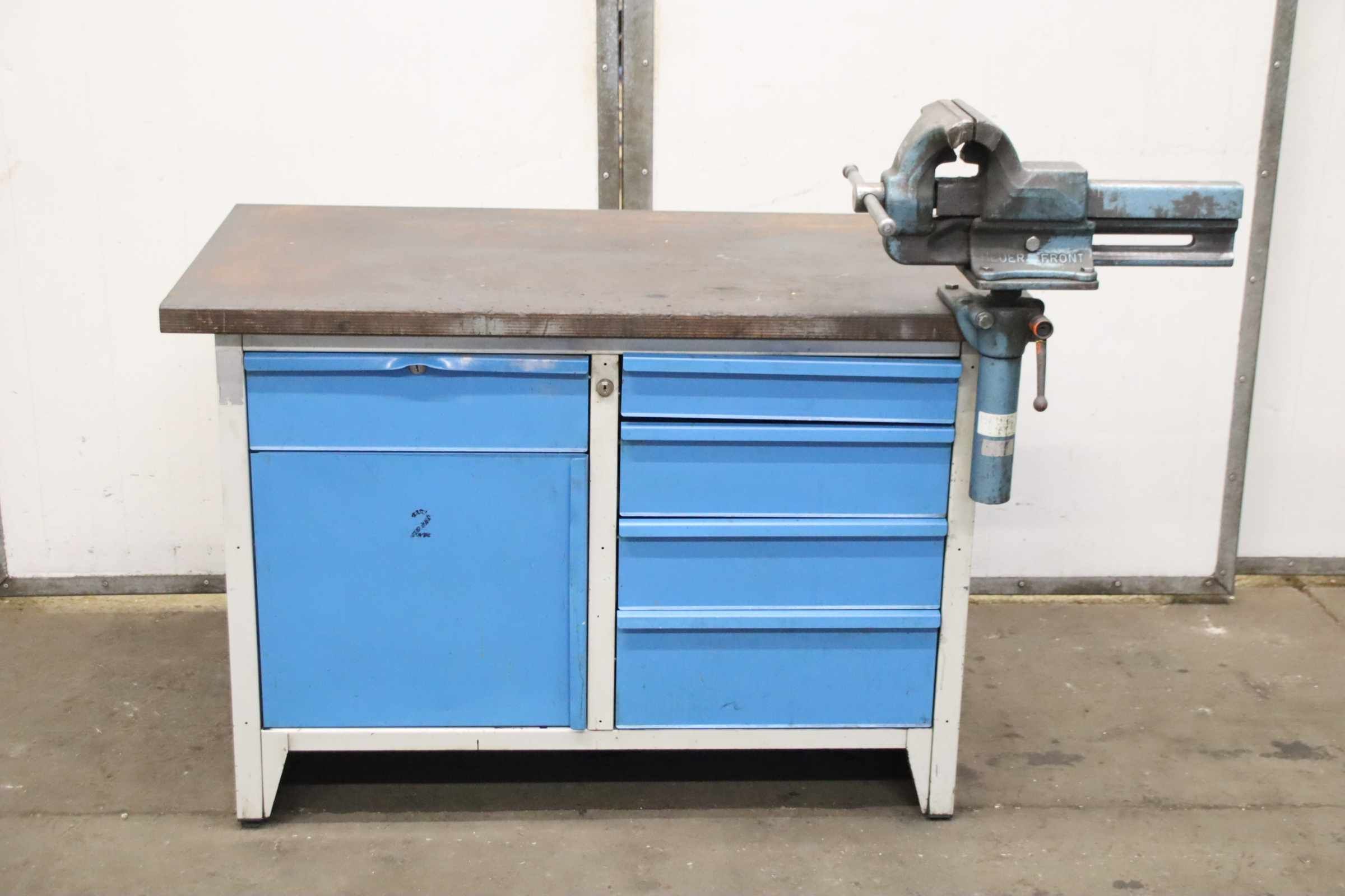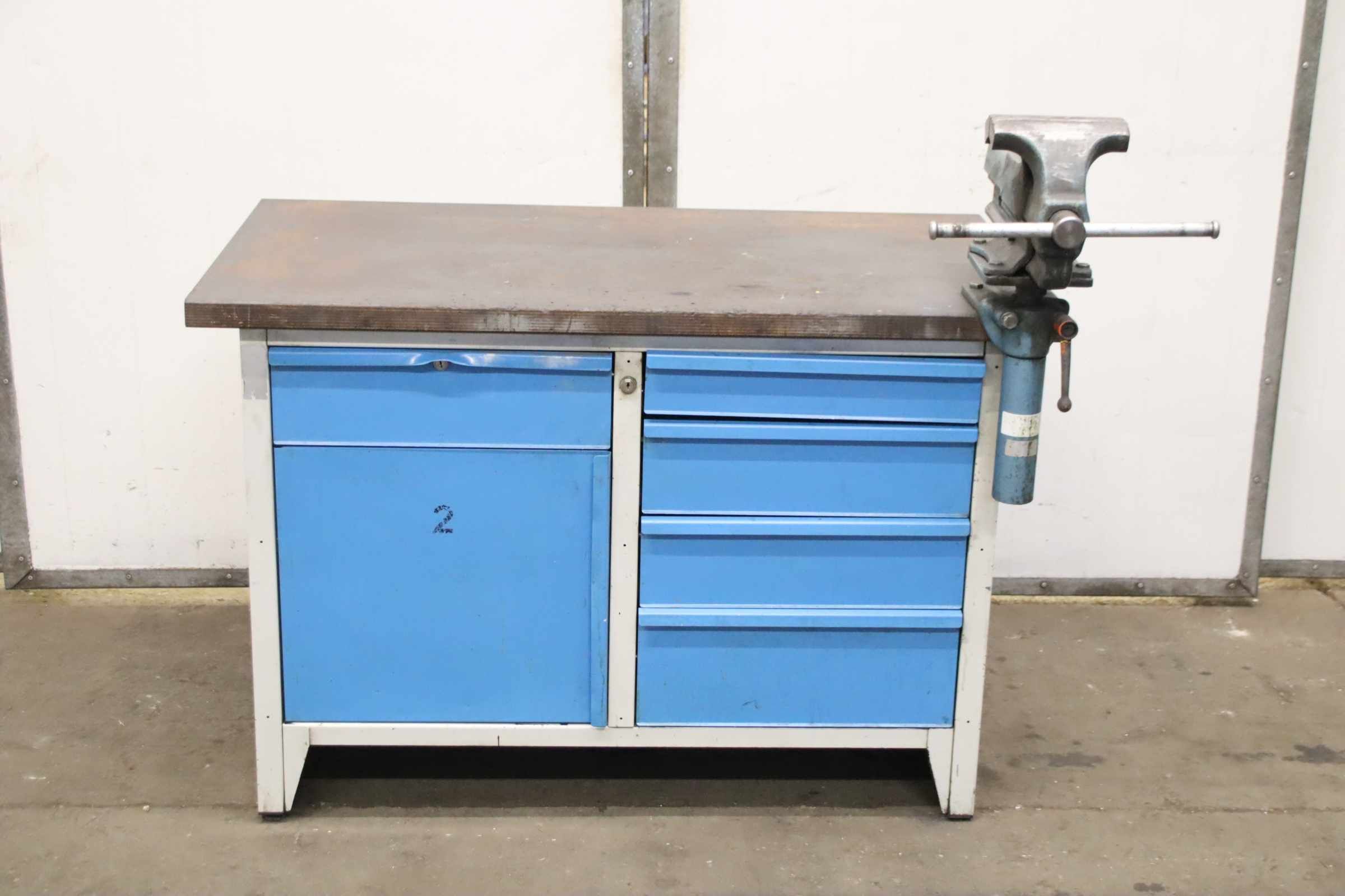 Workbench, work table, assembly bench, assembly table, work table -Manufacturer: Lista, workbench with vise / solid construction with drawers -Worktop: approx. 1250/700/H850 mm -Drawers/Cabinet door: lockable, without key / Layout/height see photos -Vice: Heuer Front, height-adjustable and rotatable -Clamping jaws: 180 x 30 mm, clamping range 230 mm -Transport dimensions: 1250/960/H1140 mm -Weight: 138 kg