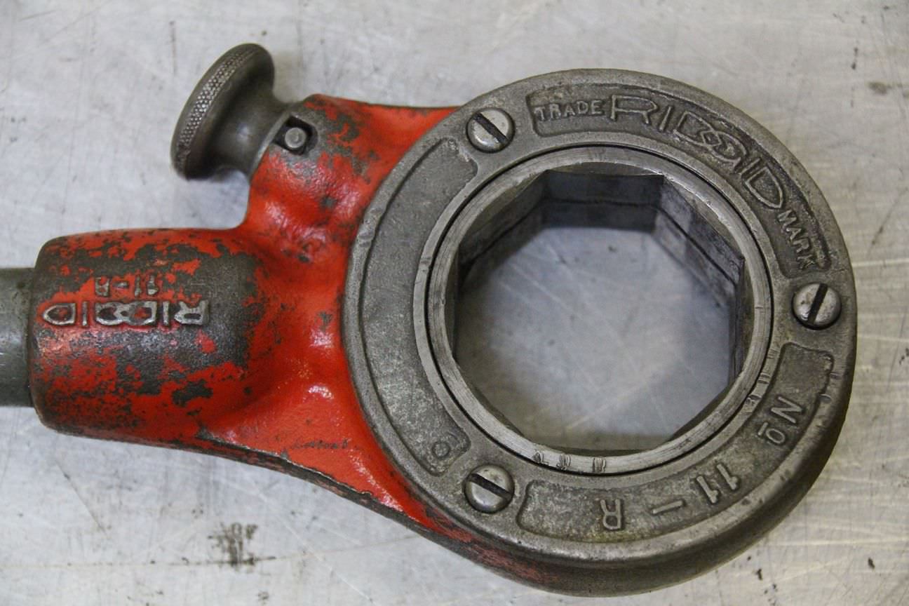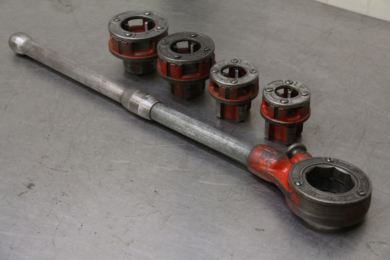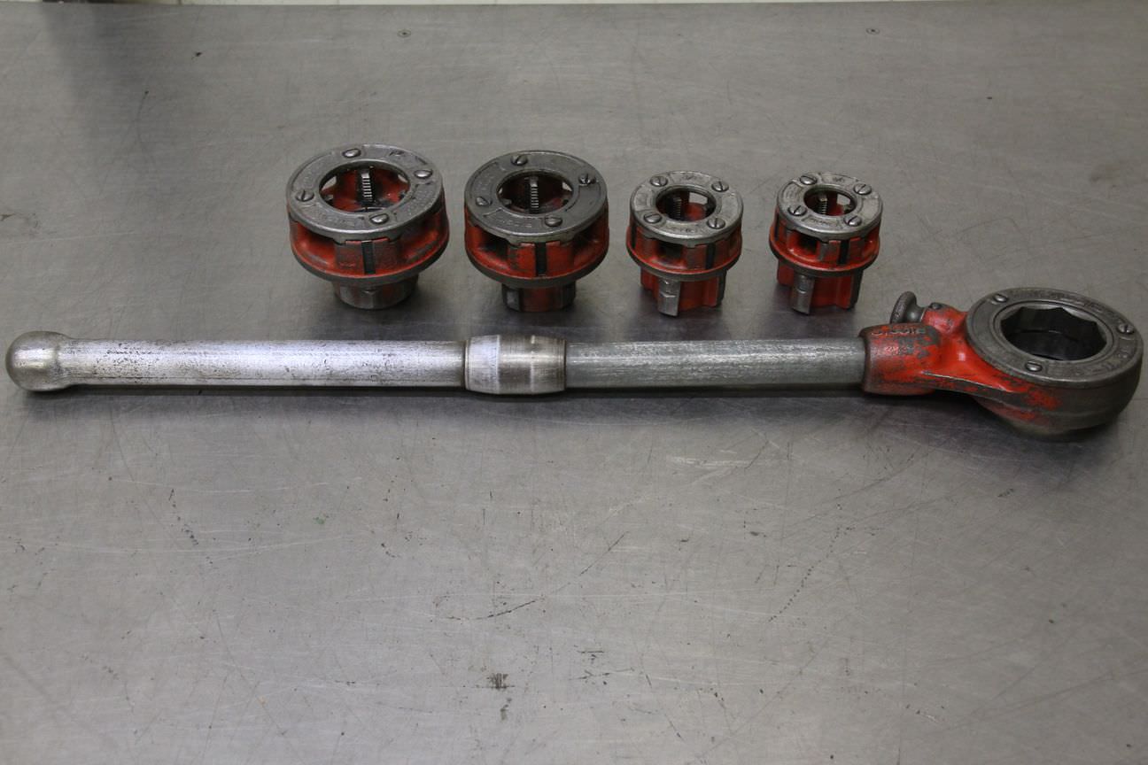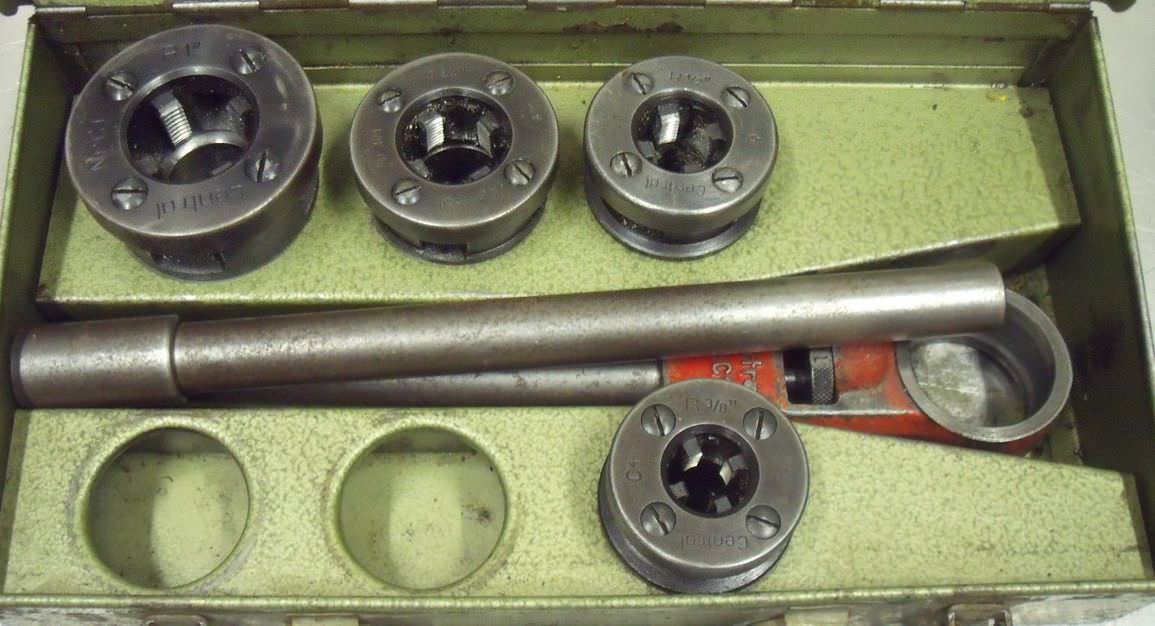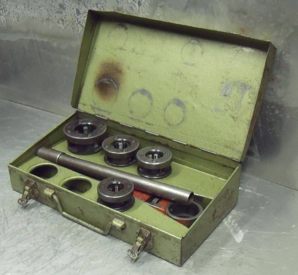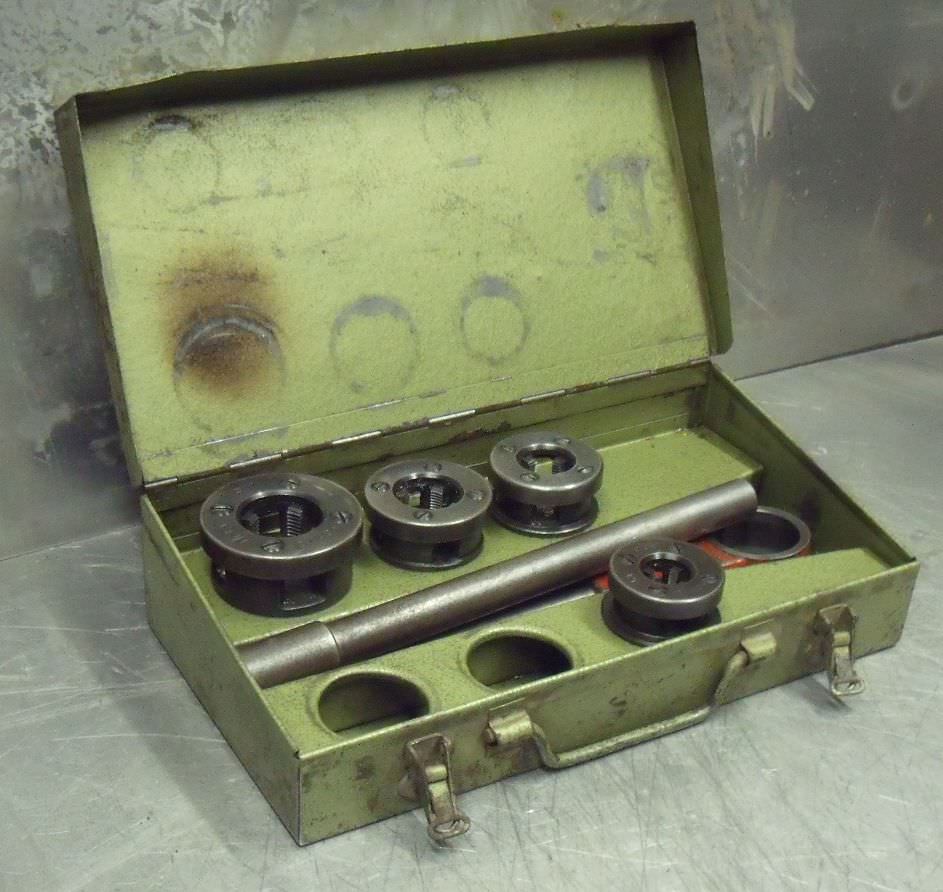Die set, hand pipe thread cutter, thread cutting machine, pipe thread cutter, pipe thread cutter, cutting head -for pipe size: max. 1 1/4 inch -4x cutting tips: 1/2 3/4 1 1 1/4 inch -Number: 1 set available- Price: per set -Dimensions: -Weight: 6.6 kg