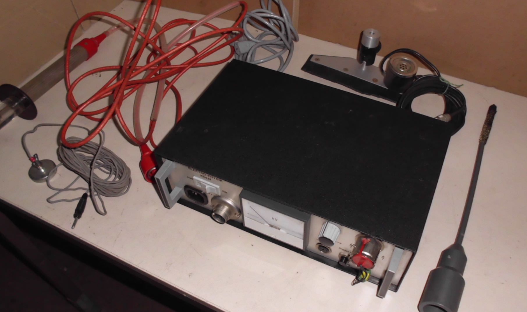 Pore finder, pore finder, surface tester -portable high-voltage pore detector -Pore locator is an ideal device for detecting pores and imperfections -in dielectric (electrically insulating) coatings -such as paints, enamels, plastic layers on all metals and concrete. -Dimensions: 390/220/H260 mm -Weight: 7 kg