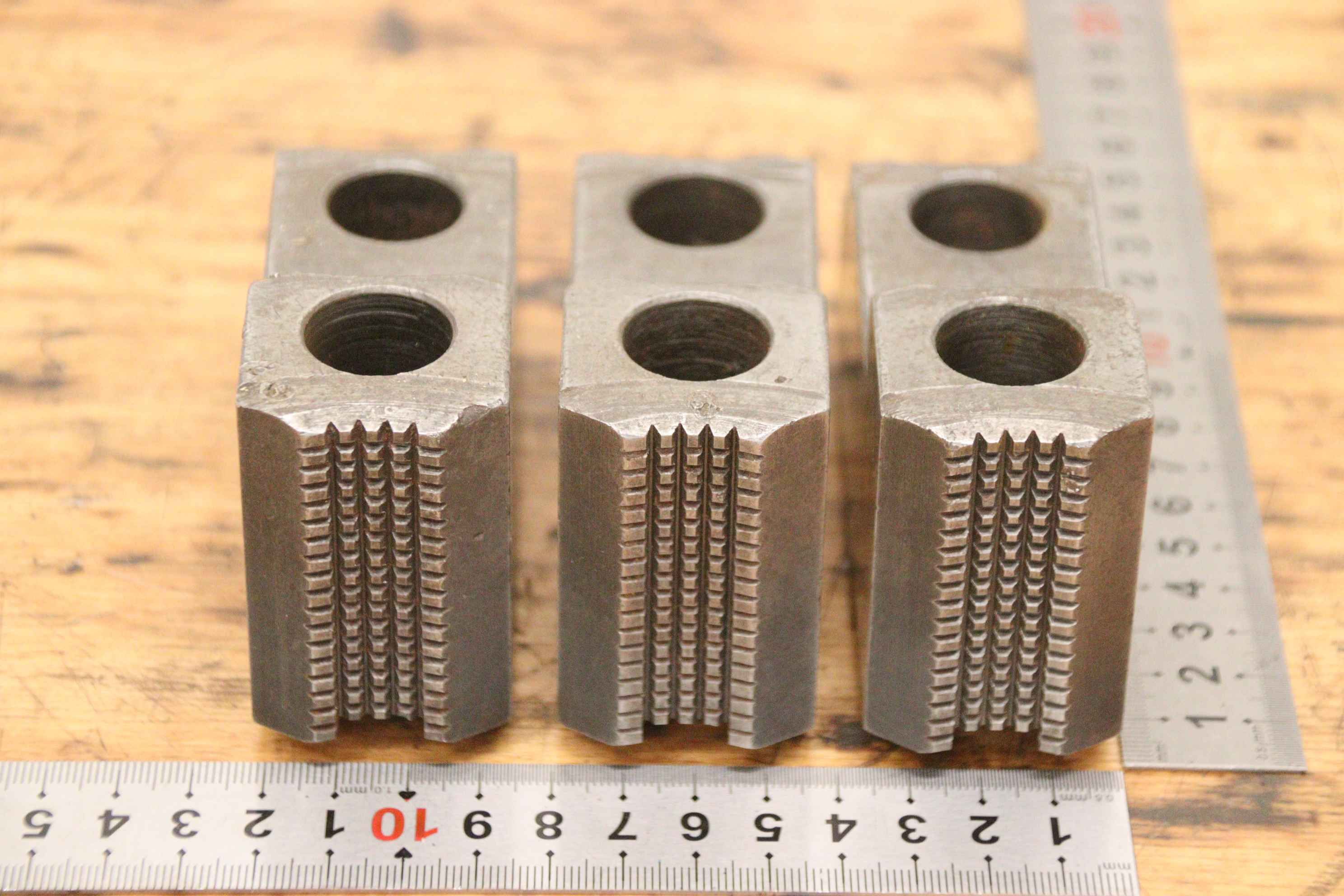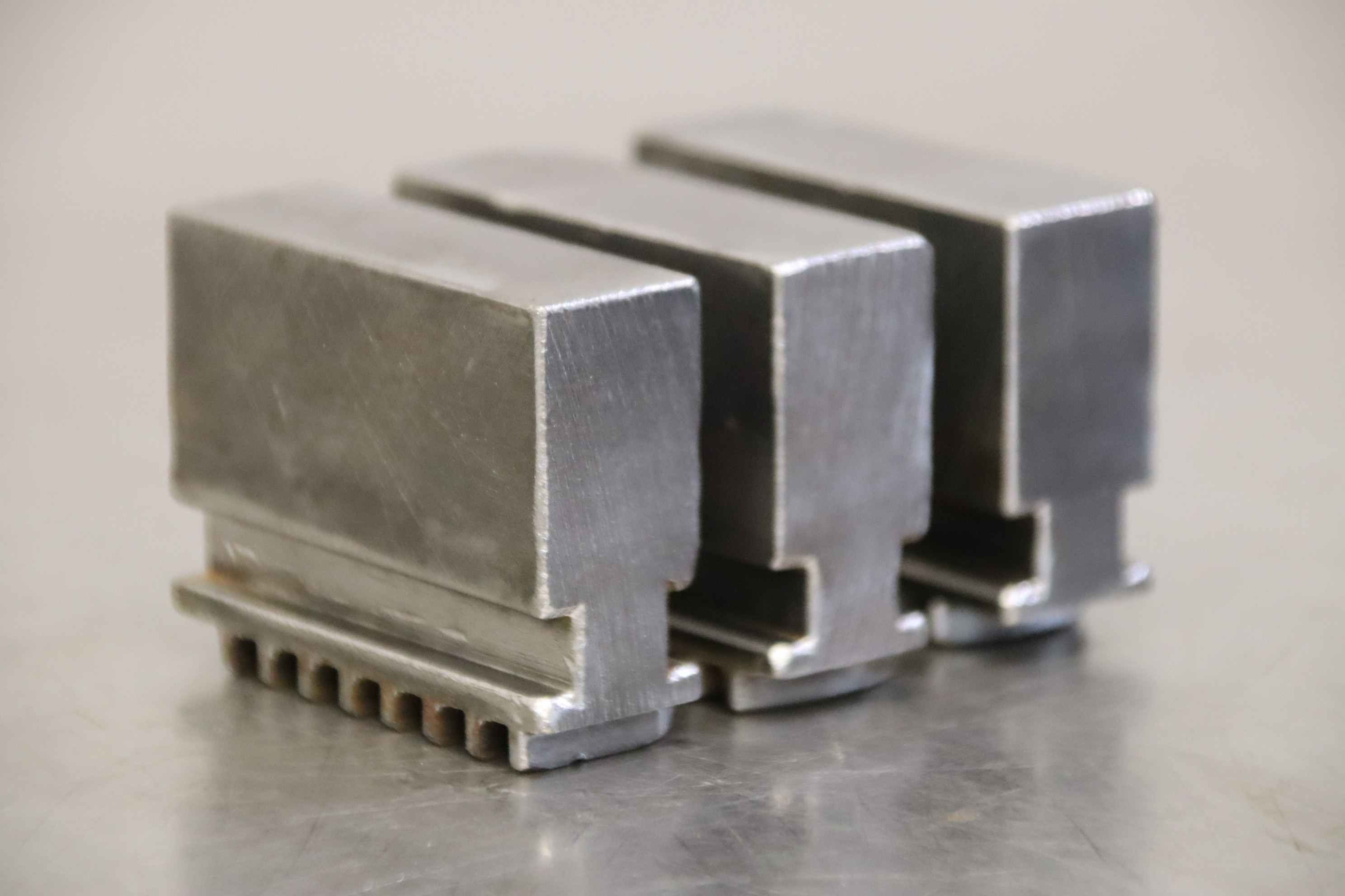 Interchangeable jaws, top jaws, three-jaw chuck, segment jaws, clamping jaws, stepped block jaws, stepped top jaws, block jaws, base jaws, 4-jaw set-Top jaws: Jaw set for three-jaw lathe chucks, soft-Jaw width: 18 mm-Dimensions: see photo techn. drawing-Total dimensions: 55/54/H42 mm-Total weight: 0,8 kg