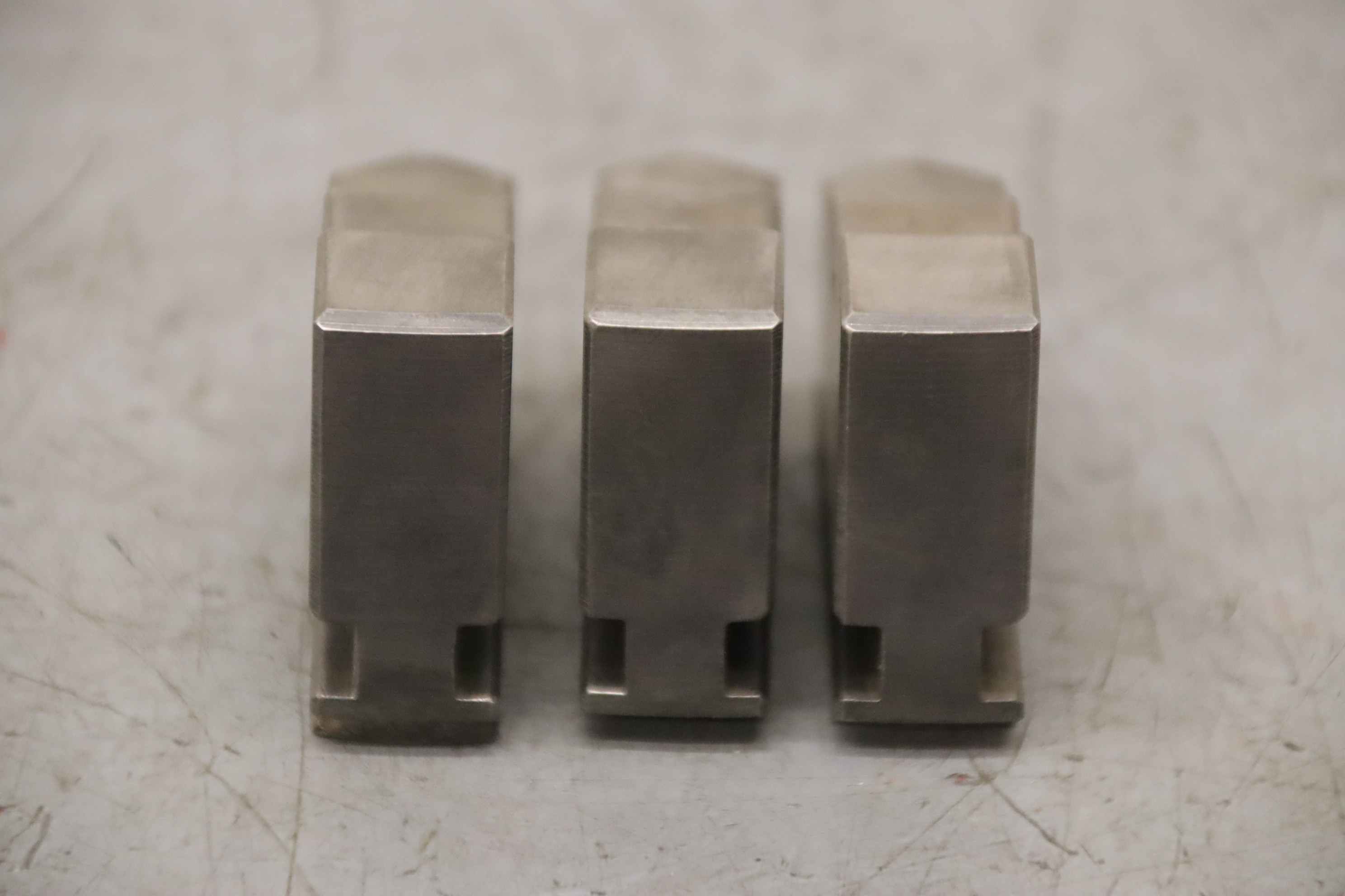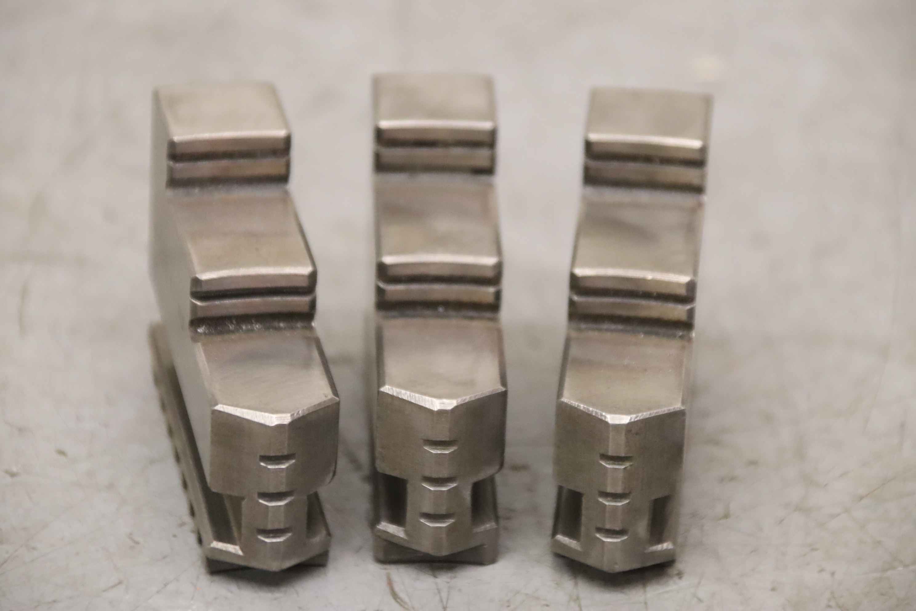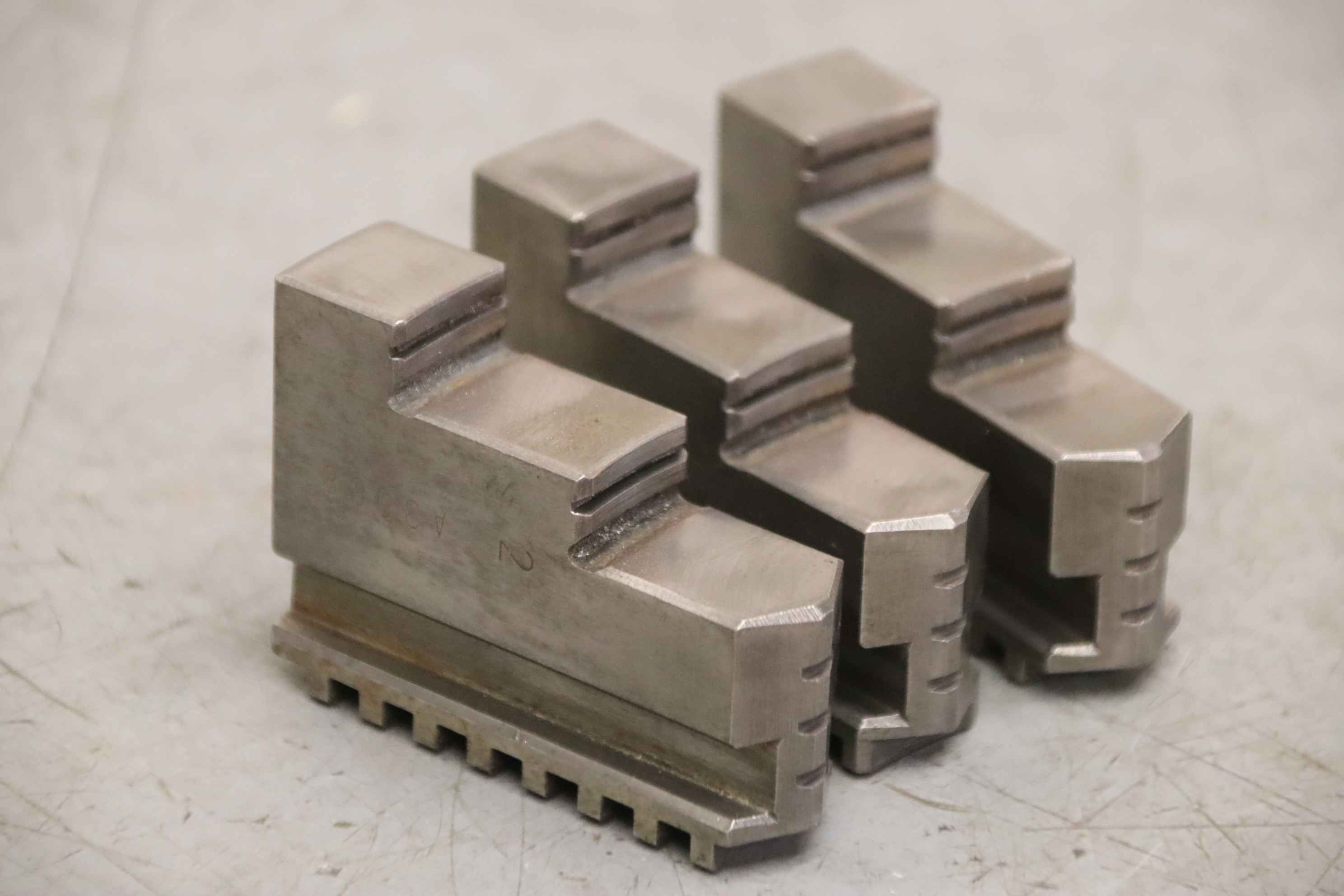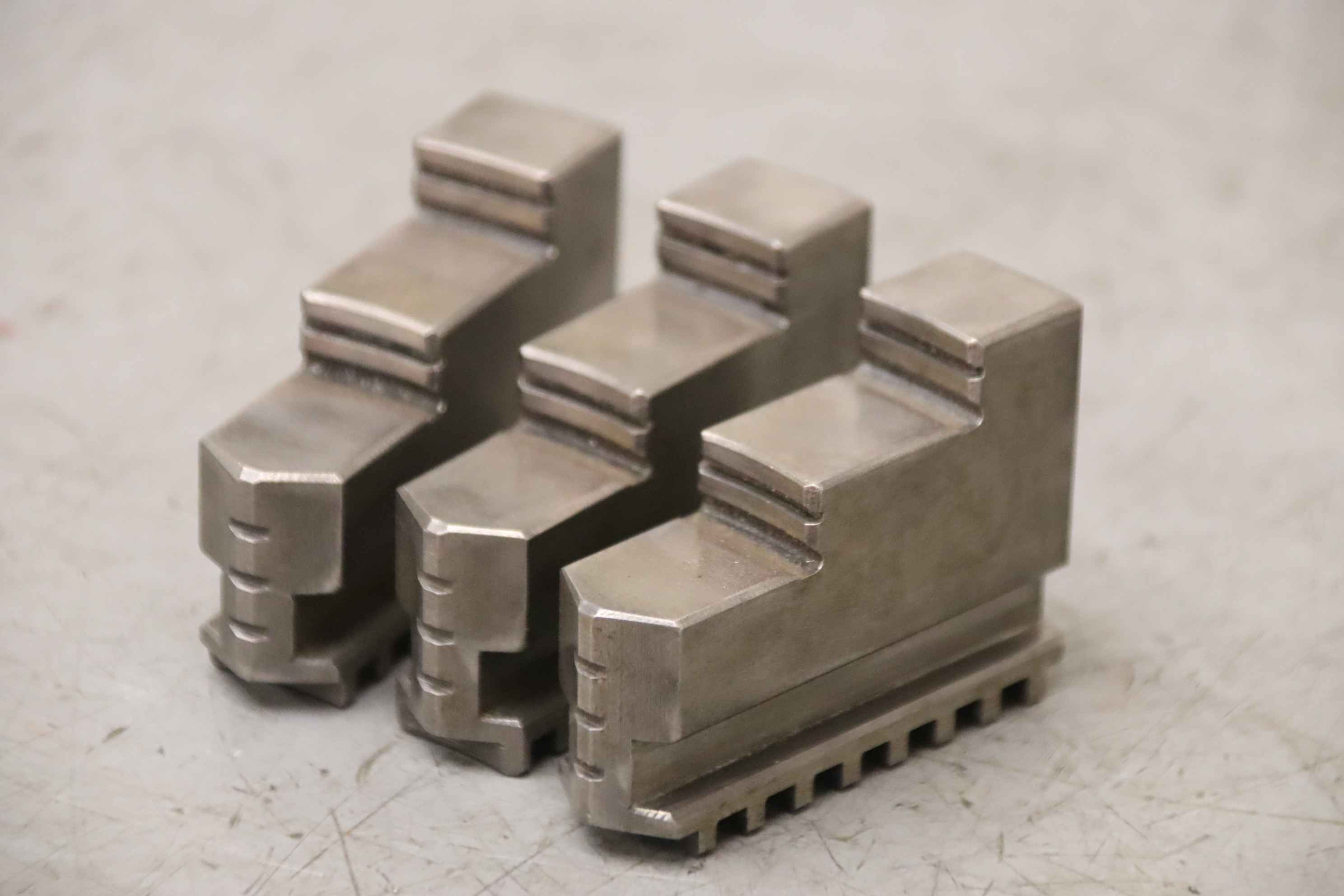 Interchangeable jaws, top jaws, three-jaw chucks, segment jaws, clamping jaws, stepped block jaws, stepped top jaws, block jaws, base jaws, 4-jaw set -Top jaws: Jaw set for three-jaw chuck, hard -Jaw width: 18 mm -Quantity: 2 sets of interchangeable jaws available -Price: per set -Overall dimensions: 64/54/H46 mm Total weight: 0.8 kg/set
