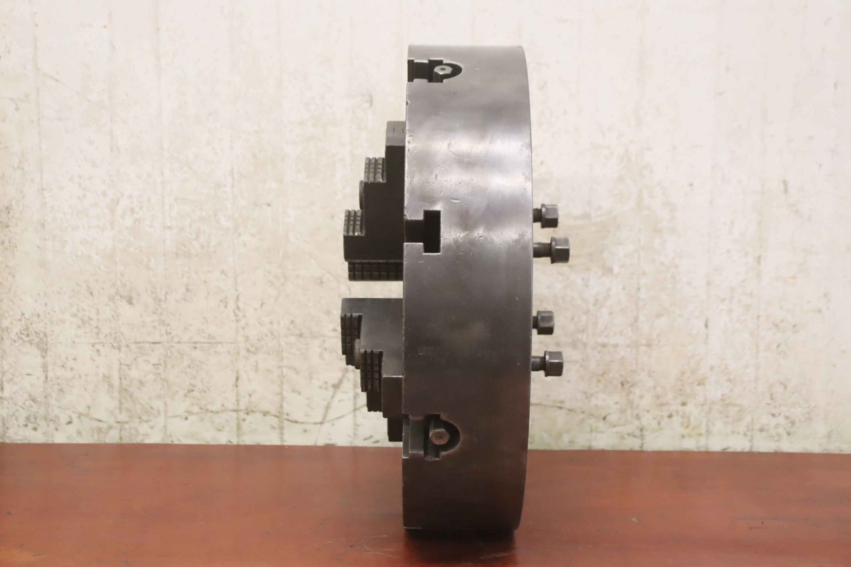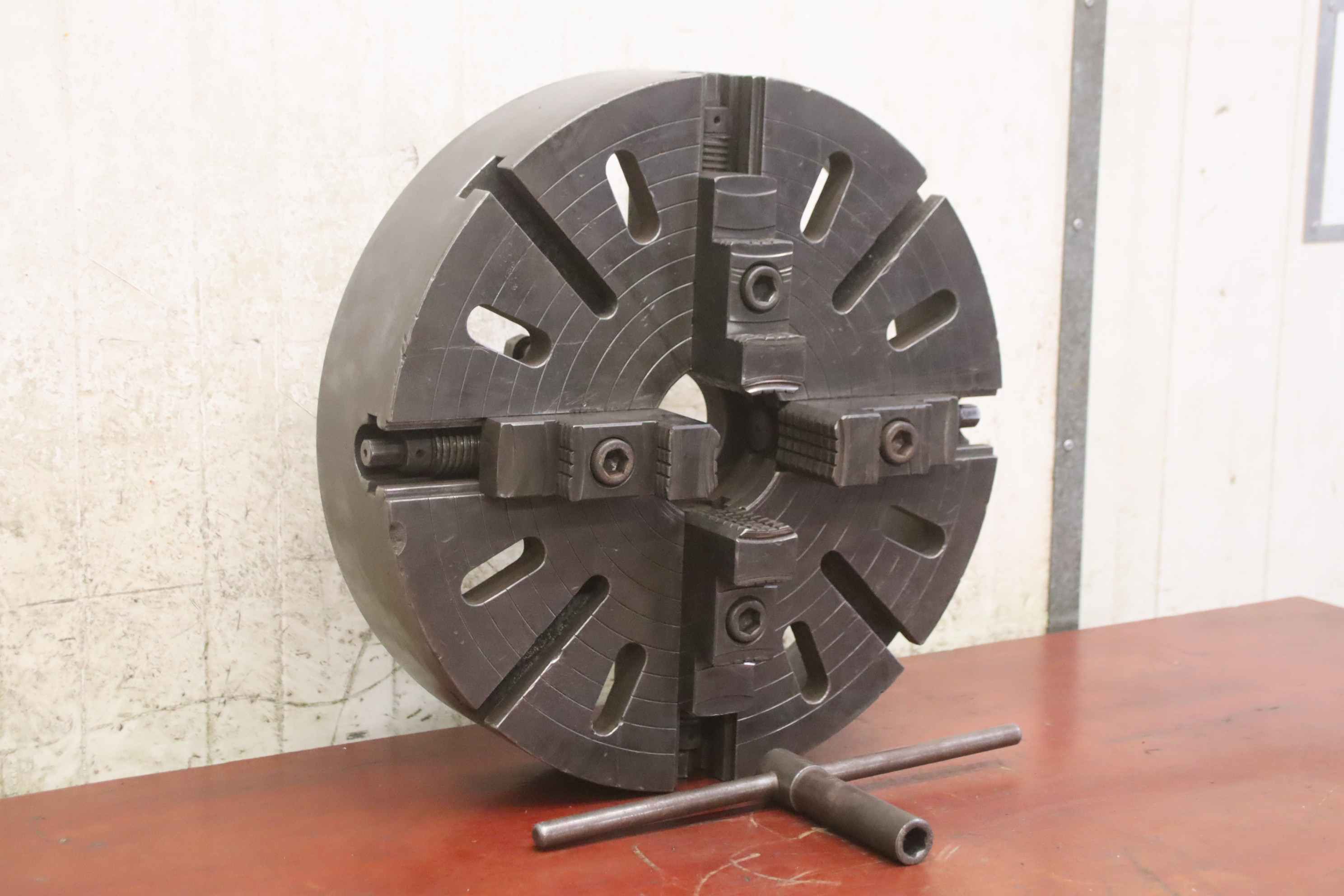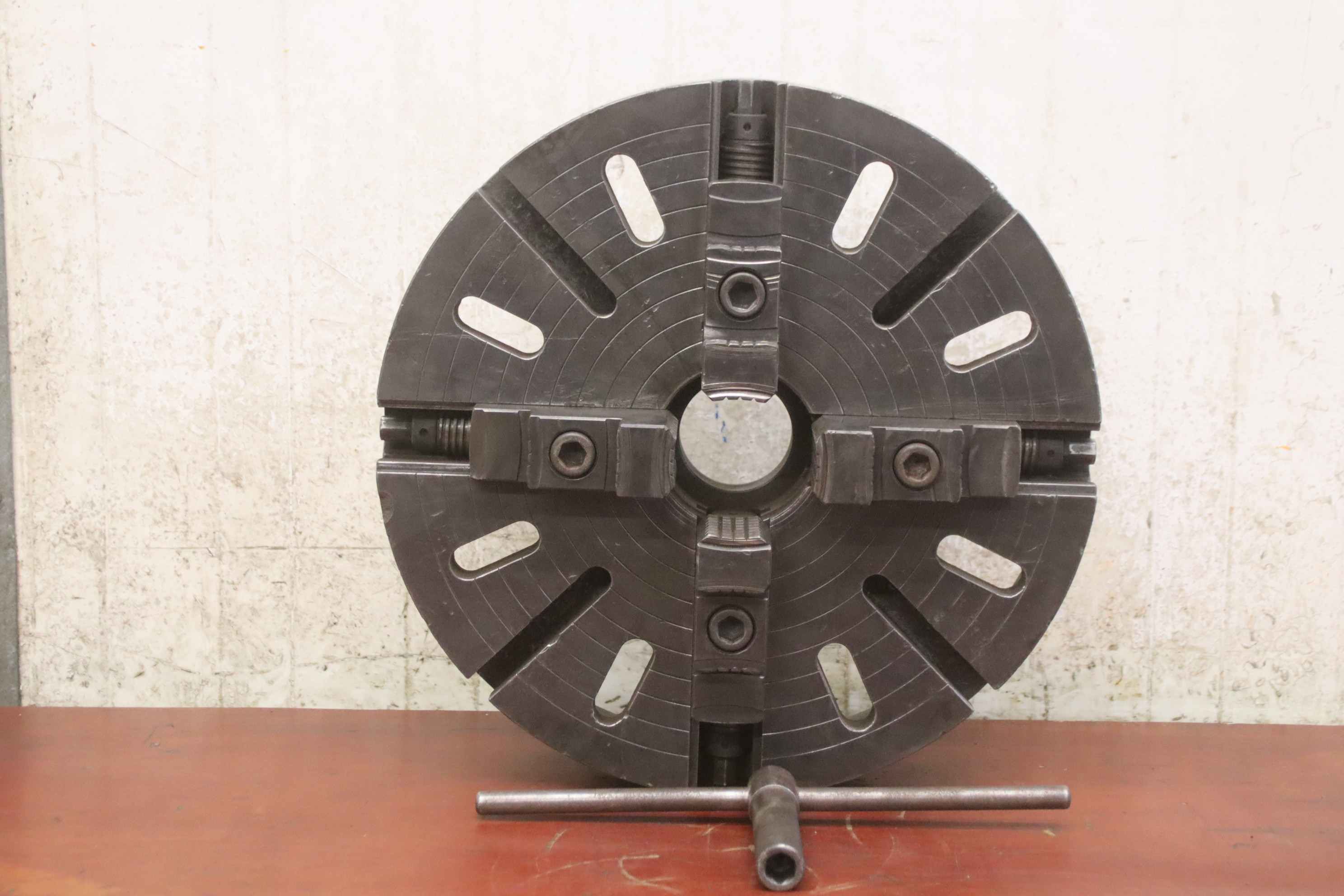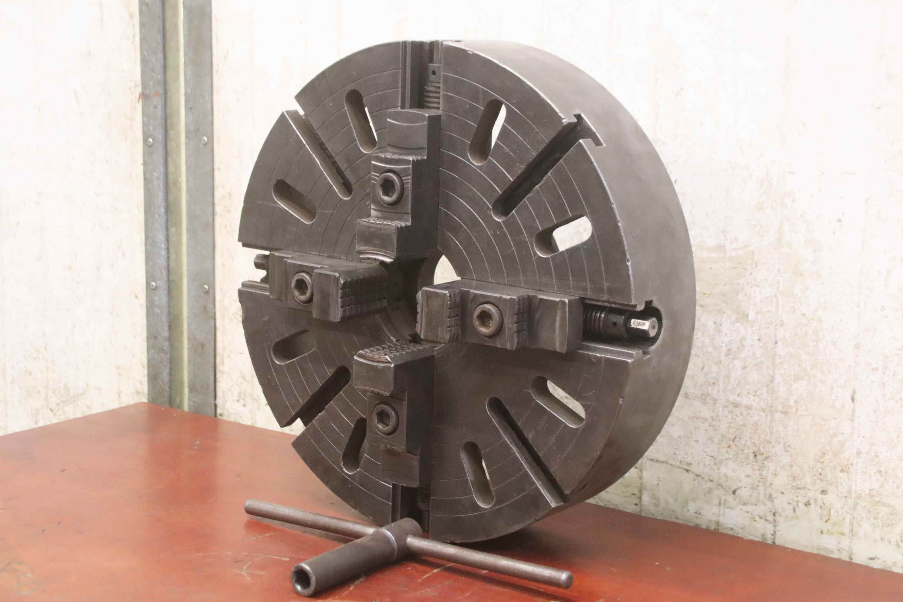 Faceplate, faceplate chuck, four-jaw chuck, facing chuck-Face plate: chuck size Ø 500 mm-Receptacle: short cone 8 (Ø 136-139 mm)-Hole circle: Ø 172 mm-Through hole: Ø 80 mm-Groove width: 20 mm-Weight: 86 kg