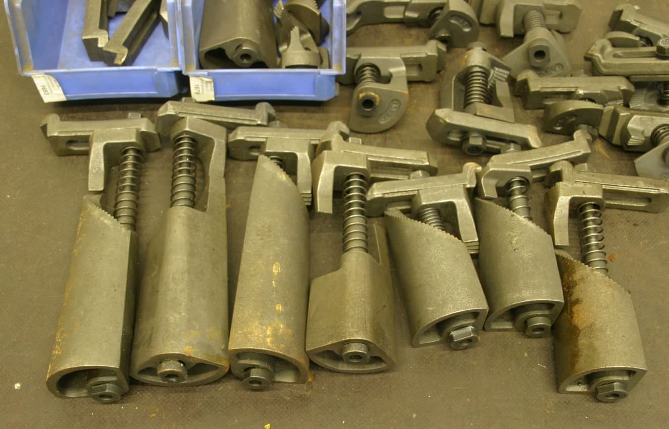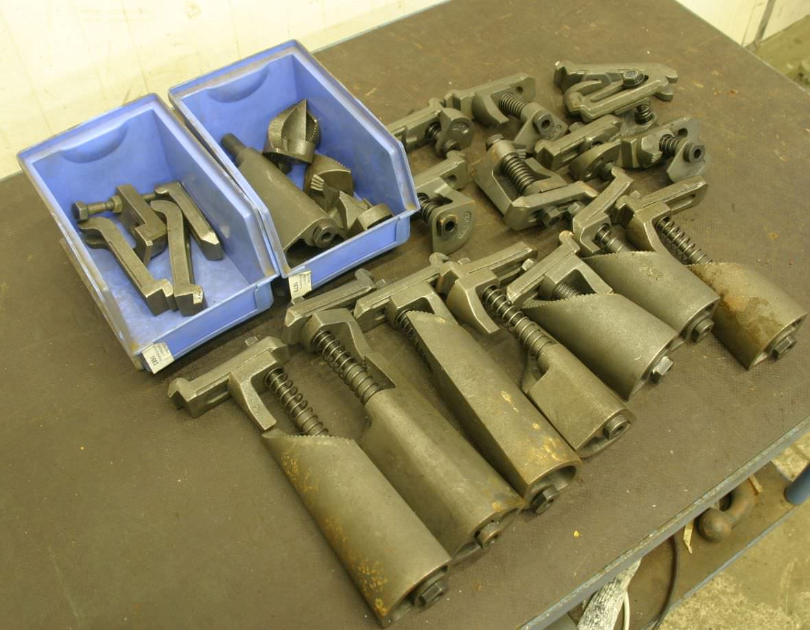 Step clamps, clamping devices, clamping jaws, deep clamping jaws, clamping supports, clamping tools -Clamping heights: 15-240 mm -for: 12 mm groove width -Quantity: 15x available Price: complete -Dimensions: 500/320/H200 mm -Weight: 30 kg