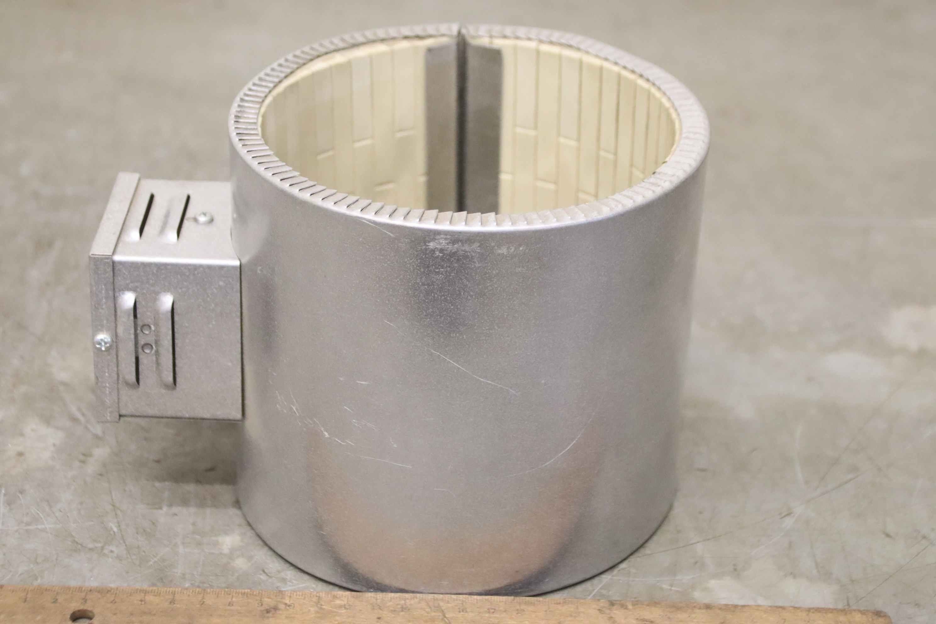Tubular heater, heating tape, heating sleeve, mica heater, cylinder heater, heating cylinder, ceramic heating tape-Manufacturer: Krauss Maffei, heating tape heating collar-Type: Ø200 x 160 mm-Item No.: 401 7184-Heating power: 5500 W-Voltage: 230/400V-Number: 1x heating tape available-Price per piece-Dimensions: 310/255/H160 mm-Weight: 4.0 kg