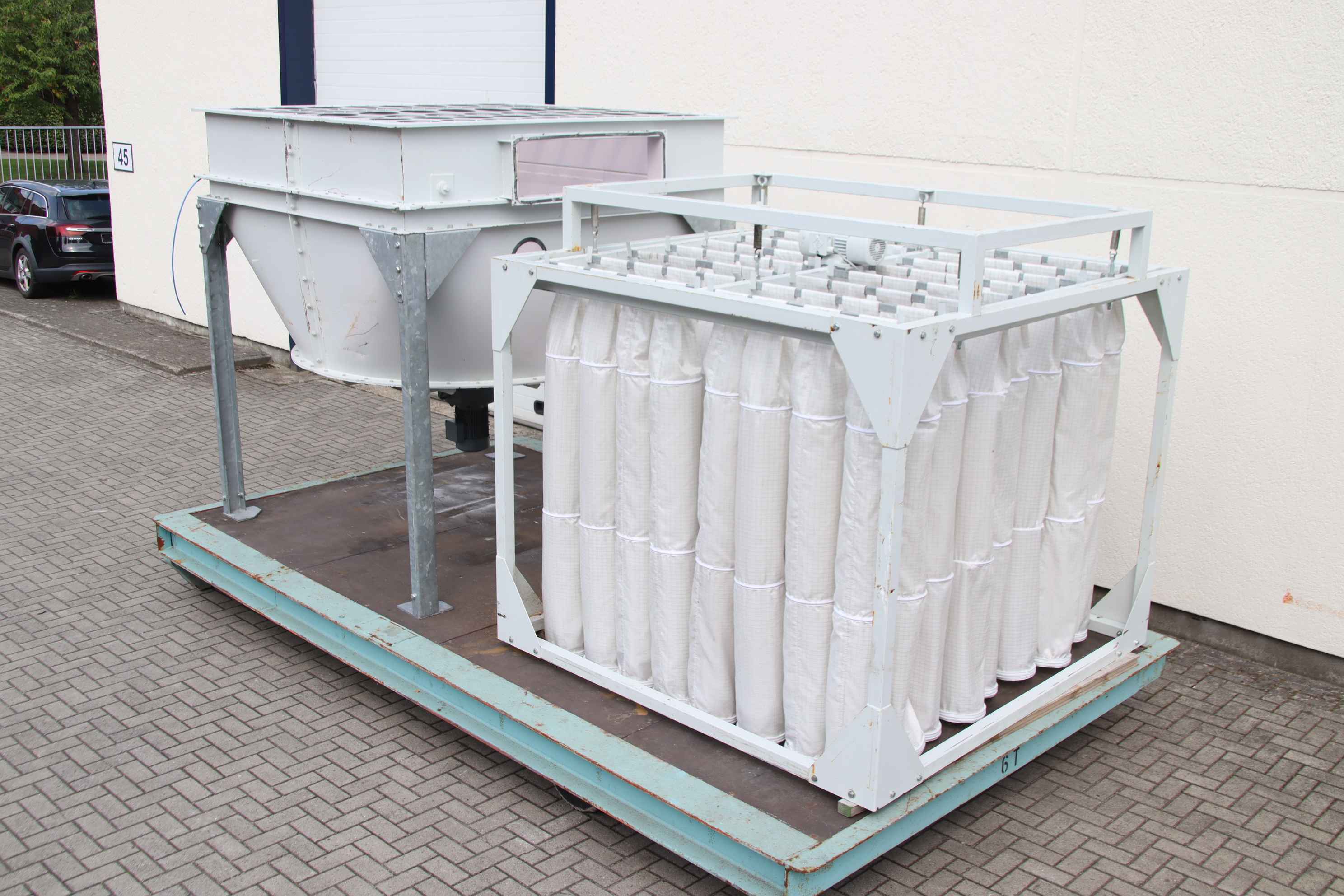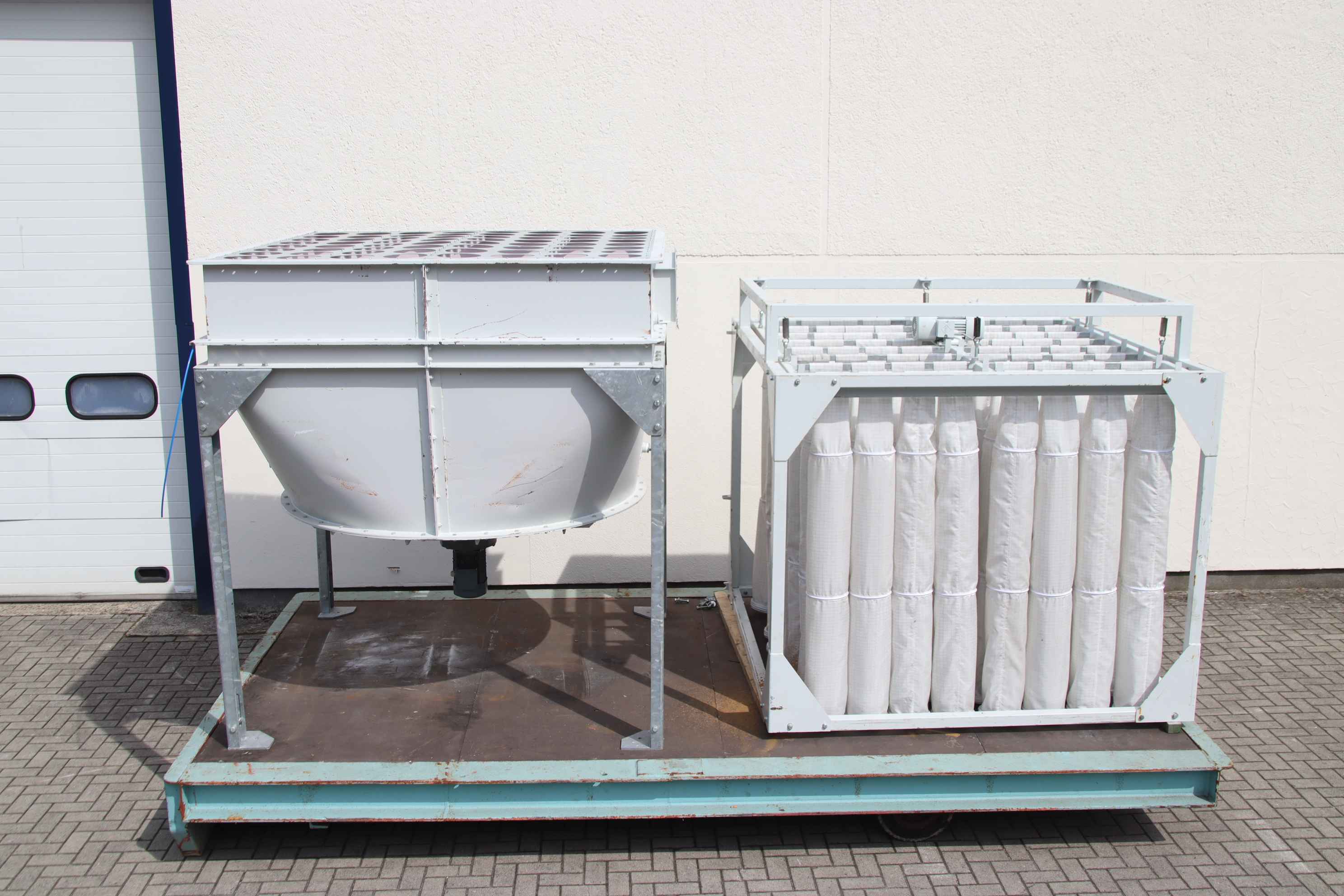 Dust extraction fan, extraction, dust blower, extraction system, dust blower, dust extraction device, separator, welding smoke filter, welding smoke extraction, smoke gas extraction fan, filter system, Cartridge dust extraction system -Filter system -Filter frame: 2135/2135/H2030 mm -Vibration motor: 0.55 kW -Funnel frame: 2100/2130/H2330 mm -Discharge gear motor: 2.2 kW 8.7 rpm -Opening: Ø 250 mm / 250 x 220 mm -Individual components: see photos, without extraction fan -Weight: 320 kg / 890 kg