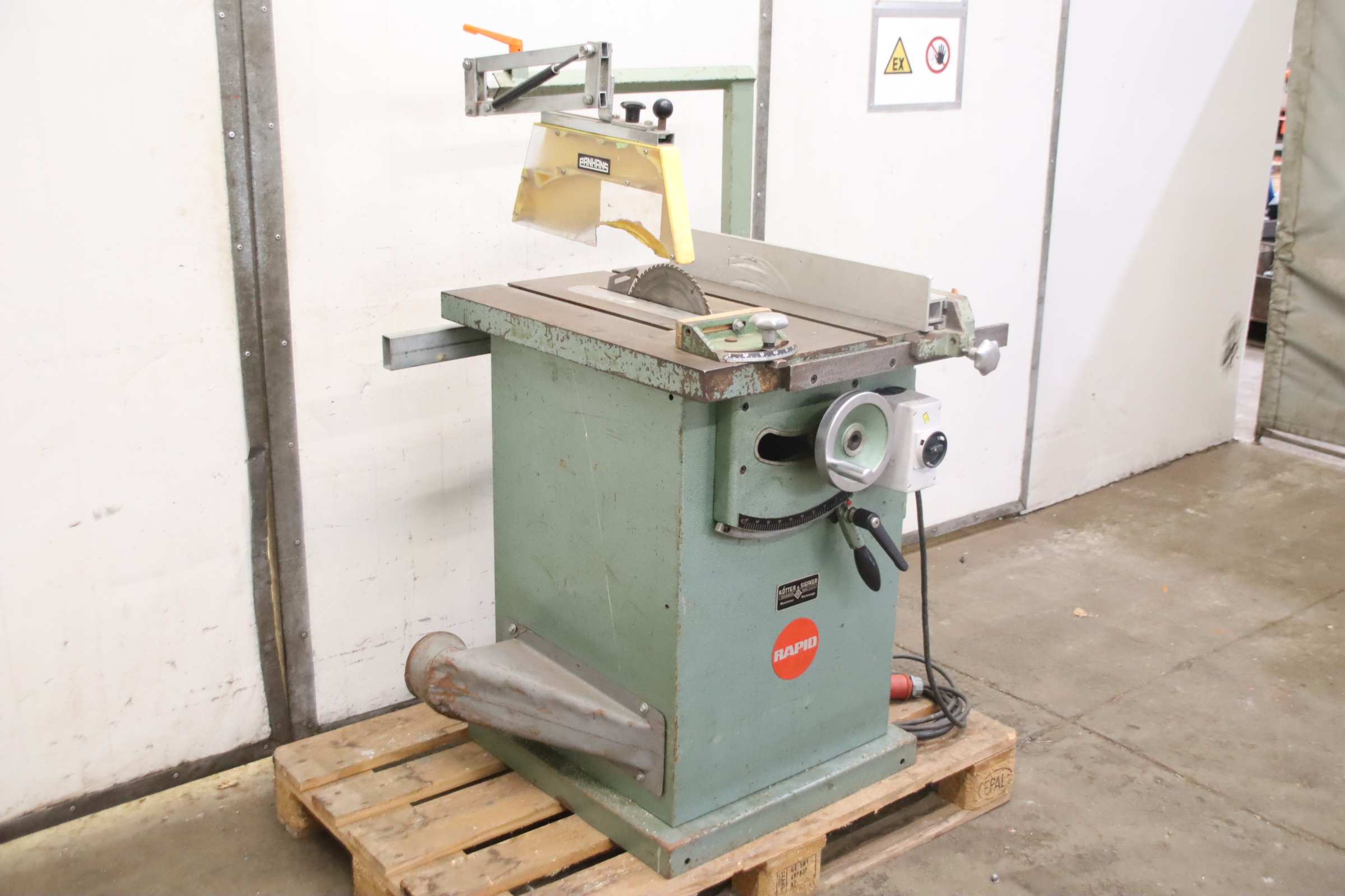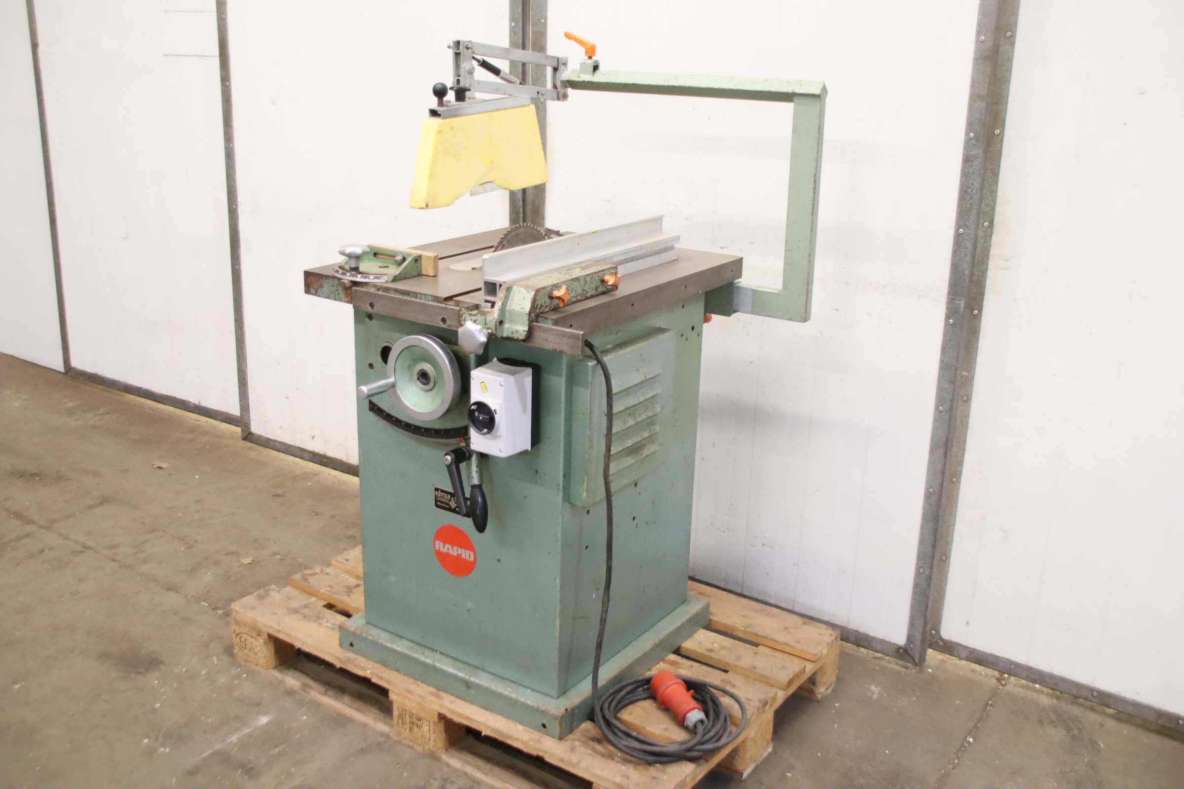 Underfloor sliding table saw, crosscut saw, sliding table saw, miter saw, panel saw, table saw, circular saw, precision circular saw -Manufacturer: Rapid, Table saw, Saw unit: swivels 45° -Type: Pk 100 -Motor power: 2.5 kW / 2850 rpm -Saw blade: Ø 250 mm, (max. Ø 300 mm) -Cutting height 75 mm with saw blade Ø 250 mm (max. approx. 100 mm) -Cutting width: 350 mm -Miter cut: up to 45° -Dimensions 850/850/H1310 mm -Weight: 176 kg