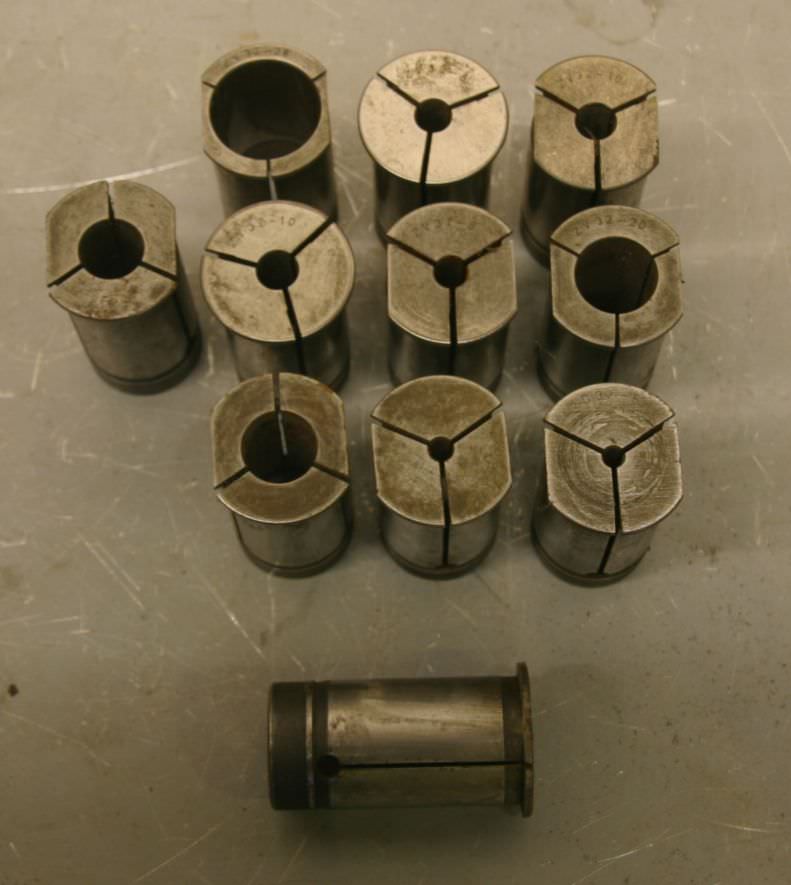 Collet sleeves, collet, tool holder, tool holder, milling chuck, milling tool, collet sleeves -Quantity: 11 collets -Various sizes -Hole: Ø 5-28 mm -Length: 64 mm -Shaft: Ø 32 mm -Recess: Ø 38 mm -Sale: only as a package -Weight 2 kg