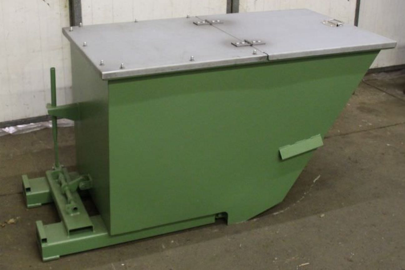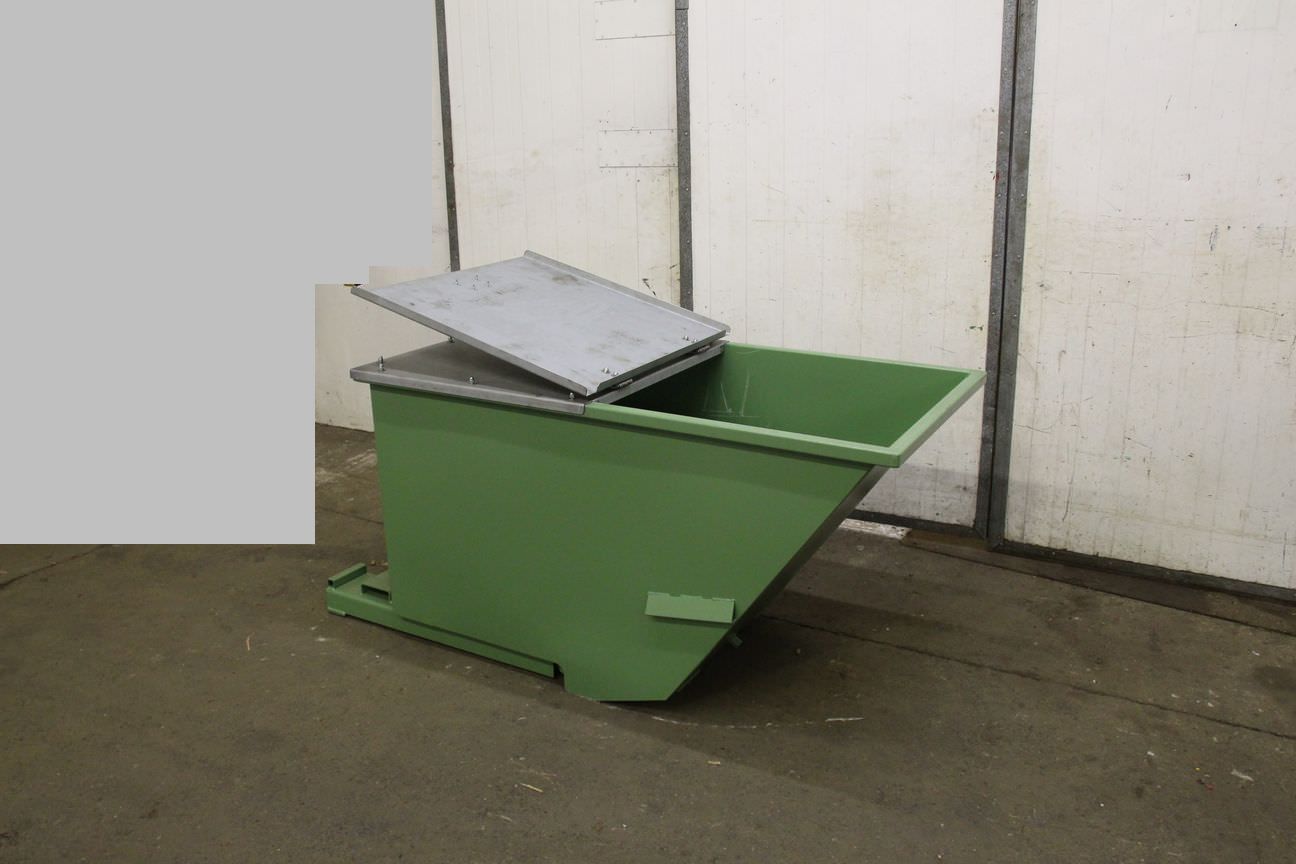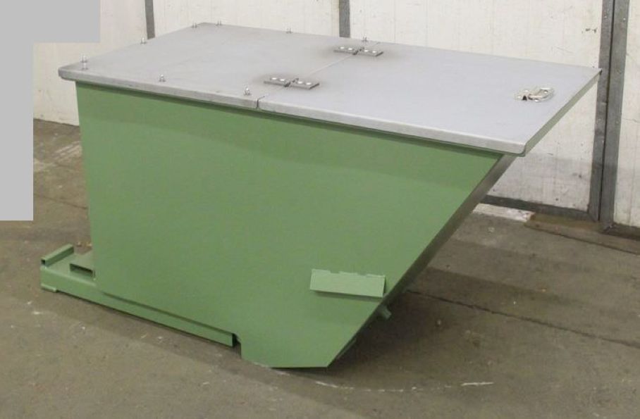 Forklift tipping container, tipping container, tipping trough, forklift tipping, waste tipping container, scrap tipping container-Condition: New -with steel lid: made of galvanized sheet -Content: 0.8 m³ -Intake: for forklift tines -Max. Tine width: 150 mm -with tilt mechanism -Storage: stackable -Corrosion protection: powder coated -Dimensions: L /W/H 1750/750/870 mm -Number: several available -Price: per pieces -Own weight: 200 kg
