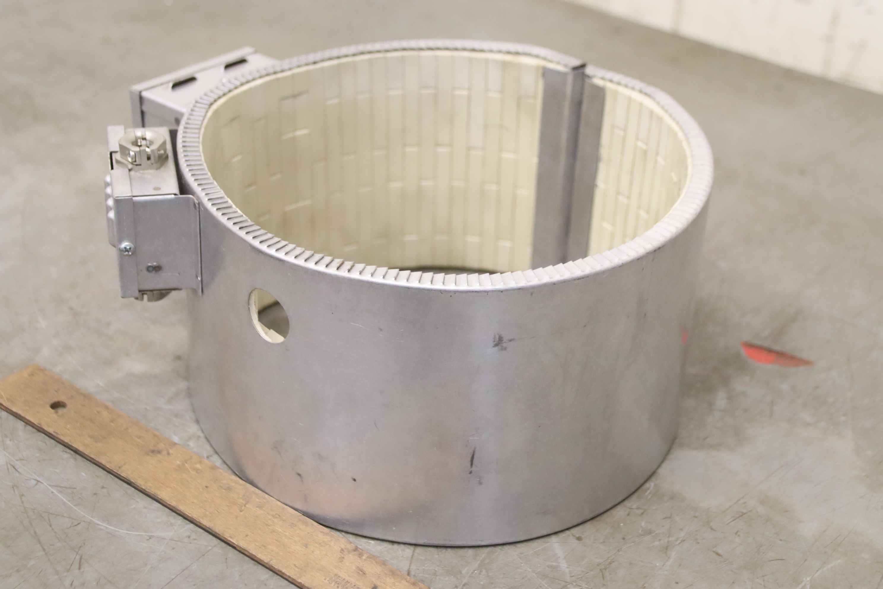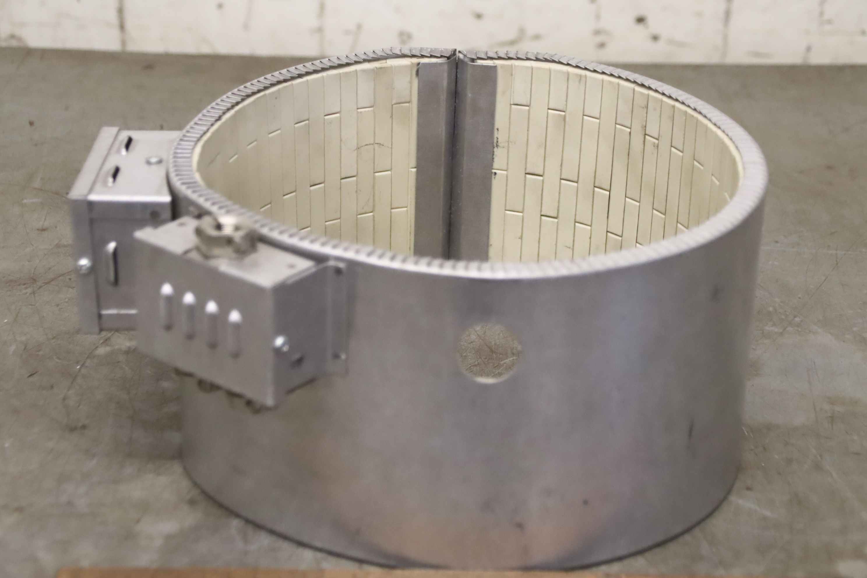 Tubular heater, heating tape, heating sleeve, mica heater, cylinder heater, heating cylinder, ceramic heating tape-Manufacturer: Krauss Maffei, heating tape heating collar-Type: Ø200 x 160 mm-Item No.: 401 7184-Heating power: 5500 W-Voltage: 230/400V-Number: 1x heating tape available-Price per piece-Dimensions: 310/255/H160 mm-Weight: 4.0 kg