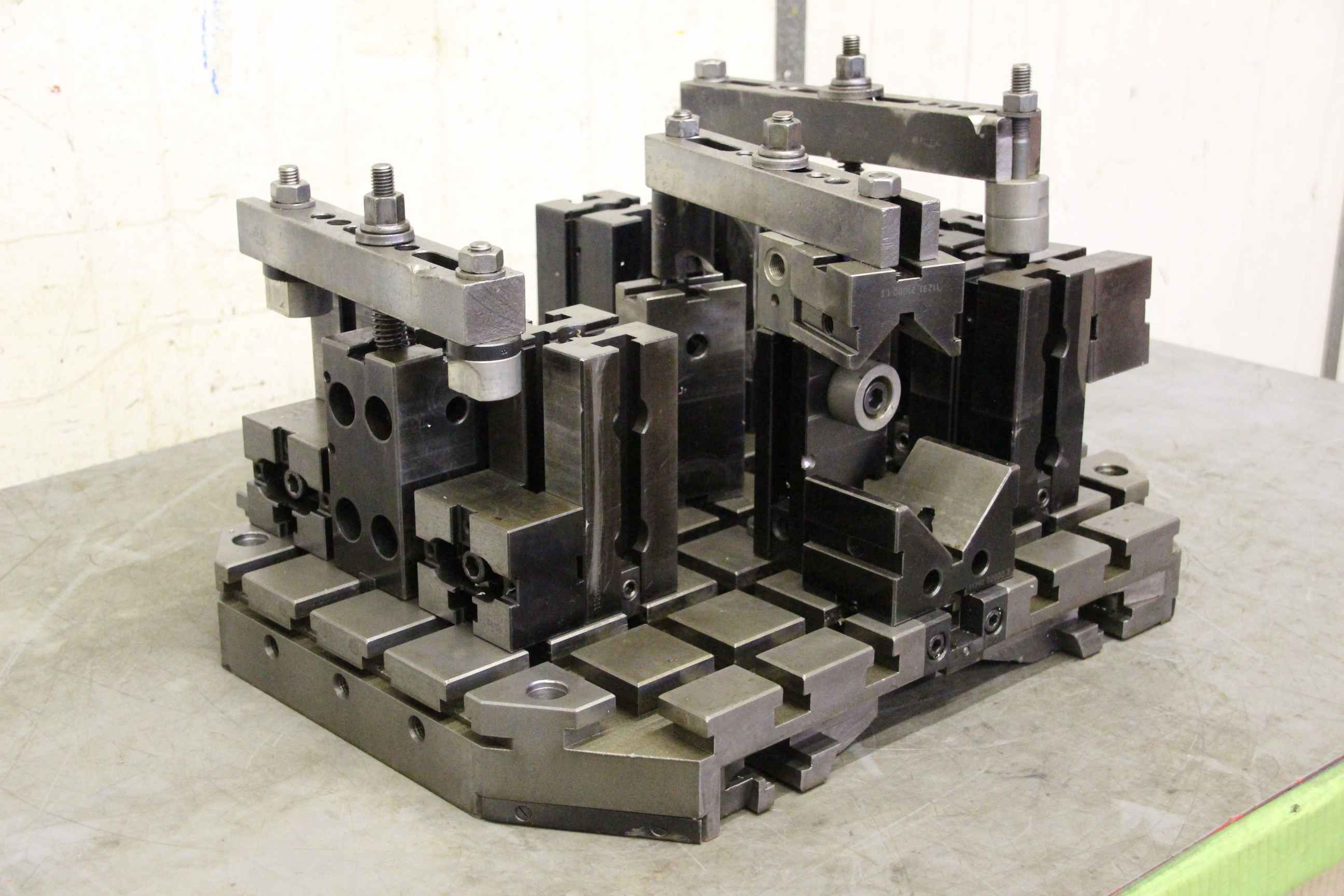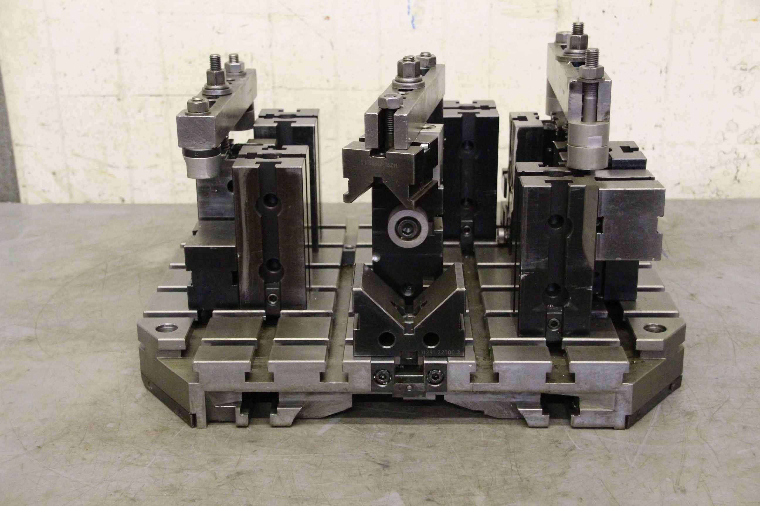 Clamping plate with T-slots and cross table, plate field, welding table, welding table, plate boring machine, T-slot plate, pallet changer, pallet changing system -Clamping plate: with T-slots and clamping devices, comes from a CNC machining center -Width: 500 mm -Length: 400 mm -Groove width: 14 mm -Groove spacing: 65 mm -Dimensions: see technical drawing in the photos -Clamping devices: see photos -Dimensions total: 400/500/H315 mm -Weight: 111 kg