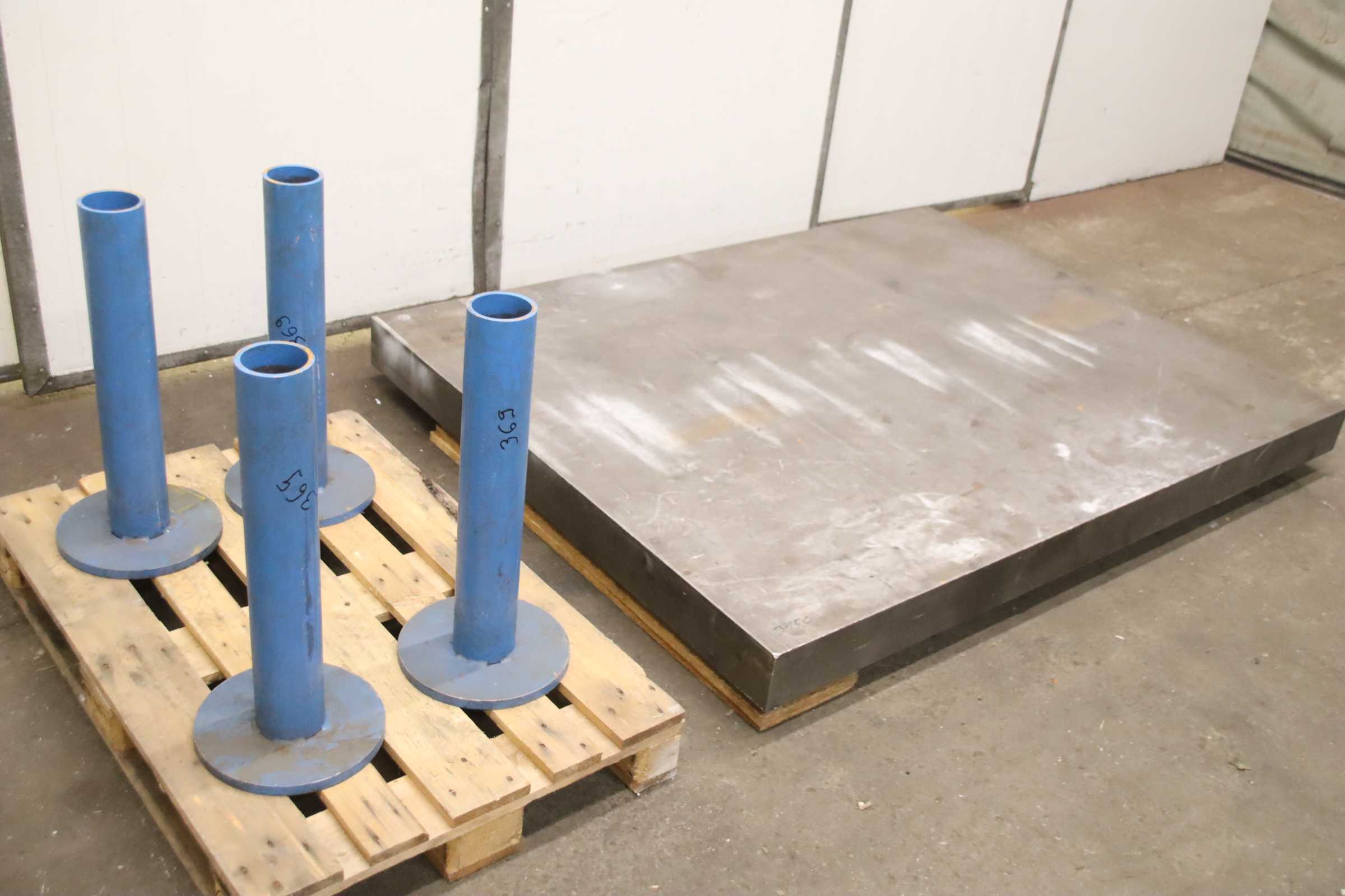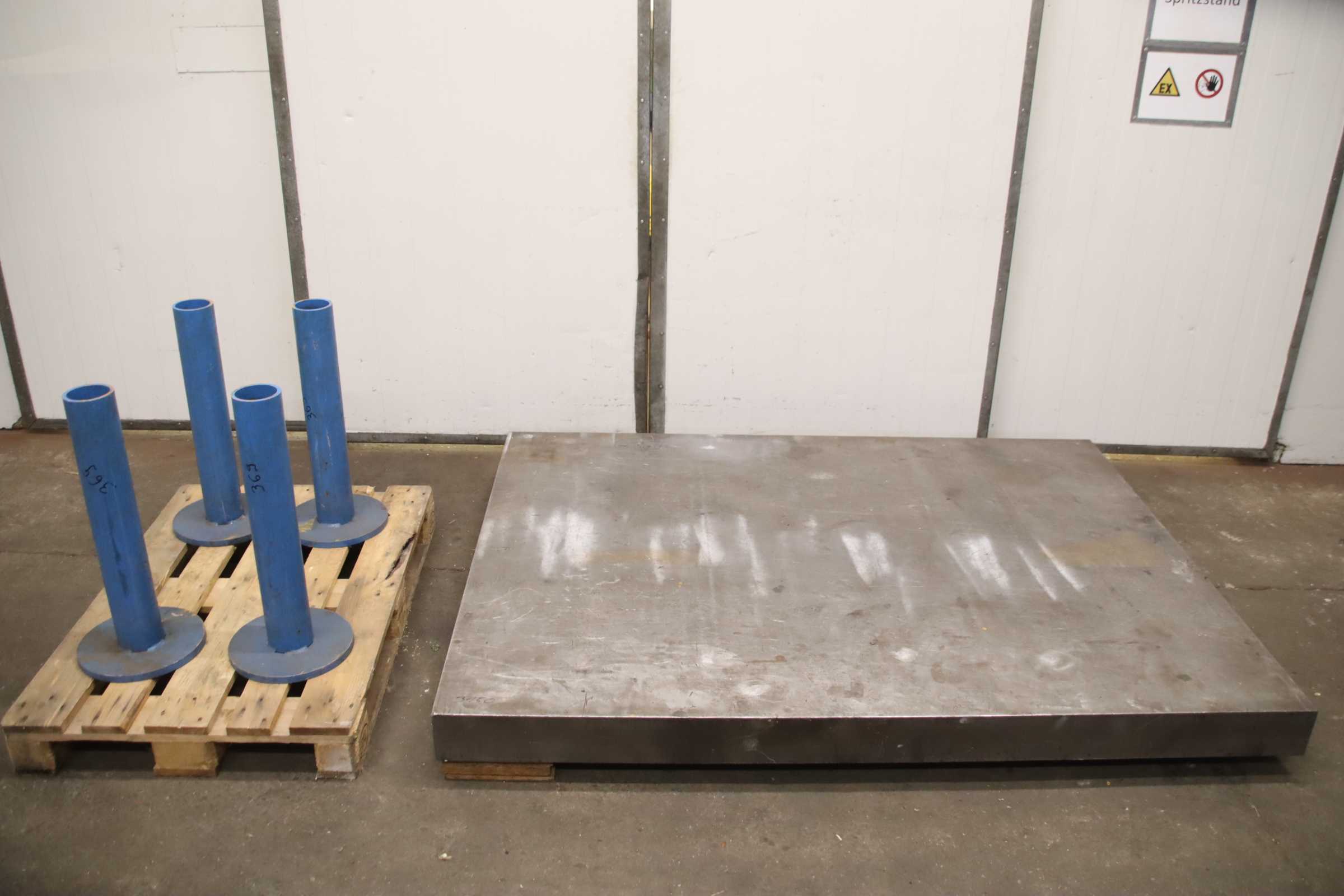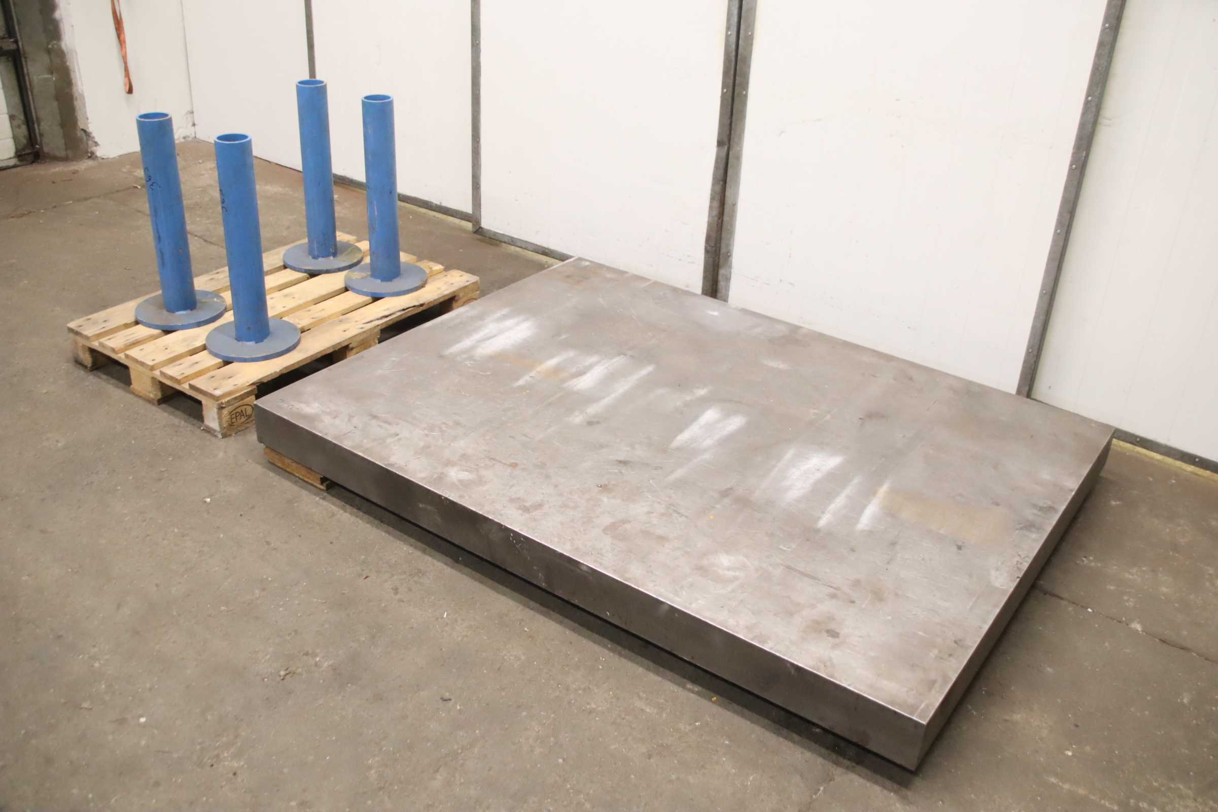 Clamping plate, marking plate, measuring plate, measuring table, straightening plate, marking plate -Clamping plate: surface plate with adjustable feet -Length: 2000 mm -Width: 1515 mm -Plate thickness: 130 mm -Adjustable feet: Ø 300 x 670 mm -Transport dimensions: 2000/1515/H430 mm -Weight: 3150 kg