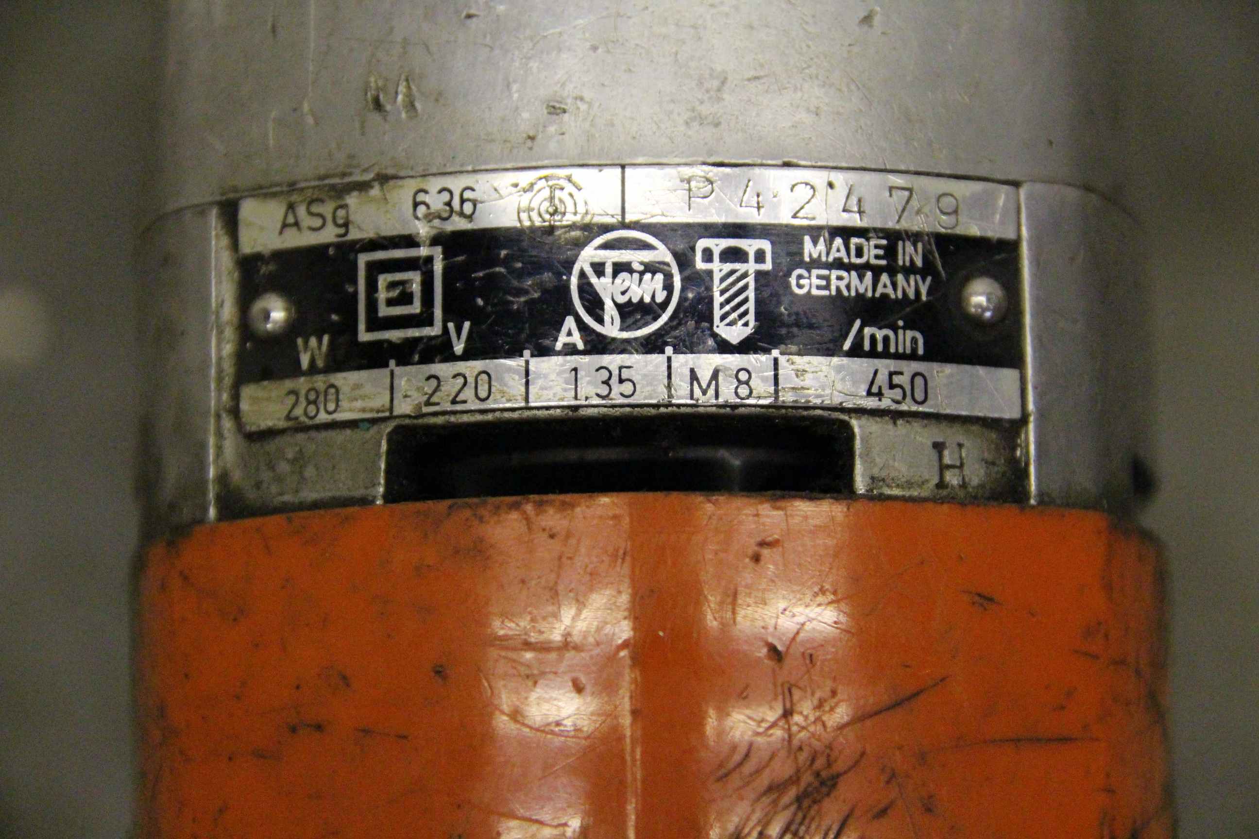 Thread cutter, thread cutting machine, thread drilling machine -Manufacturer: Fein, Threading machine type ASg 636 -Nominal input: 280 watts -Max. cutting capacity: M8 -Speed: 450 rpm -Connection: 220 volts -Quantity: 2x tap drill available Price: per piece -Dimensions: 330/150/H80 mm -Weight: 2.3 kg