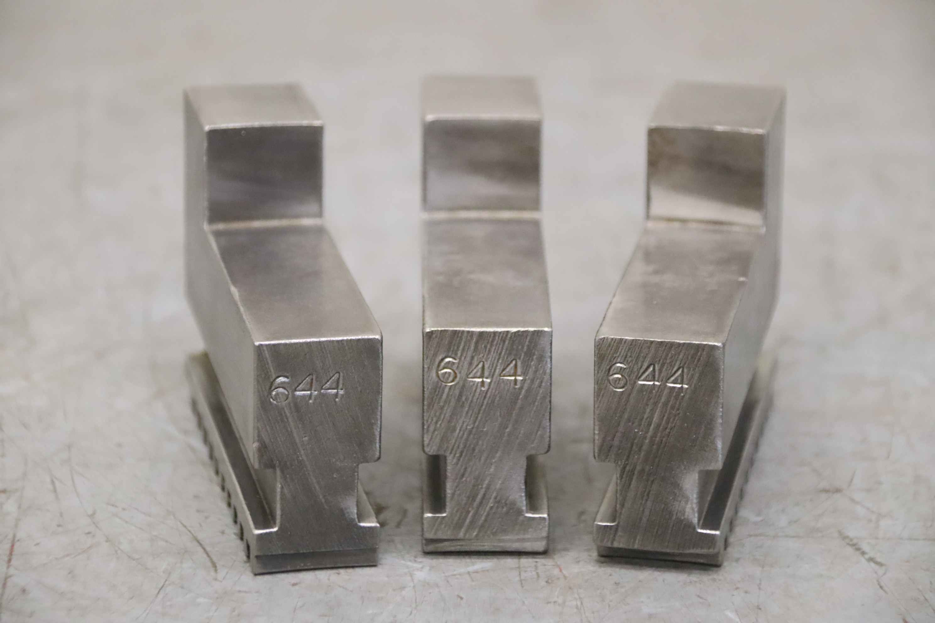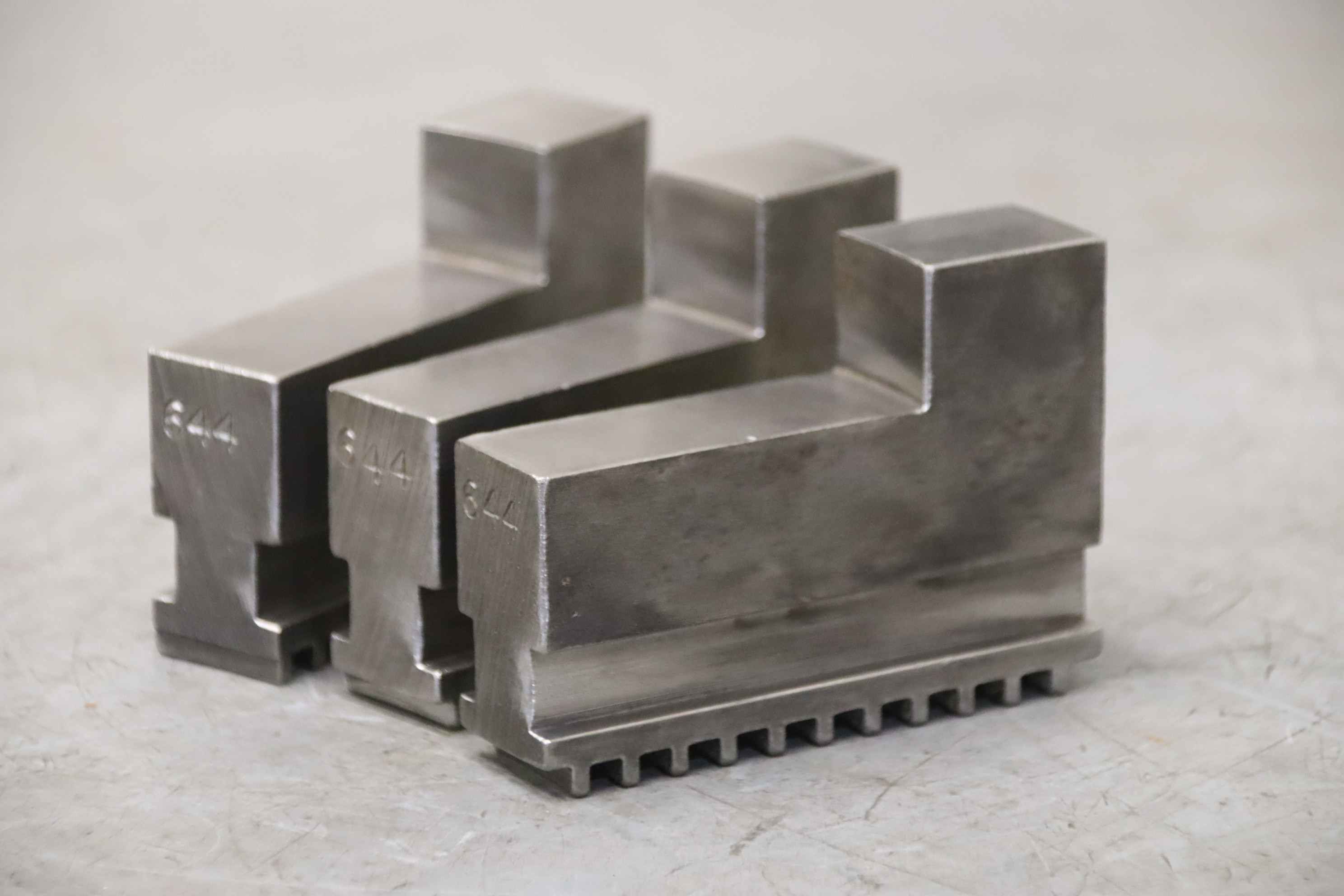 Interchangeable jaws, top jaws, three-jaw chucks, segment jaws, clamping jaws, step block jaws, step top jaws, block jaws, base jaws-Top jaws: Jaw set for three-jaw lathe chucks, soft-Jaw width: 24 mm-Dimensions: see photo technical. drawing-Total dimensions: 95/73/H68 mm-Total weight: 2,4 kg