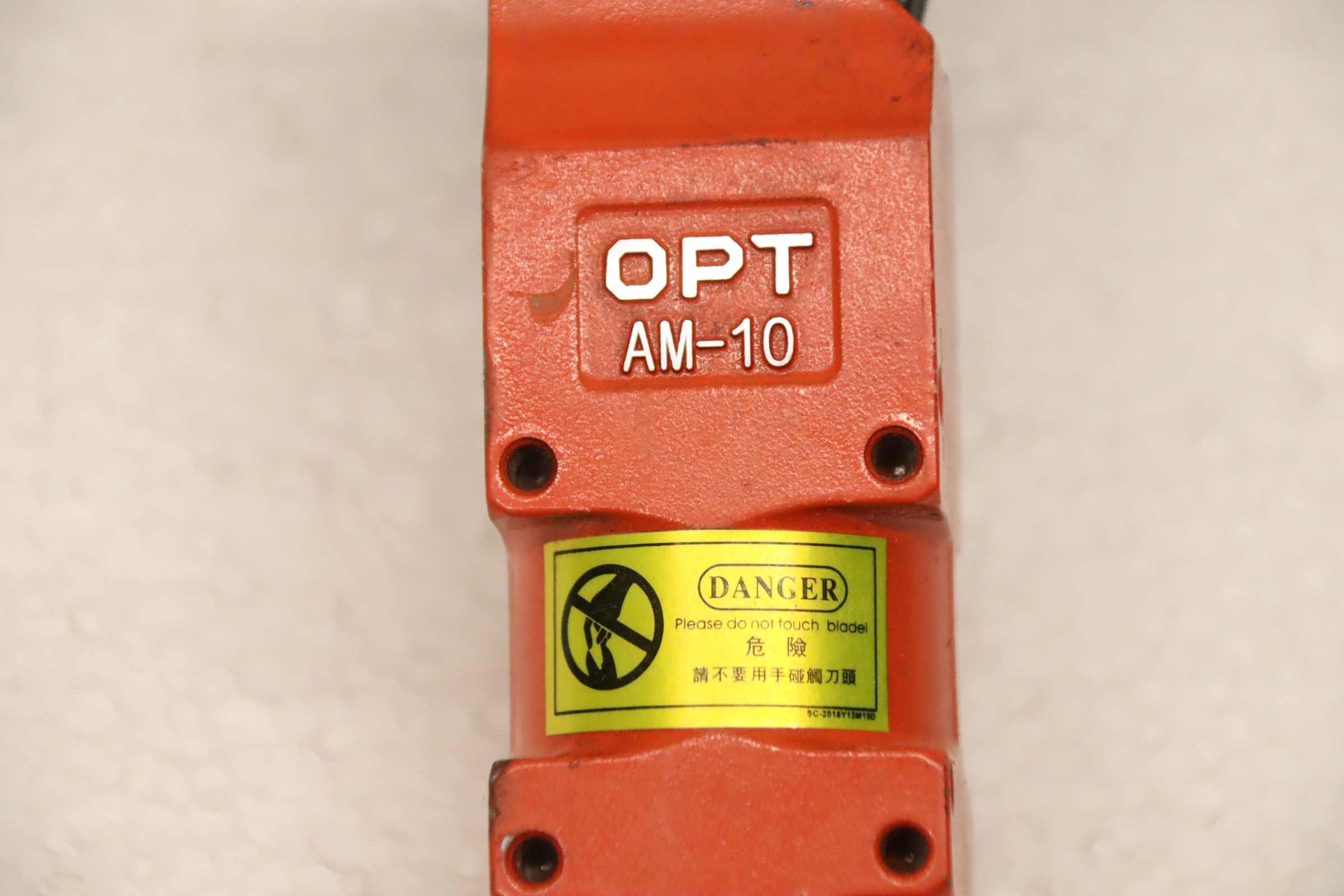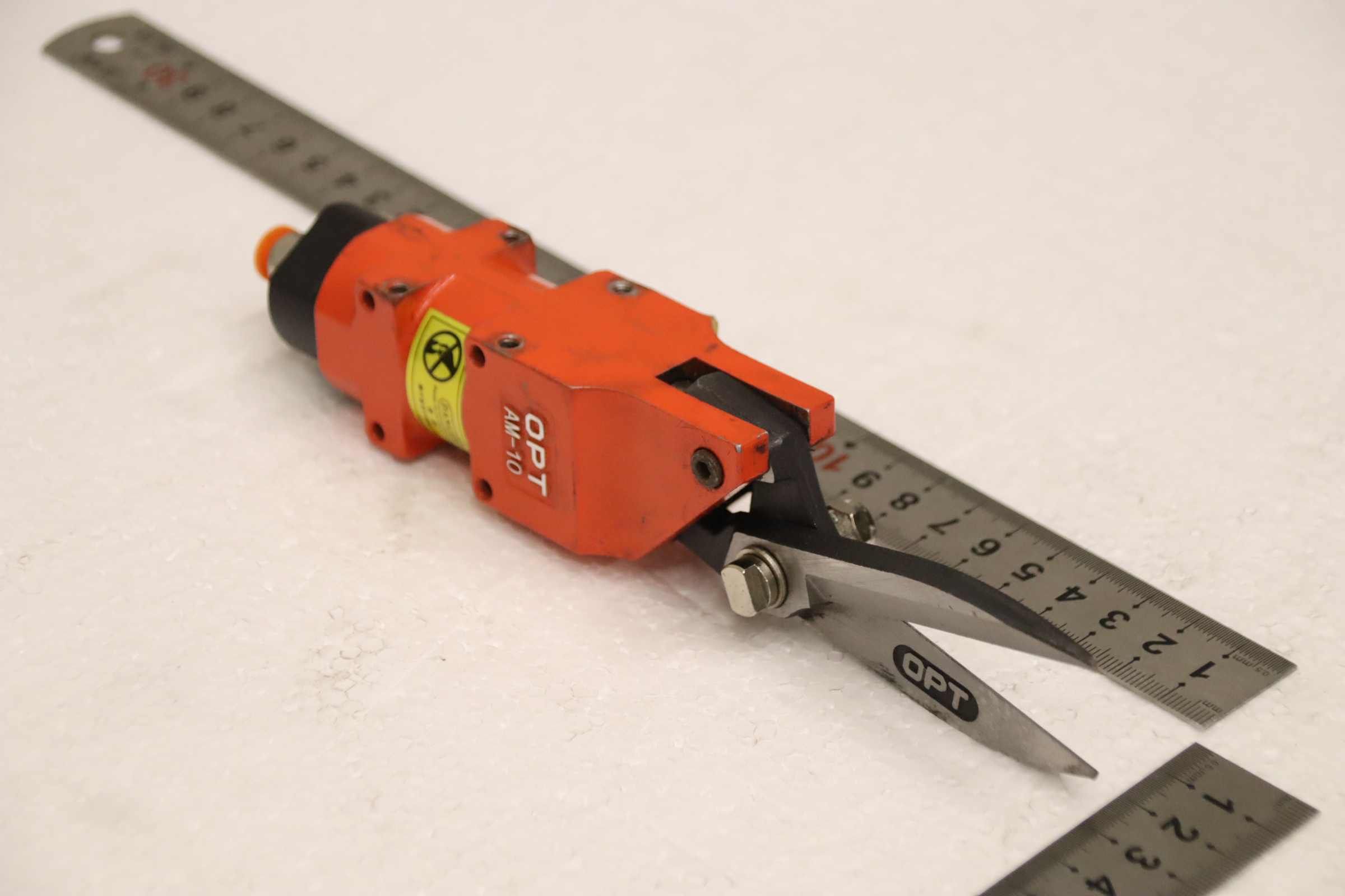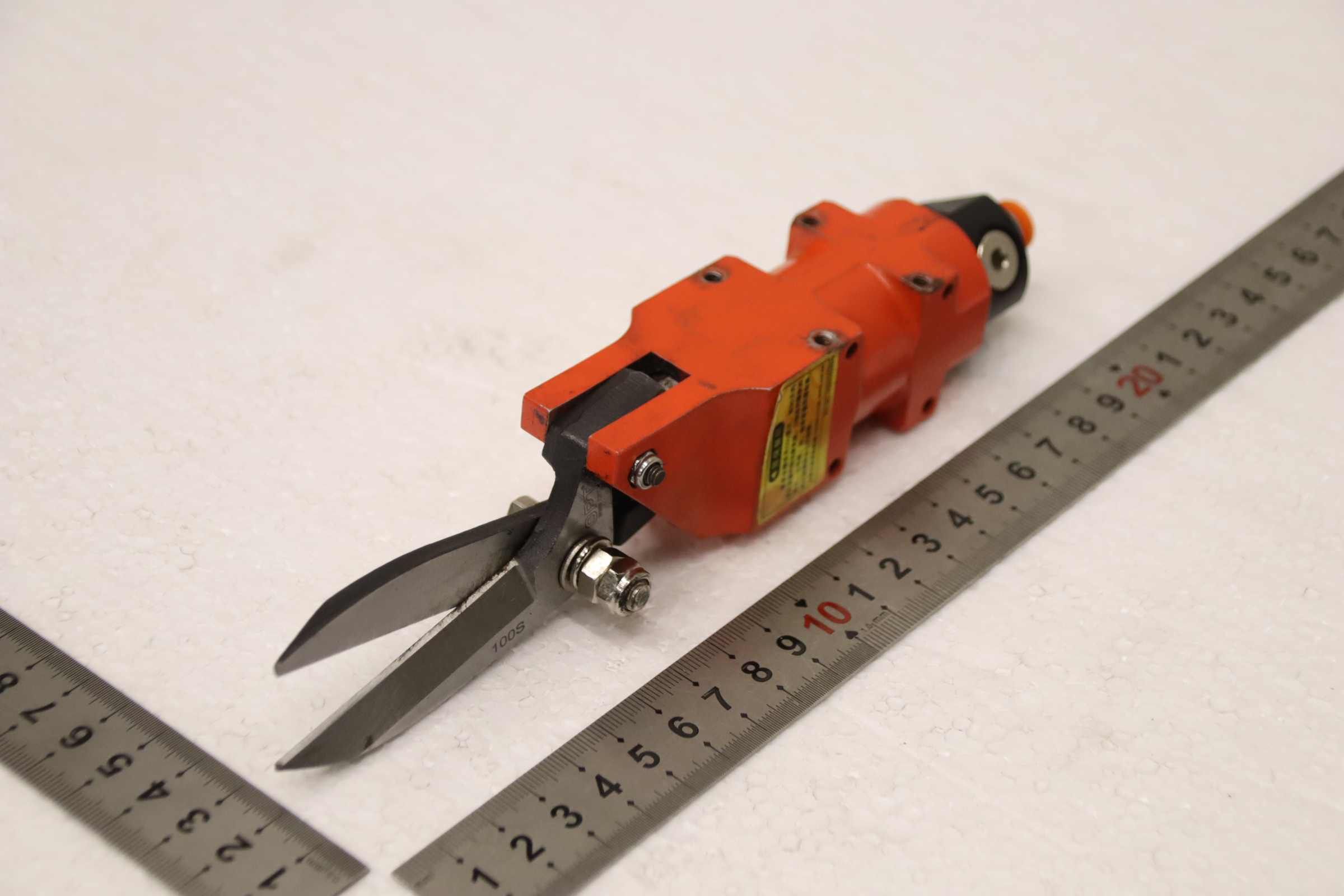 Scissors, pneumatic scissors, air cutters, wire cutting scissors -Manufacturer: OPT, Air cutter, Pneumatic wire cutting shears from face mask machine -Type: AM-10 -Cutting blades: 100S / Cutting length approx. 46 mm, see photo -Quantity: 2 pairs of scissors available -Price: per piece -Overall dimensions: 210/35/H45 mm -Weight: 0.3 kg/pc.